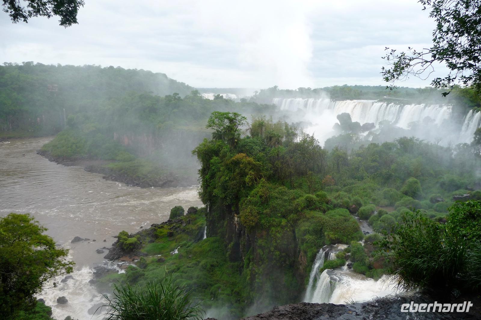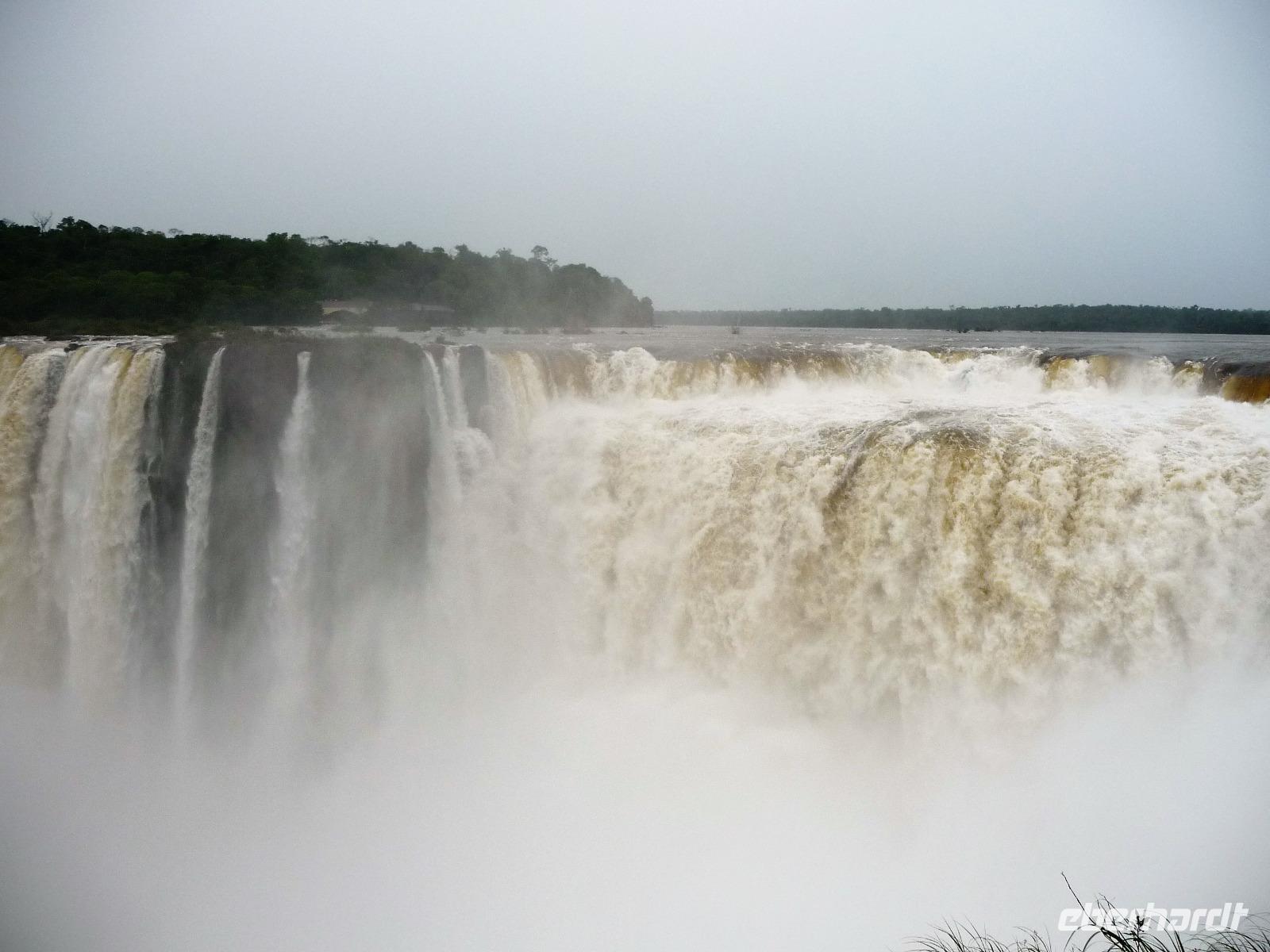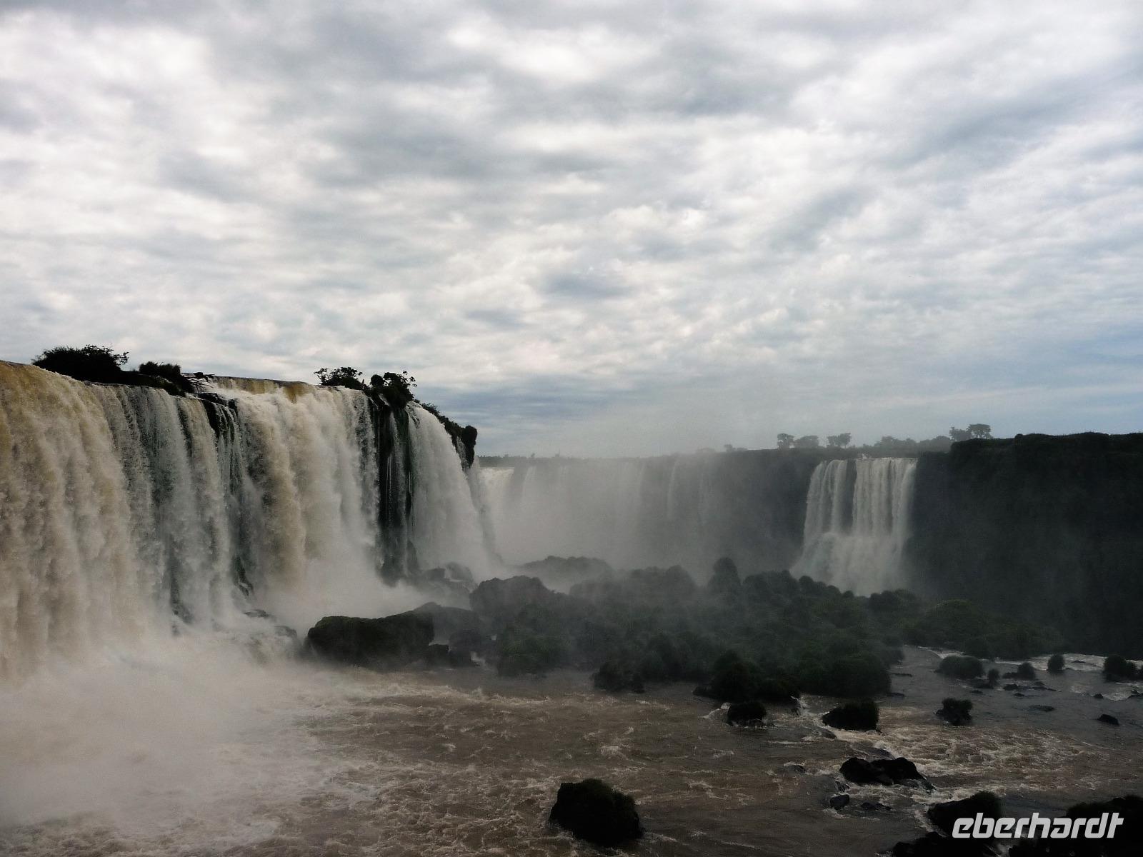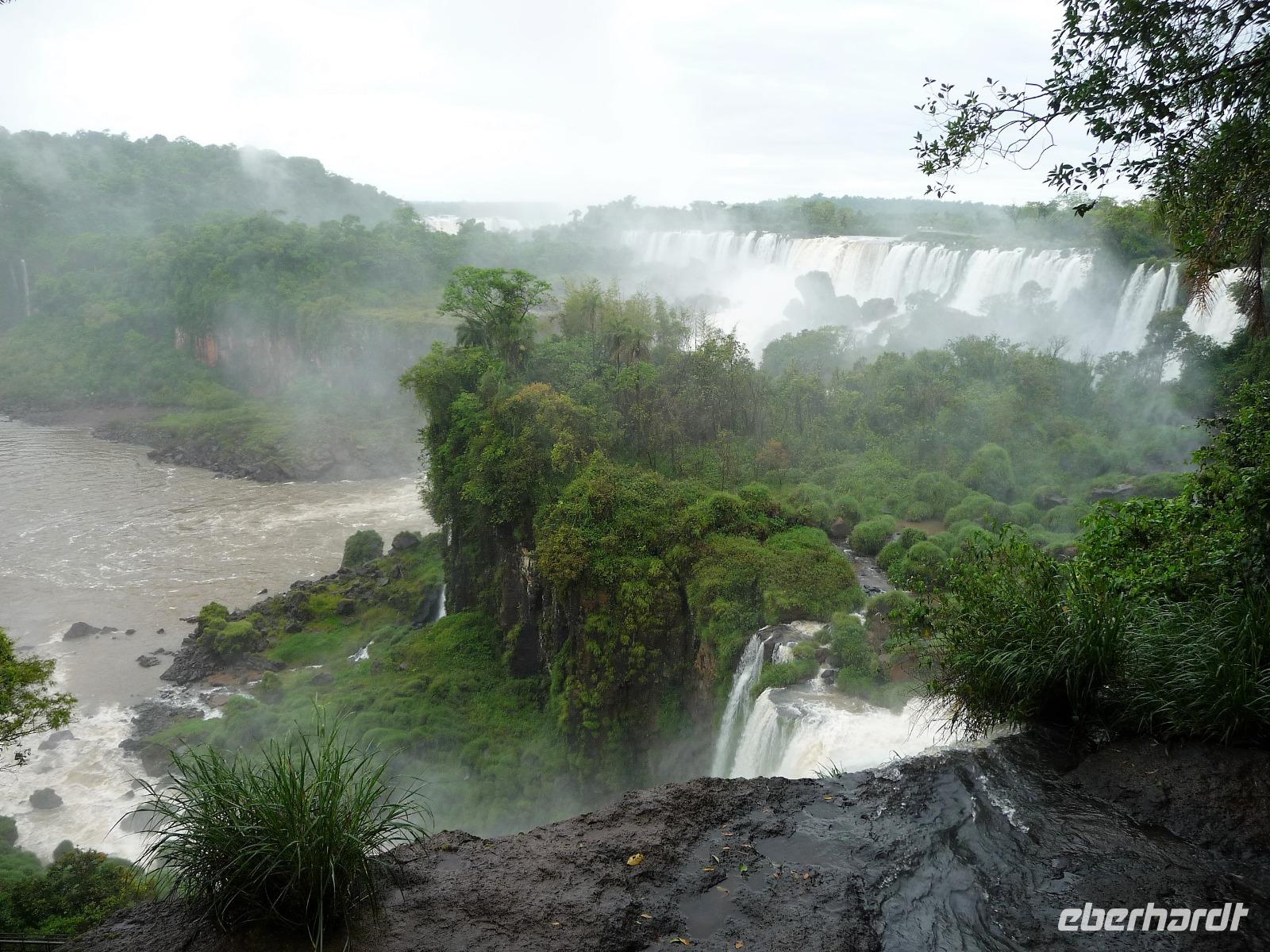 Da es am Vortag so heiß war, hatten wir unseren Ausflug auf die argentinische Seite der Wasserfälle vorverlegt und starteten bereits zeitig, um die Mittagshitze und die eventuellen Warteschlagen an der Grenze möglichst zu umgehen. Bereits in der Nacht gab es heftige Regenfälle und Hitzegewitter und der Regen sollte uns auch noch einen Teil des Tages begleiten. Aber wir waren gespannt, welche der Seite - die brasilianische oder die argentinische Seite - denn nun die schönere sein sollte. Unproblematisch konnten wir ohne viel Wartezeit die Grenze überqueren und waren schon einige Minuten vor der Öffnung des Parks am Eingang. Immer wieder bekräftigten wir unsere Zuversicht, dass es bestimmt ganz bald mit dem Regen aufhören würde. Man muss einfach nur Geduld haben! Mit dem kleinen Bummelzug fuhren wir bis zur Endstation und machten uns auf den Weg zum "Garganta del Diablo", dem "Teufelsschlund". Welch ein Tosen hörten wir bereits von der Ferne. Noch konnten wir uns nicht vorstellen, vor welchen Wassermassen wir gleich stehen würden. Immer näher kam das Donnern des Wassers und dann eröffnete sich ein gigantischer Ausblick. Durch den vielen Regen in den letzten Stunden, war der Iguazufluss schnell angeschwollen und entsprechend hoch war die Wassermenge, die sich über die Fälle ergoß. Fasziniert rückte man immer näher an die Absperrungen und vergaß regelrecht, dass man - wenn es denn möglich war - durch die Gischt noch nasser wurde. Aber egal, ein gigantisches Erlebnis, dass man so schnell nicht wieder haben sollte. Ein ganz anderes Erlebnis war dann der Rundweg. Hier sahen wir die Iguazu-Fälle nochmal in ganz anderen Perspektiven und endlich lichteten sich auch die dunklen Wolken und die ersten Sonnenstrahlen des Tages durchbrachen den Regen. Gleich machte es doppelt so viel Freude, die immer neuen Aussichtspunkte zu genießen. Wir waren uns einig: der richtige und passende Abschluss unserer Reise! Am Nachmittag plünderten wir nochmal das Büffet des kleinen Restaurants vom Vortag, kauften ein paar letzte Souvenirs, spazierten nochmal den kleinen Rundweg des Hotels bis zum Aussichtspunkt und trafen uns nochmal am Pool. Gemütlich ging der Tag nach dem Abendessen bei einem letzten Drink in der Bar des Hotels zu Ende.
