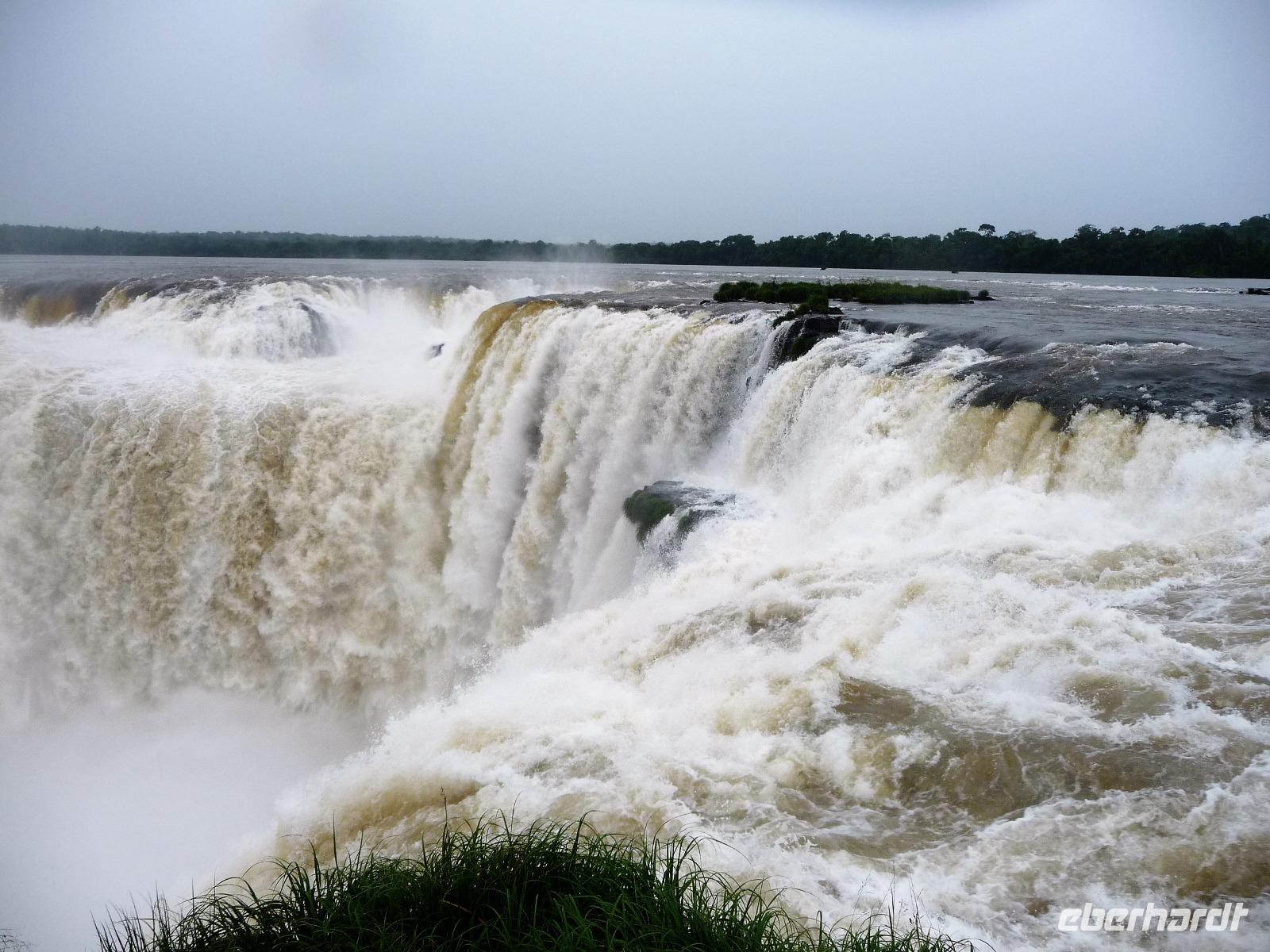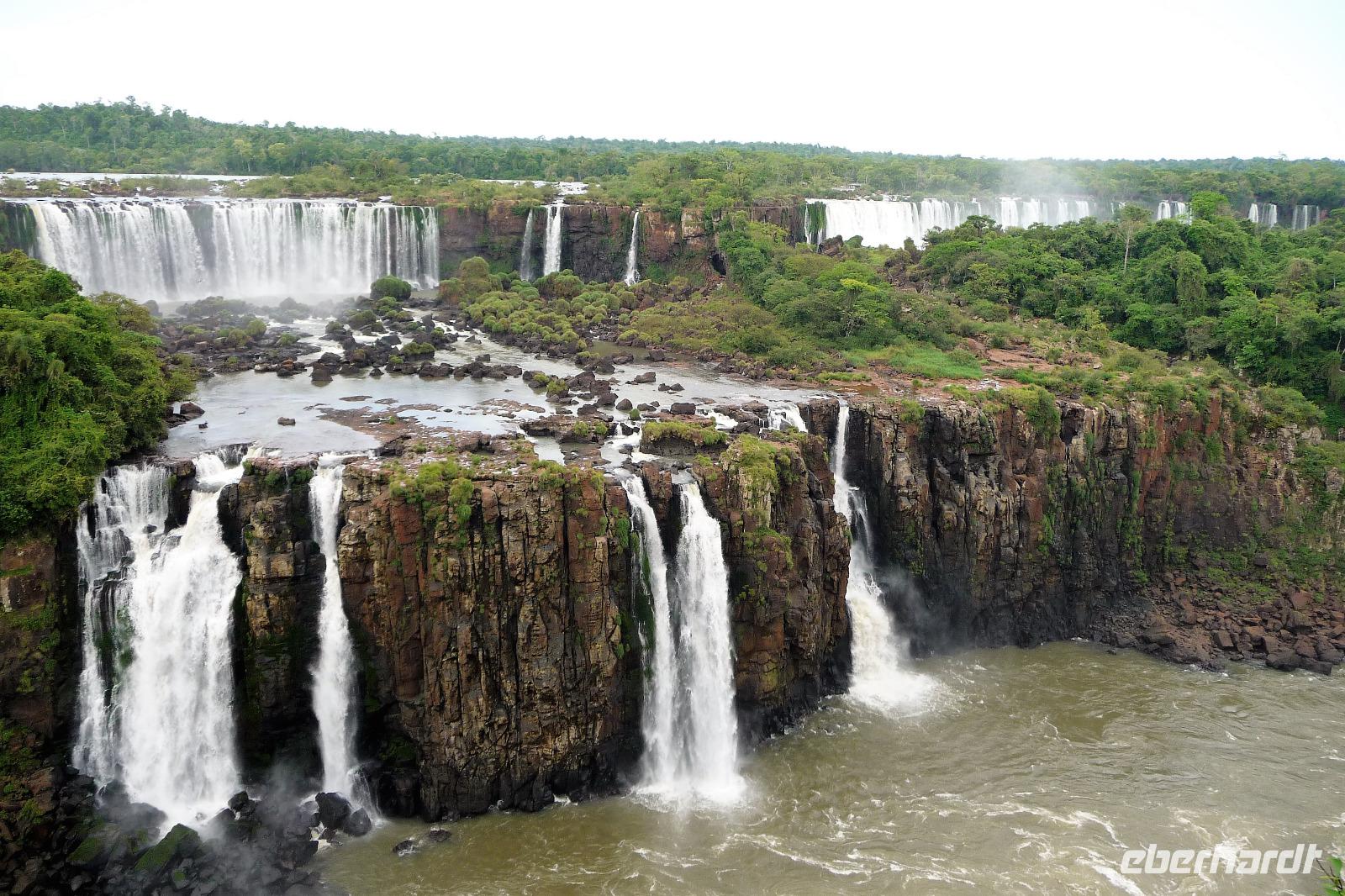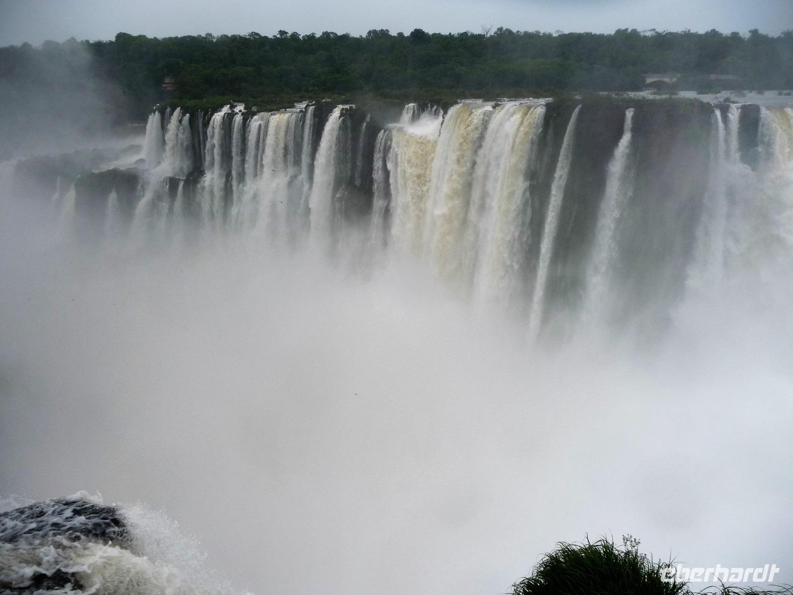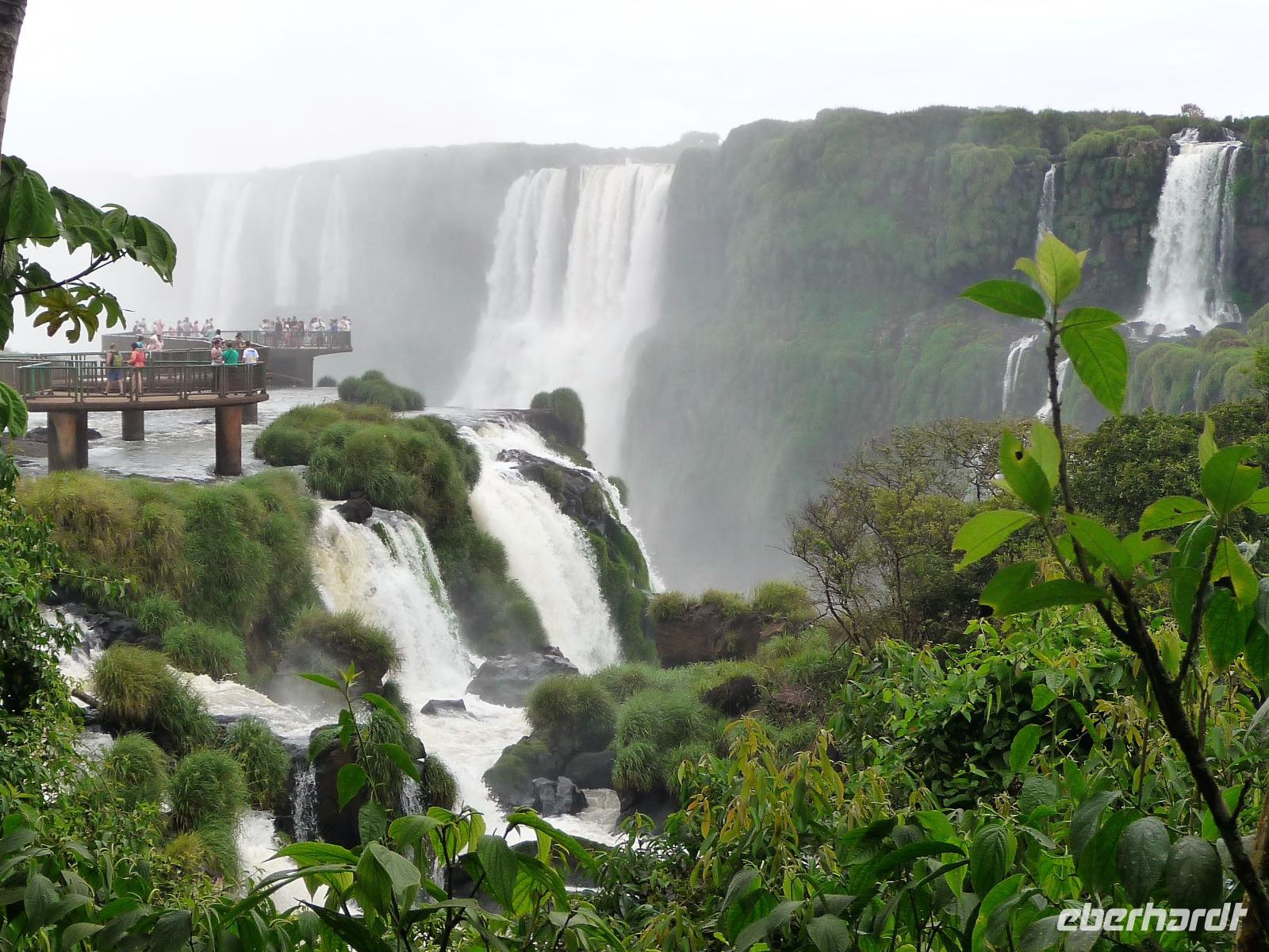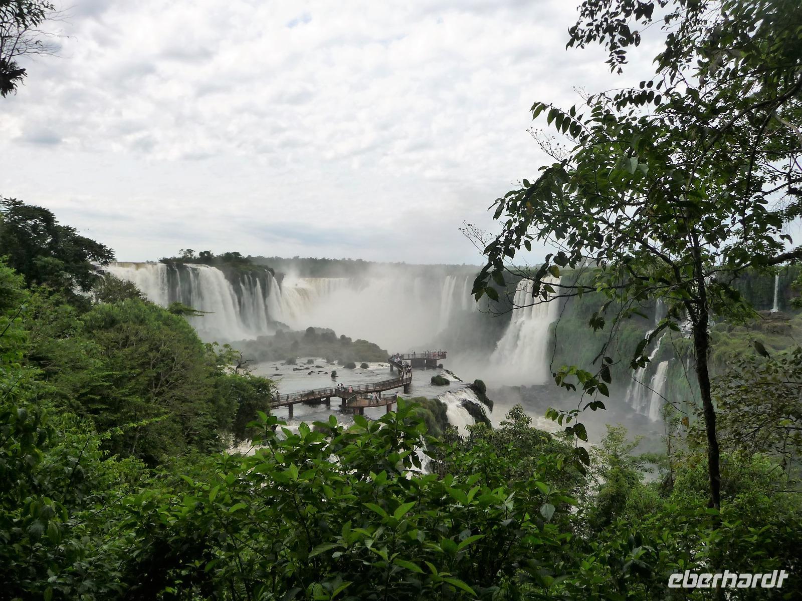 Da es am Vortag so heiß war, hatten wir unseren Ausflug auf die argentinische Seite der Wasserfälle vorverlegt und starteten bereits zeitig, um die Mittagshitze und die eventuellen Warteschlagen an der Grenze möglichst zu umgehen. Bereits in der Nacht gab es heftige Regenfälle und Hitzegewitter und der Regen sollte uns auch noch einen Teil des Tages begleiten. Aber wir waren gespannt, welche der Seite - die brasilianische oder die argentinische Seite - denn nun die schönere sein sollte. Unproblematisch konnten wir ohne viel Wartezeit die Grenze überqueren und waren schon einige Minuten vor der Öffnung des Parks am Eingang. Immer wieder bekräftigten wir unsere Zuversicht, dass es bestimmt ganz bald mit dem Regen aufhören würde. Man muss einfach nur Geduld haben! Mit dem kleinen Bummelzug fuhren wir bis zur Endstation und machten uns auf den Weg zum "Garganta del Diablo", dem "Teufelsschlund". Welch ein Tosen hörten wir bereits von der Ferne. Noch konnten wir uns nicht vorstellen, vor welchen Wassermassen wir gleich stehen würden. Immer näher kam das Donnern des Wassers und dann eröffnete sich ein gigantischer Ausblick. Durch den vielen Regen in den letzten Stunden, war der Iguazufluss schnell angeschwollen und entsprechend hoch war die Wassermenge, die sich über die Fälle ergoß. Fasziniert rückte man immer näher an die Absperrungen und vergaß regelrecht, dass man - wenn es denn möglich war - durch die Gischt noch nasser wurde. Aber egal, ein gigantisches Erlebnis, dass man so schnell nicht wieder haben sollte. Ein ganz anderes Erlebnis war dann der Rundweg. Hier sahen wir die Iguazu-Fälle nochmal in ganz anderen Perspektiven und endlich lichteten sich auch die dunklen Wolken und die ersten Sonnenstrahlen des Tages durchbrachen den Regen. Gleich machte es doppelt so viel Freude, die immer neuen Aussichtspunkte zu genießen. Wir waren uns einig: der richtige und passende Abschluss unserer Reise! Am Nachmittag plünderten wir nochmal das Büffet des kleinen Restaurants vom Vortag, kauften ein paar letzte Souvenirs, spazierten nochmal den kleinen Rundweg des Hotels bis zum Aussichtspunkt und trafen uns nochmal am Pool. Gemütlich ging der Tag nach dem Abendessen bei einem letzten Drink in der Bar des Hotels zu Ende.