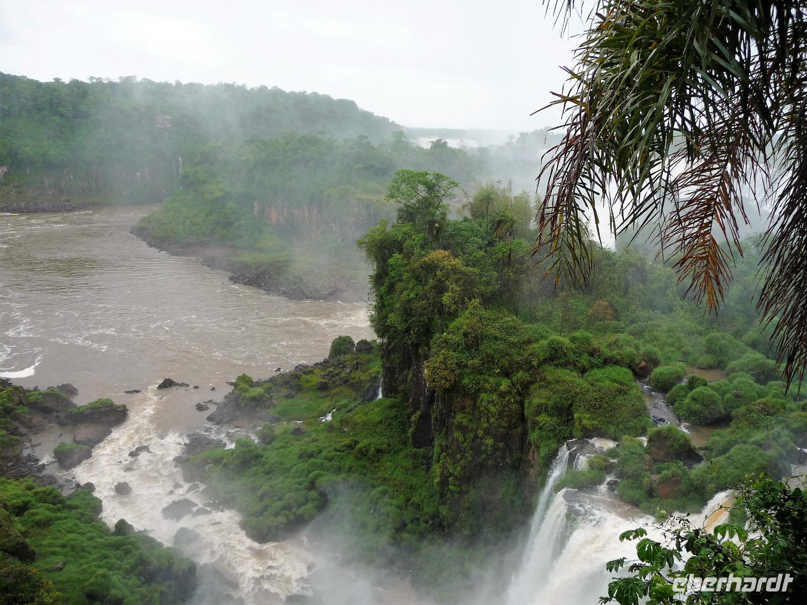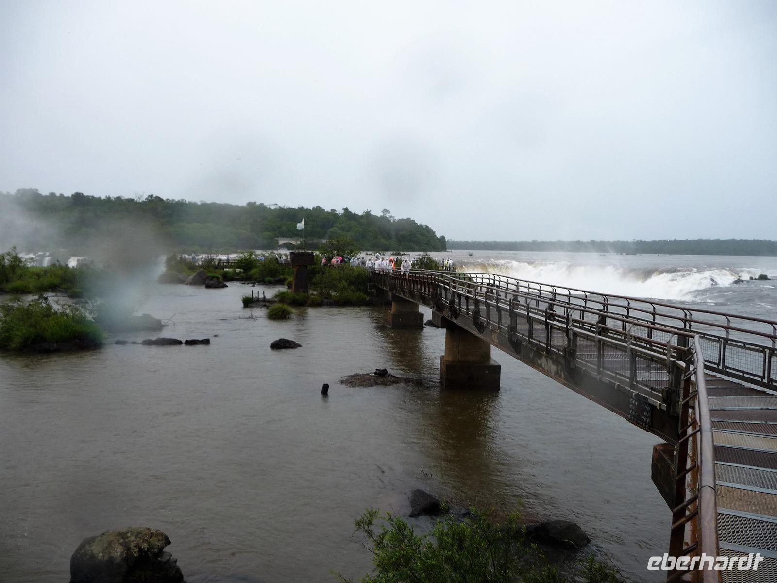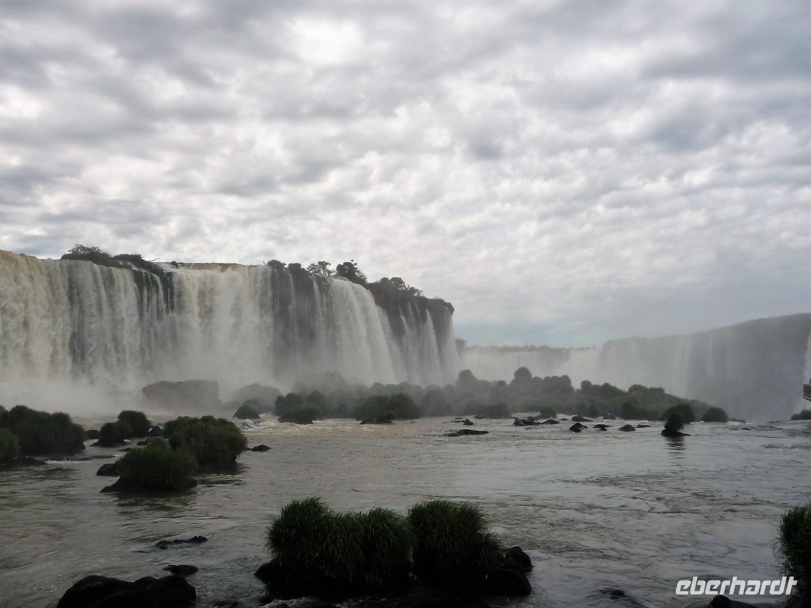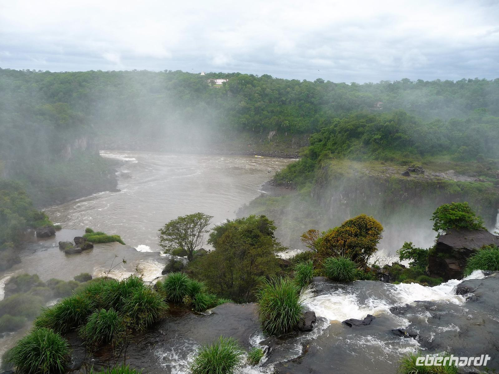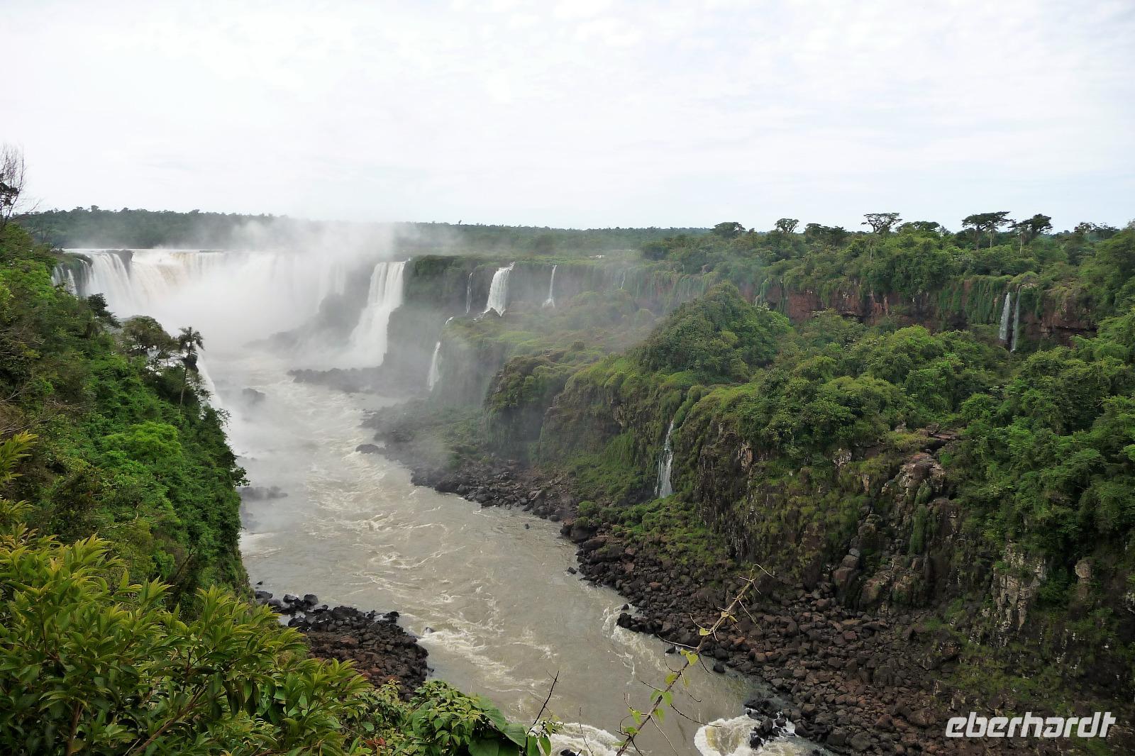 Da es am Vortag so heiß war, hatten wir unseren Ausflug auf die argentinische Seite der Wasserfälle vorverlegt und starteten bereits zeitig, um die Mittagshitze und die eventuellen Warteschlagen an der Grenze möglichst zu umgehen. Bereits in der Nacht gab es heftige Regenfälle und Hitzegewitter und der Regen sollte uns auch noch einen Teil des Tages begleiten. Aber wir waren gespannt, welche der Seite - die brasilianische oder die argentinische Seite - denn nun die schönere sein sollte. Unproblematisch konnten wir ohne viel Wartezeit die Grenze überqueren und waren schon einige Minuten vor der Öffnung des Parks am Eingang. Immer wieder bekräftigten wir unsere Zuversicht, dass es bestimmt ganz bald mit dem Regen aufhören würde. Man muss einfach nur Geduld haben! Mit dem kleinen Bummelzug fuhren wir bis zur Endstation und machten uns auf den Weg zum "Garganta del Diablo", dem "Teufelsschlund". Welch ein Tosen hörten wir bereits von der Ferne. Noch konnten wir uns nicht vorstellen, vor welchen Wassermassen wir gleich stehen würden. Immer näher kam das Donnern des Wassers und dann eröffnete sich ein gigantischer Ausblick. Durch den vielen Regen in den letzten Stunden, war der Iguazufluss schnell angeschwollen und entsprechend hoch war die Wassermenge, die sich über die Fälle ergoß. Fasziniert rückte man immer näher an die Absperrungen und vergaß regelrecht, dass man - wenn es denn möglich war - durch die Gischt noch nasser wurde. Aber egal, ein gigantisches Erlebnis, dass man so schnell nicht wieder haben sollte. Ein ganz anderes Erlebnis war dann der Rundweg. Hier sahen wir die Iguazu-Fälle nochmal in ganz anderen Perspektiven und endlich lichteten sich auch die dunklen Wolken und die ersten Sonnenstrahlen des Tages durchbrachen den Regen. Gleich machte es doppelt so viel Freude, die immer neuen Aussichtspunkte zu genießen. Wir waren uns einig: der richtige und passende Abschluss unserer Reise! Am Nachmittag plünderten wir nochmal das Büffet des kleinen Restaurants vom Vortag, kauften ein paar letzte Souvenirs, spazierten nochmal den kleinen Rundweg des Hotels bis zum Aussichtspunkt und trafen uns nochmal am Pool. Gemütlich ging der Tag nach dem Abendessen bei einem letzten Drink in der Bar des Hotels zu Ende.