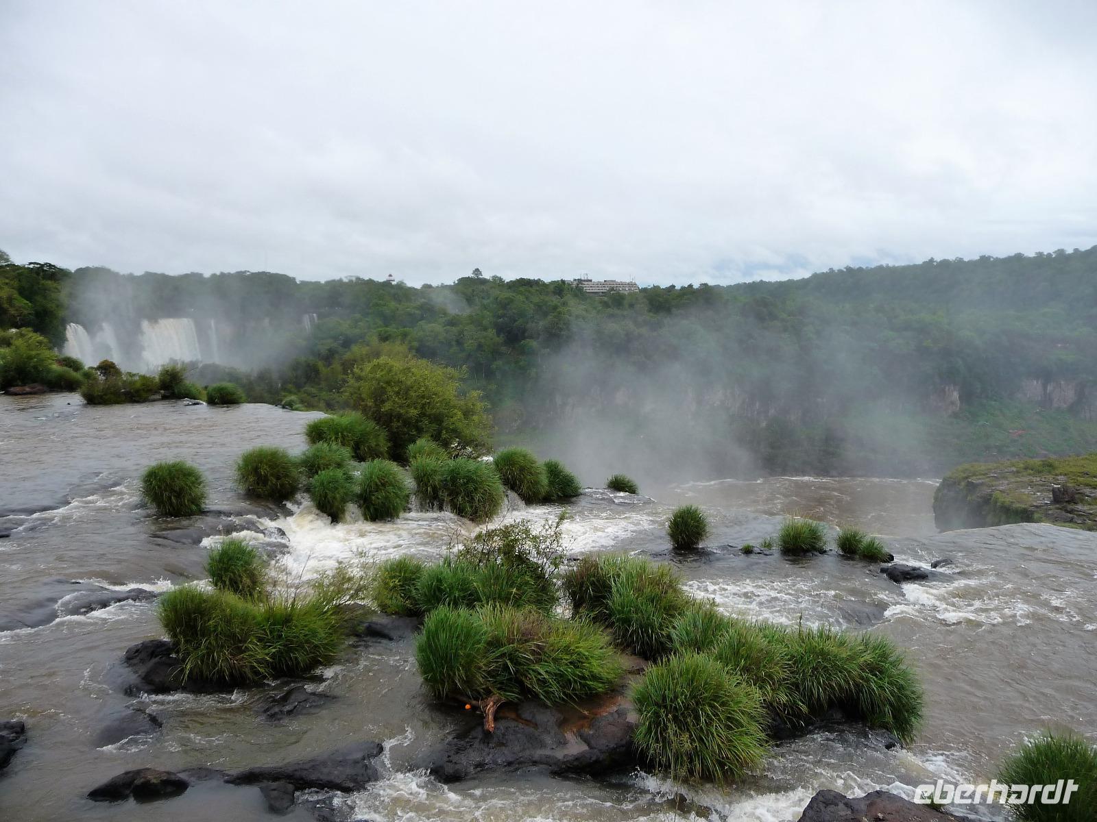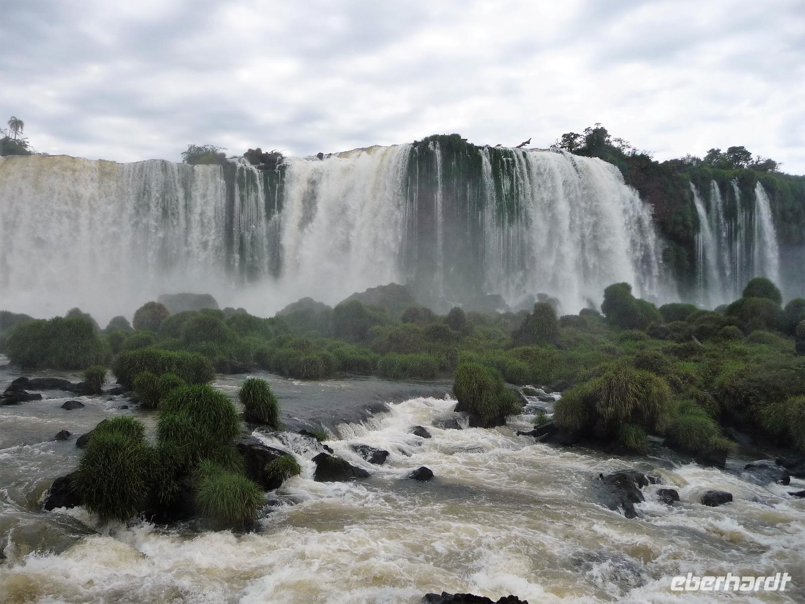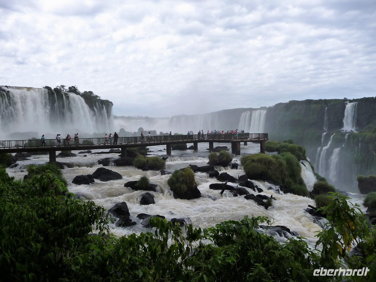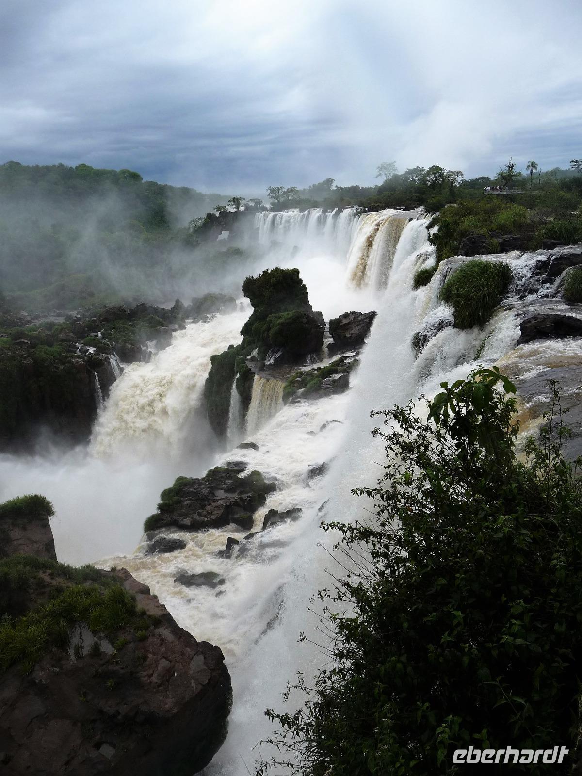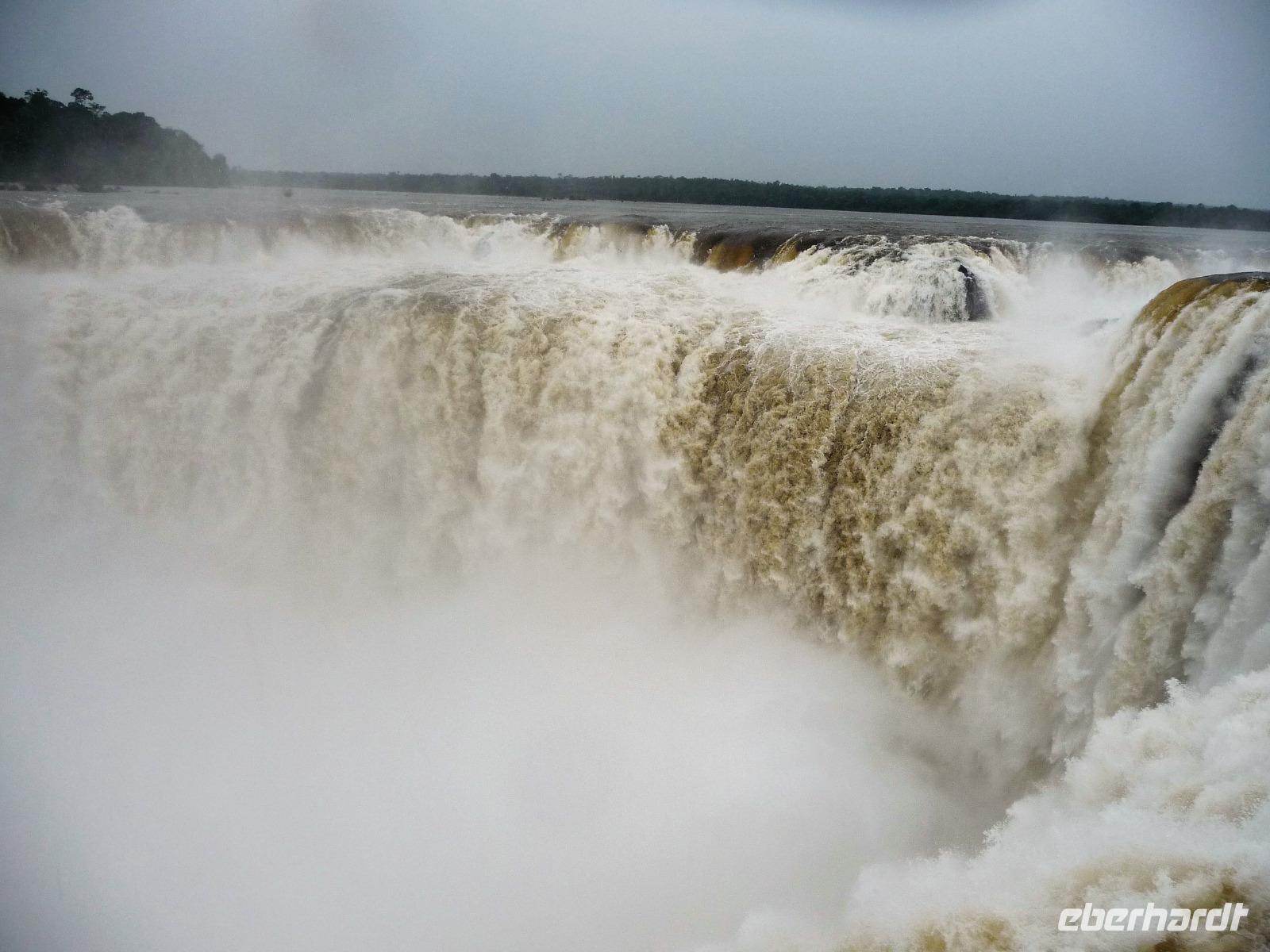 Da es am Vortag so heiß war, hatten wir unseren Ausflug auf die argentinische Seite der Wasserfälle vorverlegt und starteten bereits zeitig, um die Mittagshitze und die eventuellen Warteschlagen an der Grenze möglichst zu umgehen. Bereits in der Nacht gab es heftige Regenfälle und Hitzegewitter und der Regen sollte uns auch noch einen Teil des Tages begleiten. Aber wir waren gespannt, welche der Seite - die brasilianische oder die argentinische Seite - denn nun die schönere sein sollte. Unproblematisch konnten wir ohne viel Wartezeit die Grenze überqueren und waren schon einige Minuten vor der Öffnung des Parks am Eingang. Immer wieder bekräftigten wir unsere Zuversicht, dass es bestimmt ganz bald mit dem Regen aufhören würde. Man muss einfach nur Geduld haben! Mit dem kleinen Bummelzug fuhren wir bis zur Endstation und machten uns auf den Weg zum "Garganta del Diablo", dem "Teufelsschlund". Welch ein Tosen hörten wir bereits von der Ferne. Noch konnten wir uns nicht vorstellen, vor welchen Wassermassen wir gleich stehen würden. Immer näher kam das Donnern des Wassers und dann eröffnete sich ein gigantischer Ausblick. Durch den vielen Regen in den letzten Stunden, war der Iguazufluss schnell angeschwollen und entsprechend hoch war die Wassermenge, die sich über die Fälle ergoß. Fasziniert rückte man immer näher an die Absperrungen und vergaß regelrecht, dass man - wenn es denn möglich war - durch die Gischt noch nasser wurde. Aber egal, ein gigantisches Erlebnis, dass man so schnell nicht wieder haben sollte. Ein ganz anderes Erlebnis war dann der Rundweg. Hier sahen wir die Iguazu-Fälle nochmal in ganz anderen Perspektiven und endlich lichteten sich auch die dunklen Wolken und die ersten Sonnenstrahlen des Tages durchbrachen den Regen. Gleich machte es doppelt so viel Freude, die immer neuen Aussichtspunkte zu genießen. Wir waren uns einig: der richtige und passende Abschluss unserer Reise! Am Nachmittag plünderten wir nochmal das Büffet des kleinen Restaurants vom Vortag, kauften ein paar letzte Souvenirs, spazierten nochmal den kleinen Rundweg des Hotels bis zum Aussichtspunkt und trafen uns nochmal am Pool. Gemütlich ging der Tag nach dem Abendessen bei einem letzten Drink in der Bar des Hotels zu Ende.