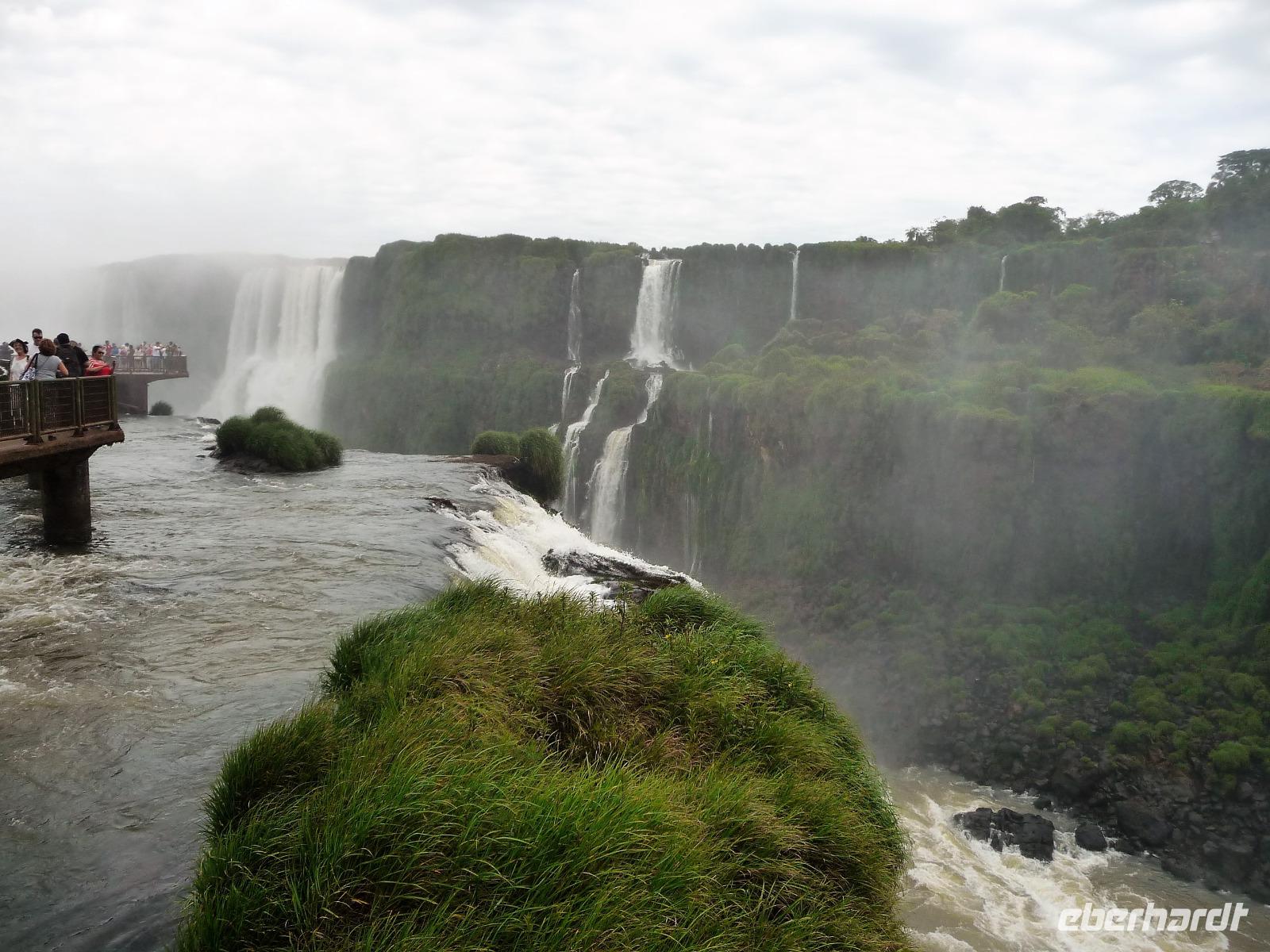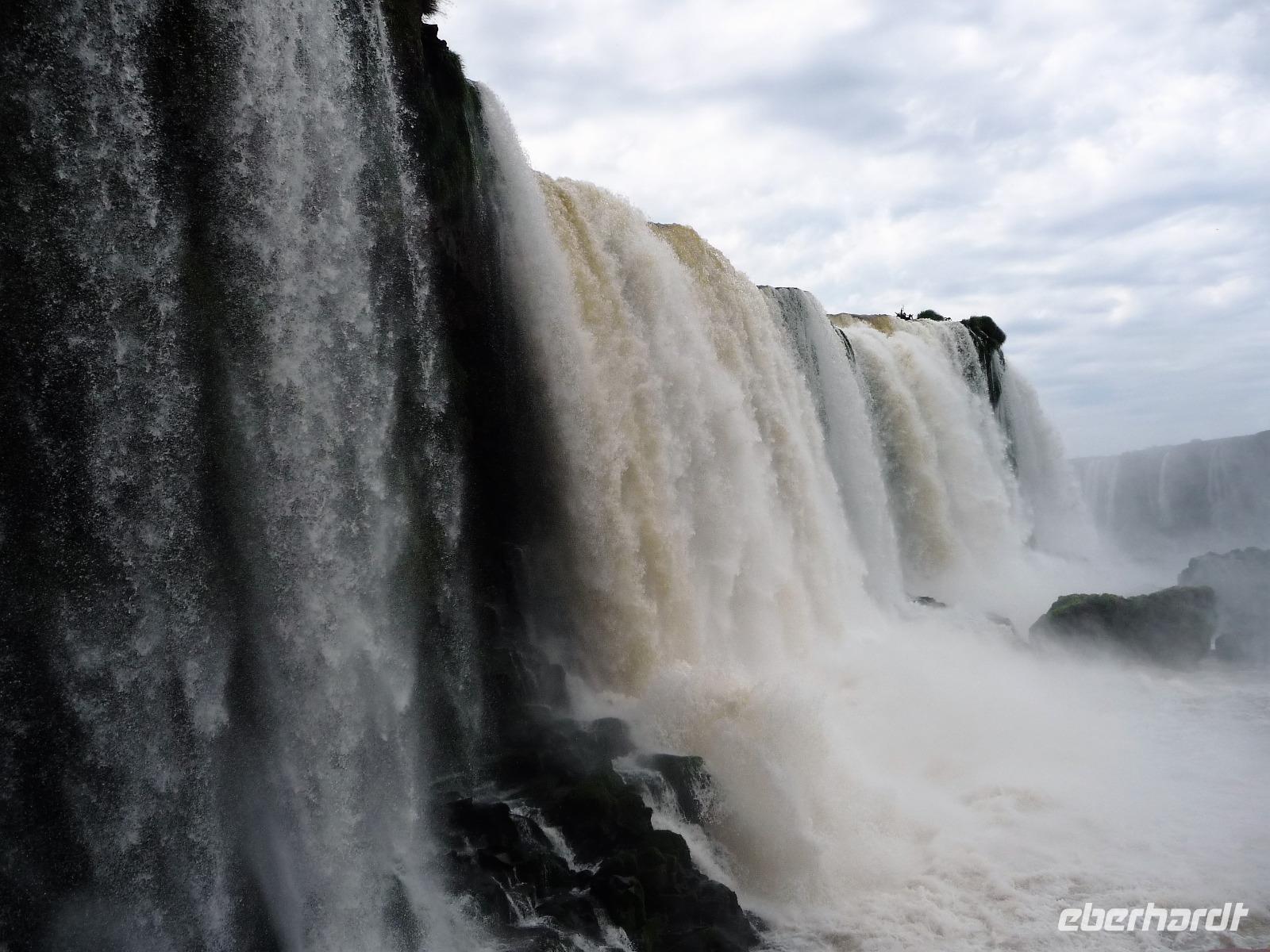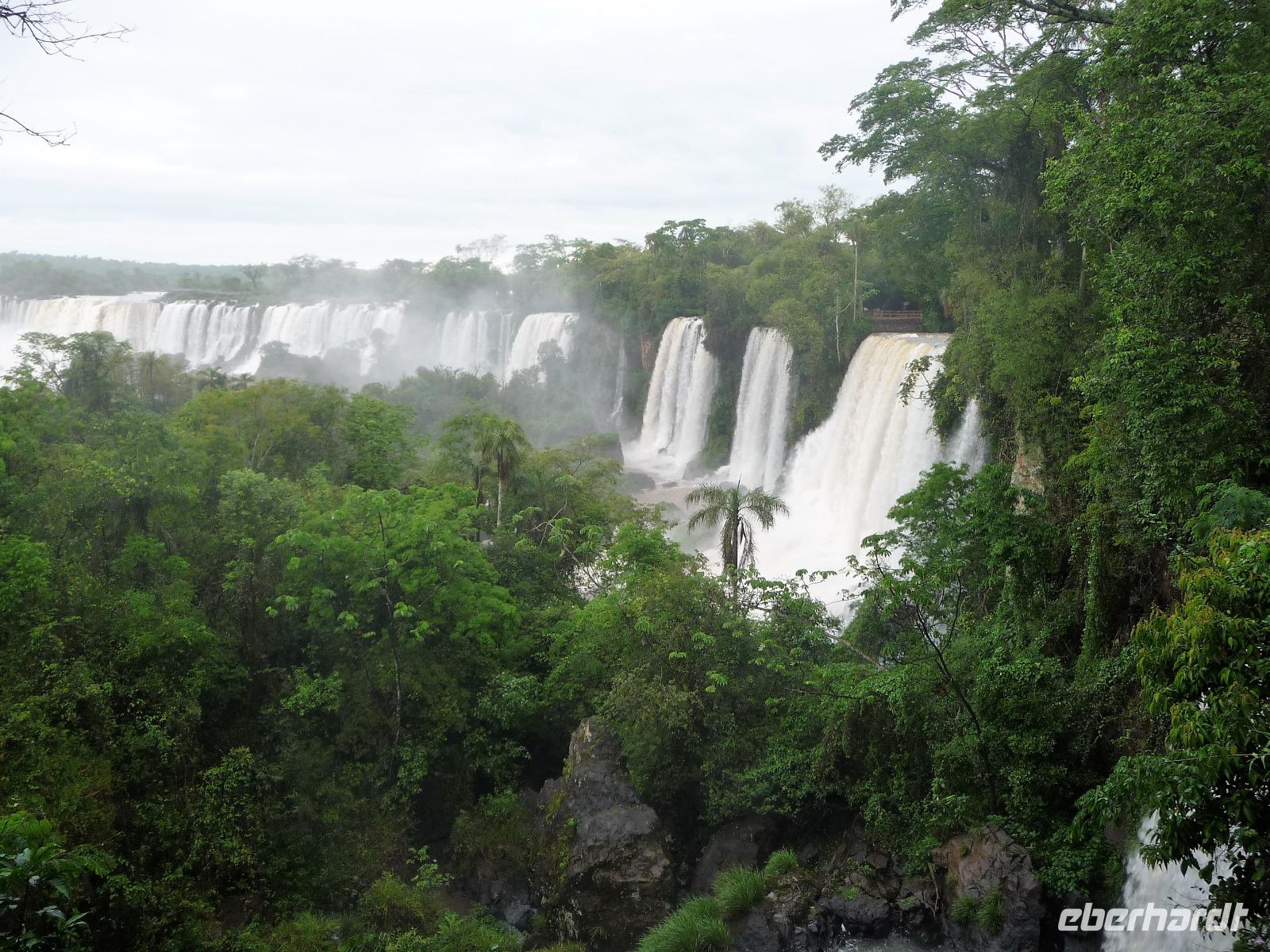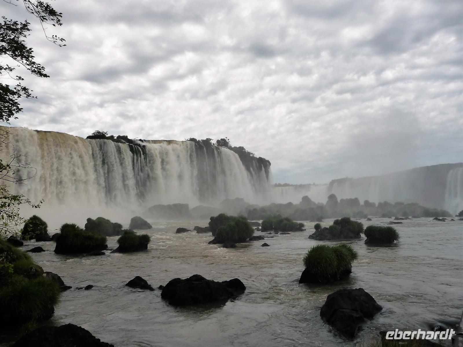 Da es am Vortag so heiß war, hatten wir unseren Ausflug auf die argentinische Seite der Wasserfälle vorverlegt und starteten bereits zeitig, um die Mittagshitze und die eventuellen Warteschlagen an der Grenze möglichst zu umgehen. Bereits in der Nacht gab es heftige Regenfälle und Hitzegewitter und der Regen sollte uns auch noch einen Teil des Tages begleiten. Aber wir waren gespannt, welche der Seite - die brasilianische oder die argentinische Seite - denn nun die schönere sein sollte. Unproblematisch konnten wir ohne viel Wartezeit die Grenze überqueren und waren schon einige Minuten vor der Öffnung des Parks am Eingang. Immer wieder bekräftigten wir unsere Zuversicht, dass es bestimmt ganz bald mit dem Regen aufhören würde. Man muss einfach nur Geduld haben! Mit dem kleinen Bummelzug fuhren wir bis zur Endstation und machten uns auf den Weg zum "Garganta del Diablo", dem "Teufelsschlund". Welch ein Tosen hörten wir bereits von der Ferne. Noch konnten wir uns nicht vorstellen, vor welchen Wassermassen wir gleich stehen würden. Immer näher kam das Donnern des Wassers und dann eröffnete sich ein gigantischer Ausblick. Durch den vielen Regen in den letzten Stunden, war der Iguazufluss schnell angeschwollen und entsprechend hoch war die Wassermenge, die sich über die Fälle ergoß. Fasziniert rückte man immer näher an die Absperrungen und vergaß regelrecht, dass man - wenn es denn möglich war - durch die Gischt noch nasser wurde. Aber egal, ein gigantisches Erlebnis, dass man so schnell nicht wieder haben sollte. Ein ganz anderes Erlebnis war dann der Rundweg. Hier sahen wir die Iguazu-Fälle nochmal in ganz anderen Perspektiven und endlich lichteten sich auch die dunklen Wolken und die ersten Sonnenstrahlen des Tages durchbrachen den Regen. Gleich machte es doppelt so viel Freude, die immer neuen Aussichtspunkte zu genießen. Wir waren uns einig: der richtige und passende Abschluss unserer Reise! Am Nachmittag plünderten wir nochmal das Büffet des kleinen Restaurants vom Vortag, kauften ein paar letzte Souvenirs, spazierten nochmal den kleinen Rundweg des Hotels bis zum Aussichtspunkt und trafen uns nochmal am Pool. Gemütlich ging der Tag nach dem Abendessen bei einem letzten Drink in der Bar des Hotels zu Ende.
