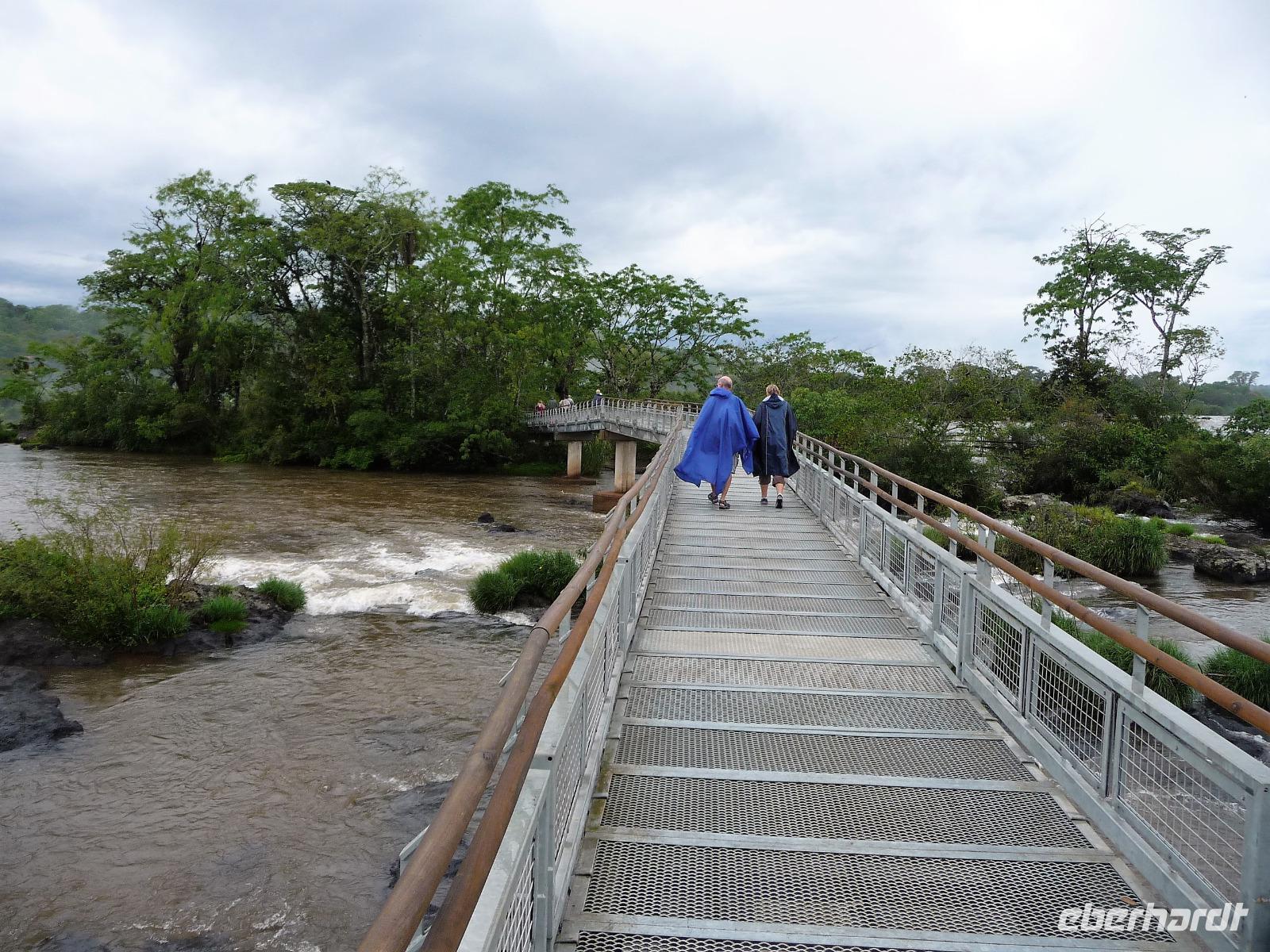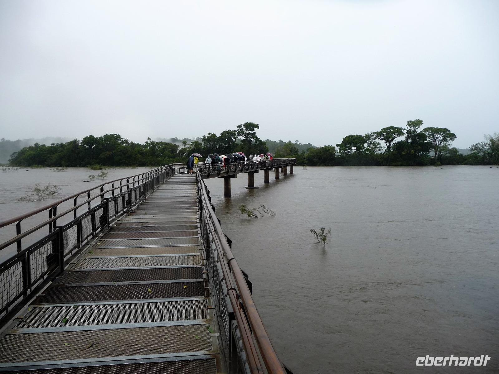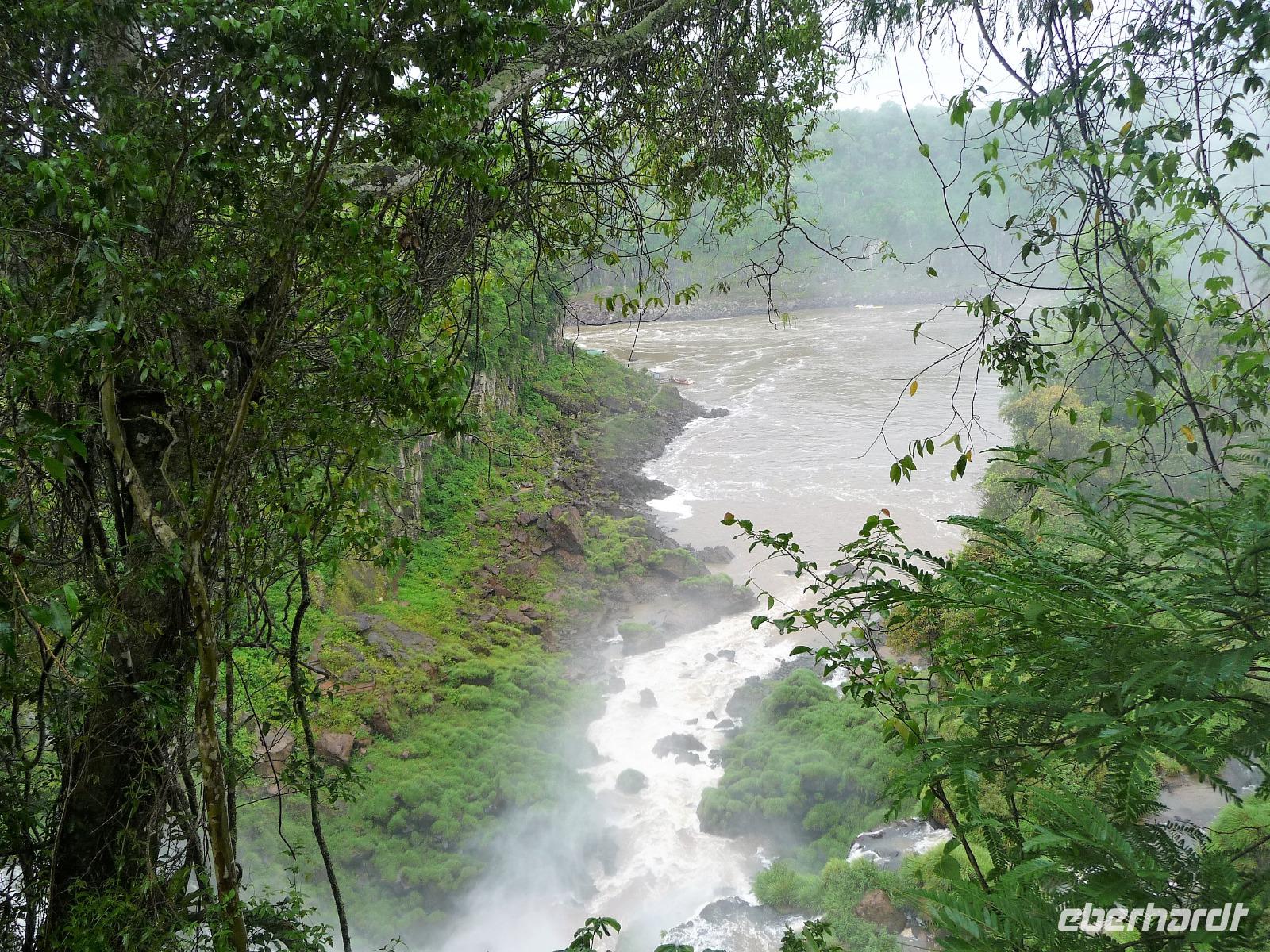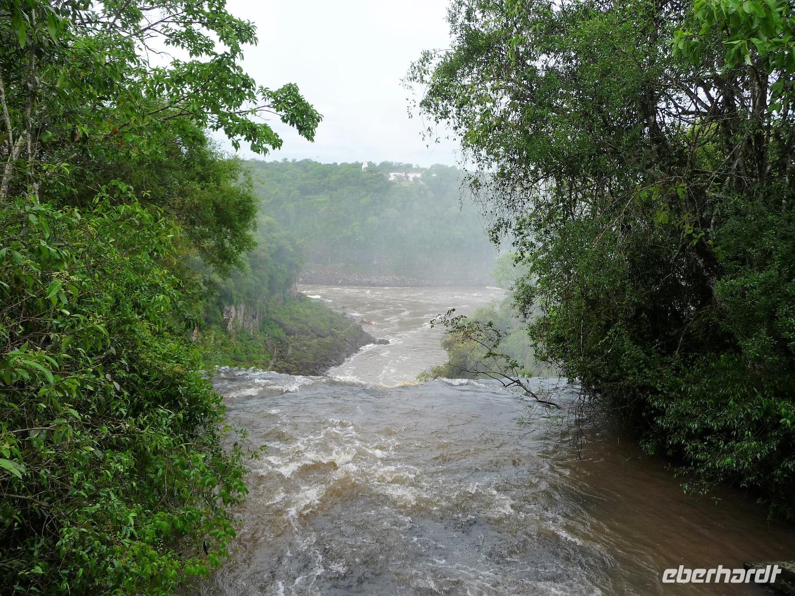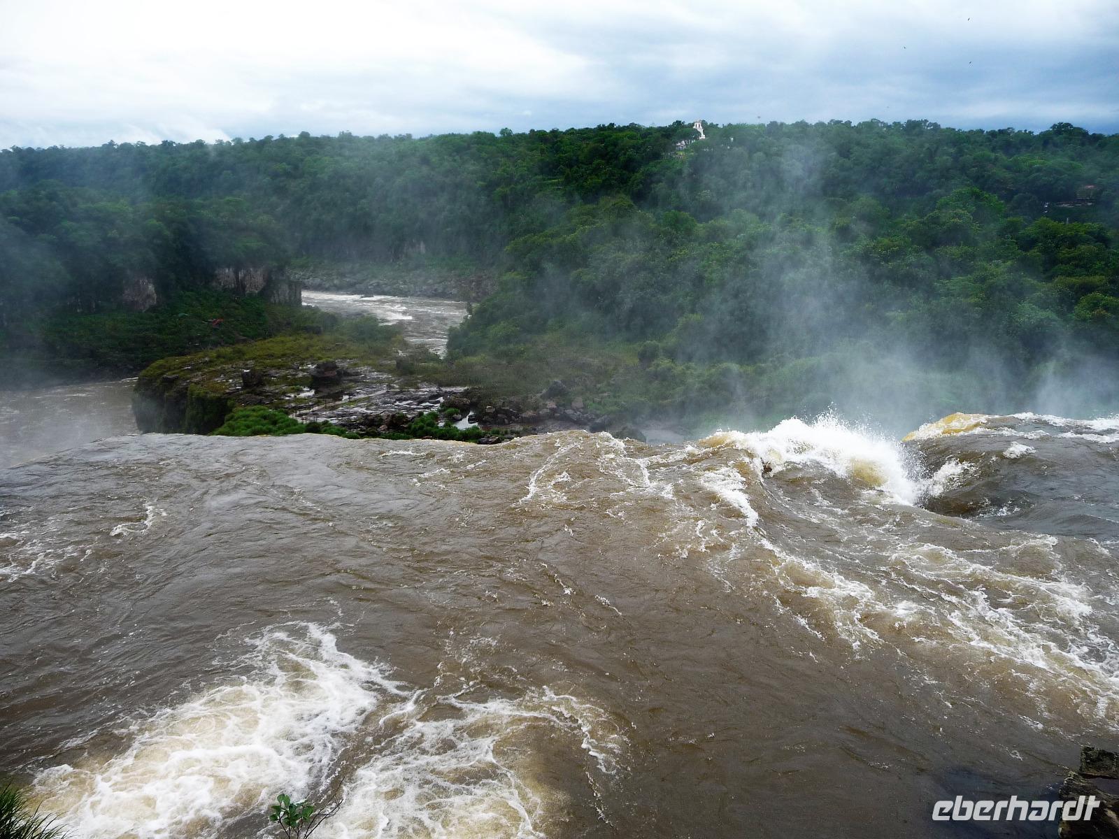 Da es am Vortag so heiß war, hatten wir unseren Ausflug auf die argentinische Seite der Wasserfälle vorverlegt und starteten bereits zeitig, um die Mittagshitze und die eventuellen Warteschlagen an der Grenze möglichst zu umgehen. Bereits in der Nacht gab es heftige Regenfälle und Hitzegewitter und der Regen sollte uns auch noch einen Teil des Tages begleiten. Aber wir waren gespannt, welche der Seite - die brasilianische oder die argentinische Seite - denn nun die schönere sein sollte. Unproblematisch konnten wir ohne viel Wartezeit die Grenze überqueren und waren schon einige Minuten vor der Öffnung des Parks am Eingang. Immer wieder bekräftigten wir unsere Zuversicht, dass es bestimmt ganz bald mit dem Regen aufhören würde. Man muss einfach nur Geduld haben! Mit dem kleinen Bummelzug fuhren wir bis zur Endstation und machten uns auf den Weg zum "Garganta del Diablo", dem "Teufelsschlund". Welch ein Tosen hörten wir bereits von der Ferne. Noch konnten wir uns nicht vorstellen, vor welchen Wassermassen wir gleich stehen würden. Immer näher kam das Donnern des Wassers und dann eröffnete sich ein gigantischer Ausblick. Durch den vielen Regen in den letzten Stunden, war der Iguazufluss schnell angeschwollen und entsprechend hoch war die Wassermenge, die sich über die Fälle ergoß. Fasziniert rückte man immer näher an die Absperrungen und vergaß regelrecht, dass man - wenn es denn möglich war - durch die Gischt noch nasser wurde. Aber egal, ein gigantisches Erlebnis, dass man so schnell nicht wieder haben sollte. Ein ganz anderes Erlebnis war dann der Rundweg. Hier sahen wir die Iguazu-Fälle nochmal in ganz anderen Perspektiven und endlich lichteten sich auch die dunklen Wolken und die ersten Sonnenstrahlen des Tages durchbrachen den Regen. Gleich machte es doppelt so viel Freude, die immer neuen Aussichtspunkte zu genießen. Wir waren uns einig: der richtige und passende Abschluss unserer Reise! Am Nachmittag plünderten wir nochmal das Büffet des kleinen Restaurants vom Vortag, kauften ein paar letzte Souvenirs, spazierten nochmal den kleinen Rundweg des Hotels bis zum Aussichtspunkt und trafen uns nochmal am Pool. Gemütlich ging der Tag nach dem Abendessen bei einem letzten Drink in der Bar des Hotels zu Ende.