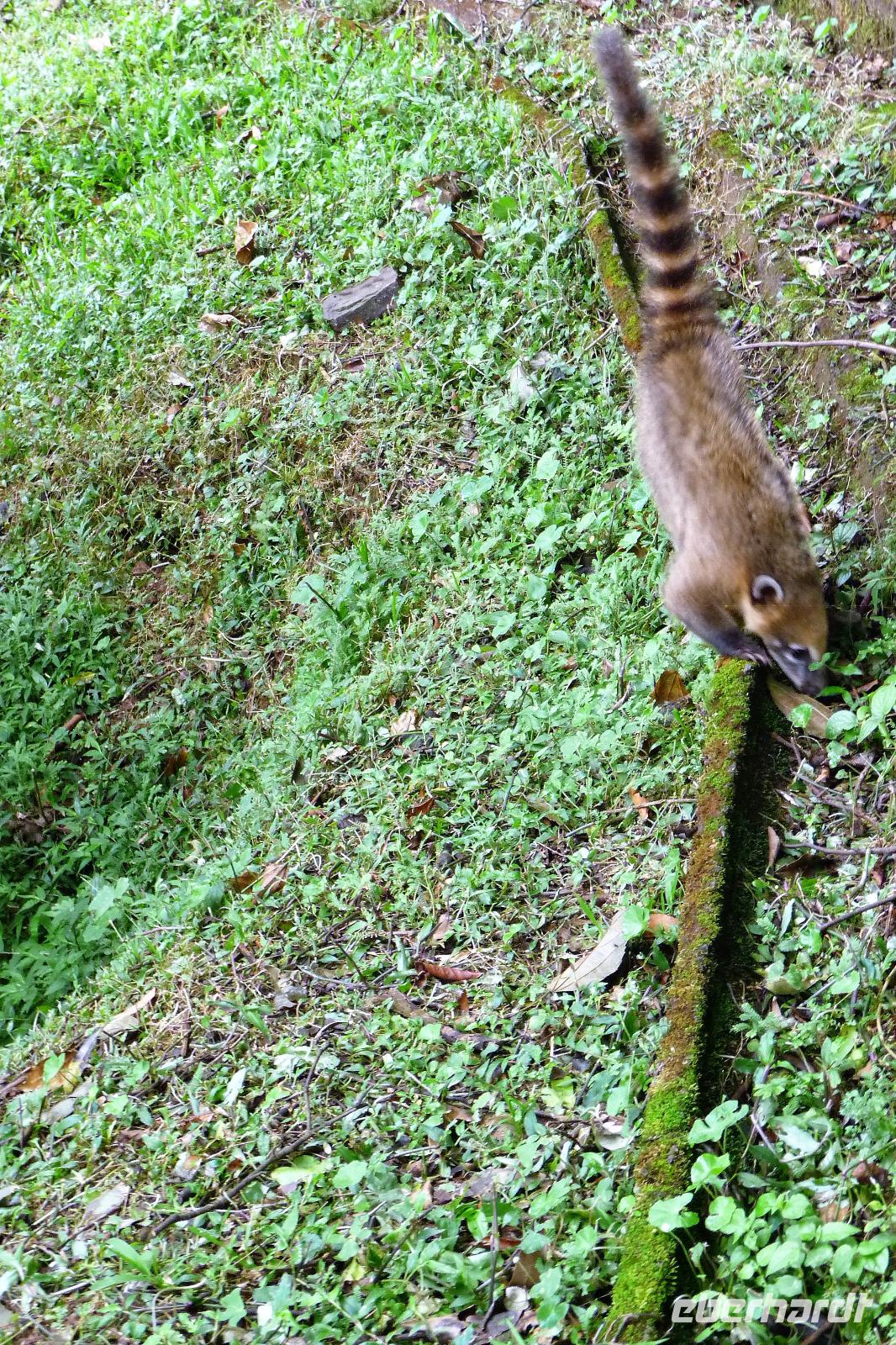 Guten Morgen Sonnenschein! Trotz aller Unkenrufe, dass es regnen sollte, strahlte die Sonne bereits am frühen Morgen und sollte den ganzen Tag durchhalten. Nach dem Frühstück machten wir uns auf den Weg, um die brasilianische Seite der Wasserfälle zu erkunden. Mit dem Bus fuhren wir zunächst ein kurzes Stück bis zum Eingang des Parks. Damit alles seine Ordnung hat, mussten wir aussteigen und einzeln durch die Kontrollen und danach durfte uns unser Bus wieder aufnehmen. Warum einfach, wenn es auch kompliziert geht... Aber was soll's , wir waren einfach nur aufgeregt und wollten endlich die Wasserfälle sehen. Also hieß es noch ein kleines Stückchen fahren, bevor sich der erste Blick eröffnete. Einfach unbeschreiblich, wenn man direkt vor den Iguazu-Wasserfällen steht. Entlang eines Wanderwegs läuft man parallel zum Fluss entlang und an jeder Ecke eröffnen sich neue Ausblicke. Toll, Wahnsinn, grandios!!! Immer wieder musste noch ein weiteres Foto gemacht werden und gespannt schauten wir auf die argentinischen Aussichtspunkte, die uns am nächsten Tag erwarten sollten. Zwischendurch trafen wir immer wieder auf putzige Nasenbären, vor denen wir aber bereits gewarnt waren, denn wer nicht aufpasst, dem wird schnell etwas Essbares stibizt. Am Ende des Weges fuhren wir mit dem Panoramaaufzug zur Aussichtsplattform und hatten nochmal einen wunderschönen Ausblick auf die Wasserfälle.