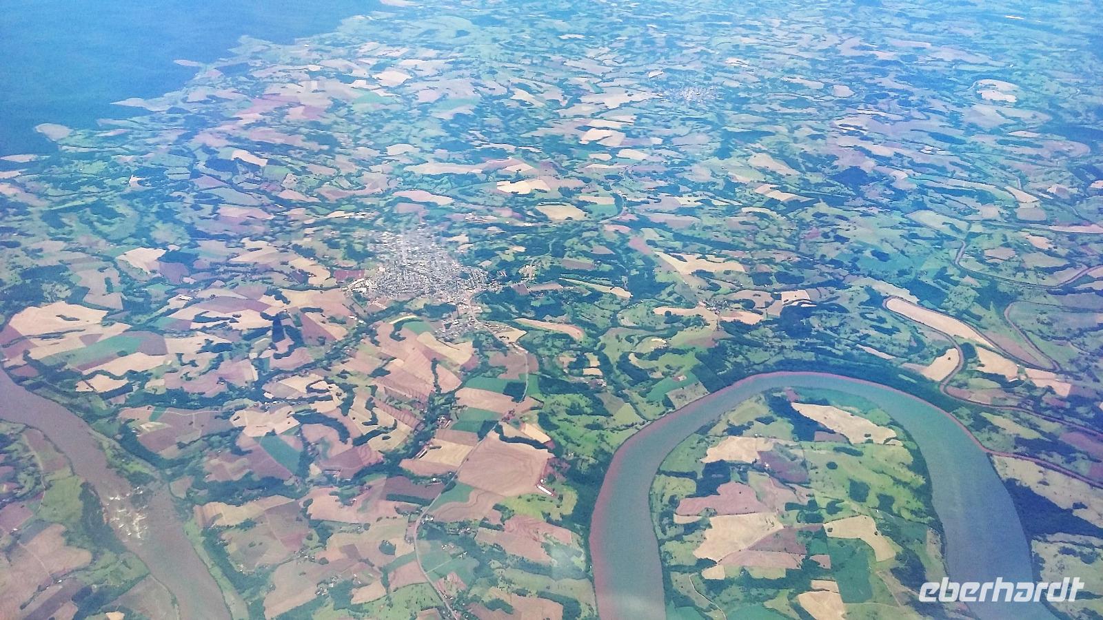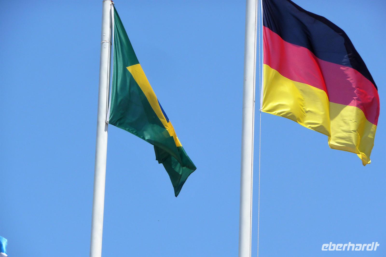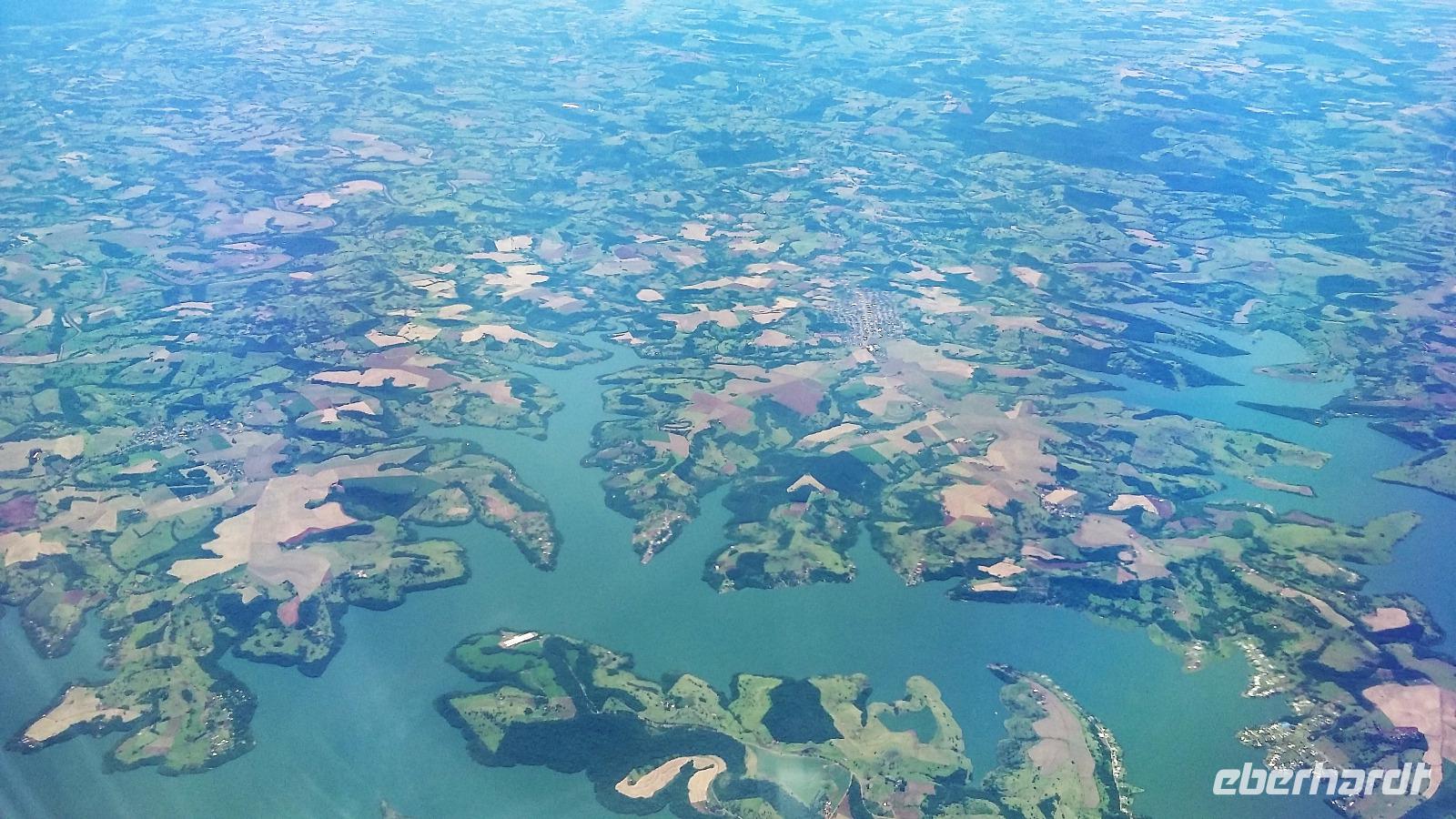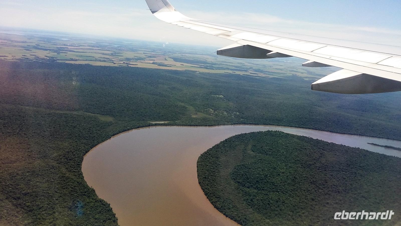 Noch einmal entspannt zum Frühstück und ein kleiner Spaziergang im Park unseres Hotels, dann fuhren wir schon zum Flughafen Iguazu. Klein und chaotisch, das hatten wir bisher noch nicht so erlebt. Eine kleine, volle "Wartehalle´" mit vielen Passagieren, der Flüge verspätet waren. Aber bei uns ging alles überpünktlich los. Wir nutzten natürlich nochmal, sofern möglich - den bevorzugten "Senioreneinstieg". Wer auf der rechten Seite im Flieger saß, konnte sogar nochmal auf die Wasserfälle in der Ferne schauen, aber auch die Sicht auf der linken Seite war auf den Iguazufluss sehr interessant. Den internationalen Flughafen von Sao Paolo kannten wir bereits, wir mussten nur ins moderne internationale Terminal wechseln. Schnell ging die relativ lange Wartezeit von 5 Stunden bei einem verspäteten Mittagessen und beim Shoppen der letzten Souvenirs vorbei. Freudig stellten wir fest, dass wir mit dem "Siegerflieger" der Fussball-Nationalmannschaft nach Frankfurt fliegen sollten. Natürlich war das das eine oder andere Foto wert.
