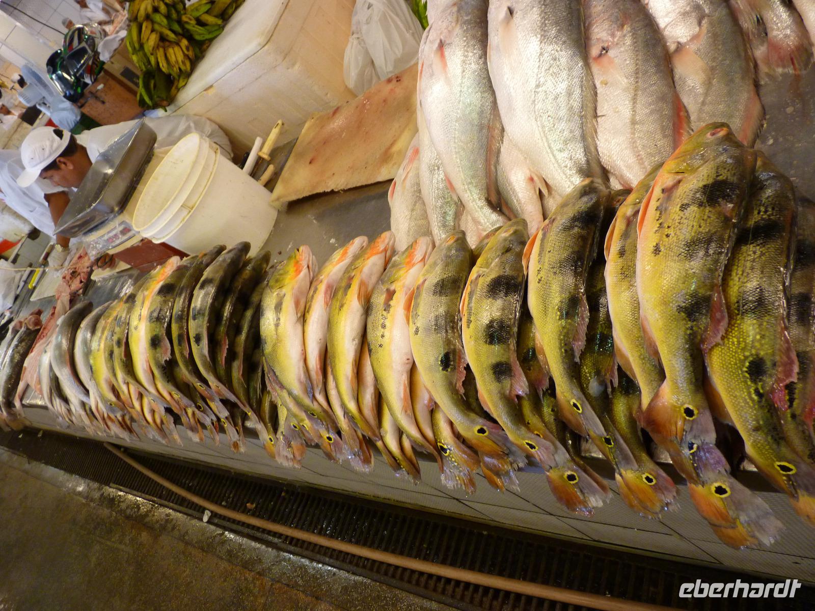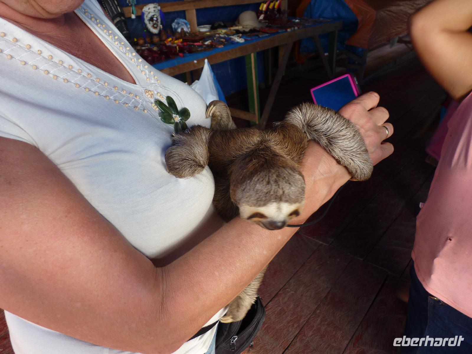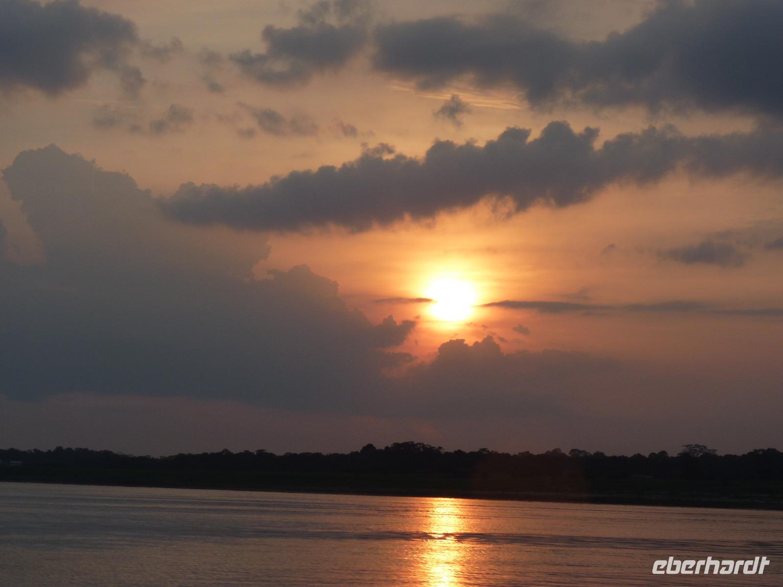 Nichts war es mit lange ausschlafen, an diesem Sonntag. Frühes Aufstehen war angesagt, wollten wir doch den Sonnenaufgang auf dem Wasser beobachten. Das Wetter spielte mit und so konnten wir einen wunderschönen Sonnenaufgang von unseren Booten aus beobachten. Kurz nach dem folgenden Frühstück hieß es schon wieder, Boote besteigen, denn jetzt wollten wir durch den Dschungel wandern. Wir haben kaum unsere Wandertour begonnen, da fing es an zu gewittern uns zu regnen. Im Grunde war es fast egal, ob wir ein Regencape anzogen oder nicht. Unter dem Cape schwitzten wir durch die Wärme und Luftfeuchtigkeit und über dem Cape waren wir nass durch den Regen. Zwar sahen wir auf unserer Wanderung kaum Tiere, aber auch ohne diese war es einfach interessant, den Regenwald einmal persönlich zu erleben. Es war dann aber auch wieder angenehm, auf unser Schiff zurück zu kehren und die feuchten Sachen wechseln zu können. Am Nachmittag hatten dann alle Gäste die Möglichkeit, die Kommandobrücke der Iberostar zu besichtigen und etwas später an einem kleinen Ausflug zum Souvenirkauf teilzunehmen. Dort lernten wir dann auch den größten Fisch des Amazonas und einen der größten Süßwasserfische weltweit kennen, den Pirarucú. Auf unserer Rückfahrt zum Schiff konnten wir dann kurzzeitig noch einmal ein paar Delphine sichten. Der Abend wurde mit einem festlichen Gala-Dinner und einer Folklore-Show abgeschlossen, bei der alle Gäste am Ende zum Tanz bei Samba-Rhythmen aufgefordert wurden.
