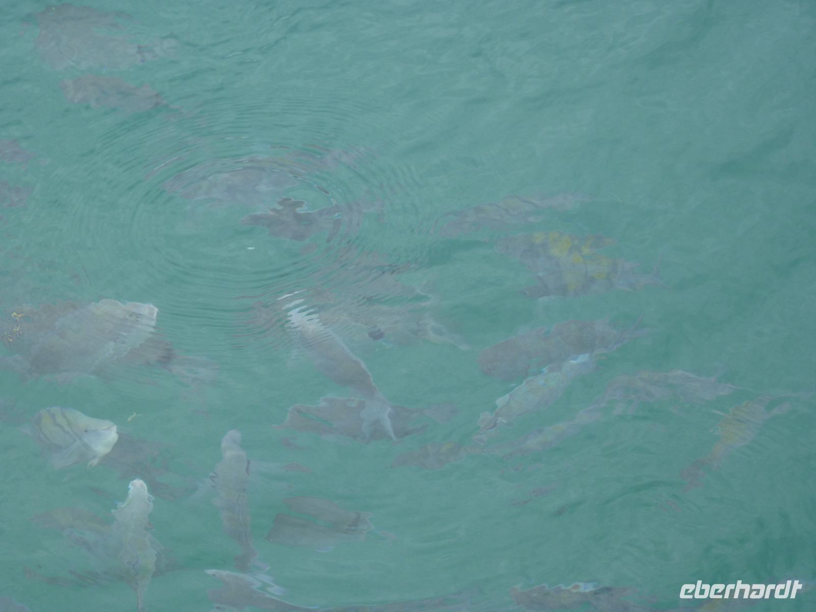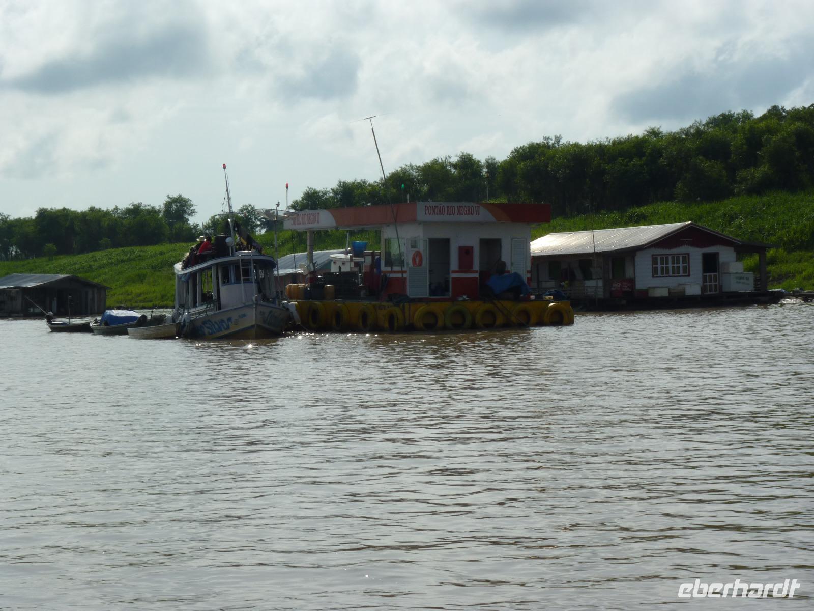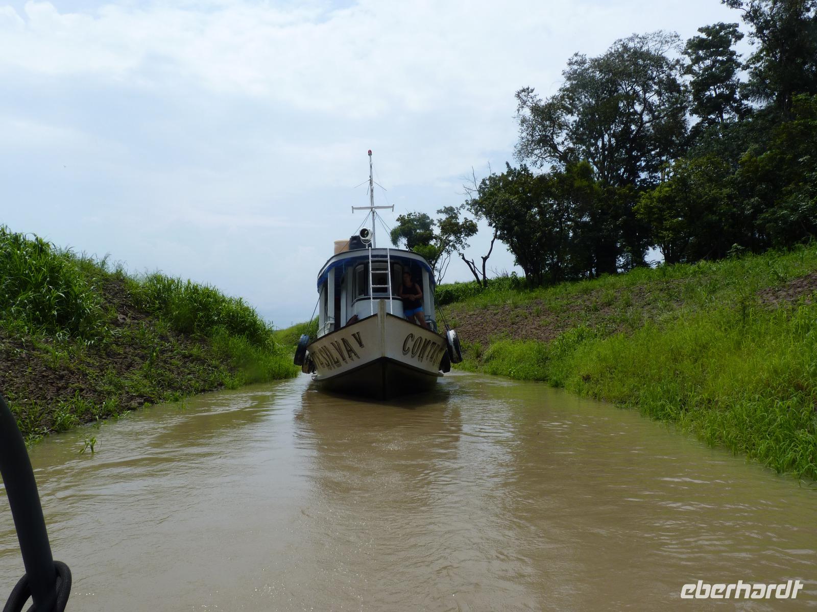 Nichts war es mit lange ausschlafen, an diesem Sonntag. Frühes Aufstehen war angesagt, wollten wir doch den Sonnenaufgang auf dem Wasser beobachten. Das Wetter spielte mit und so konnten wir einen wunderschönen Sonnenaufgang von unseren Booten aus beobachten. Kurz nach dem folgenden Frühstück hieß es schon wieder, Boote besteigen, denn jetzt wollten wir durch den Dschungel wandern. Wir haben kaum unsere Wandertour begonnen, da fing es an zu gewittern uns zu regnen. Im Grunde war es fast egal, ob wir ein Regencape anzogen oder nicht. Unter dem Cape schwitzten wir durch die Wärme und Luftfeuchtigkeit und über dem Cape waren wir nass durch den Regen. Zwar sahen wir auf unserer Wanderung kaum Tiere, aber auch ohne diese war es einfach interessant, den Regenwald einmal persönlich zu erleben. Es war dann aber auch wieder angenehm, auf unser Schiff zurück zu kehren und die feuchten Sachen wechseln zu können. Am Nachmittag hatten dann alle Gäste die Möglichkeit, die Kommandobrücke der Iberostar zu besichtigen und etwas später an einem kleinen Ausflug zum Souvenirkauf teilzunehmen. Dort lernten wir dann auch den größten Fisch des Amazonas und einen der größten Süßwasserfische weltweit kennen, den Pirarucú. Auf unserer Rückfahrt zum Schiff konnten wir dann kurzzeitig noch einmal ein paar Delphine sichten. Der Abend wurde mit einem festlichen Gala-Dinner und einer Folklore-Show abgeschlossen, bei der alle Gäste am Ende zum Tanz bei Samba-Rhythmen aufgefordert wurden.