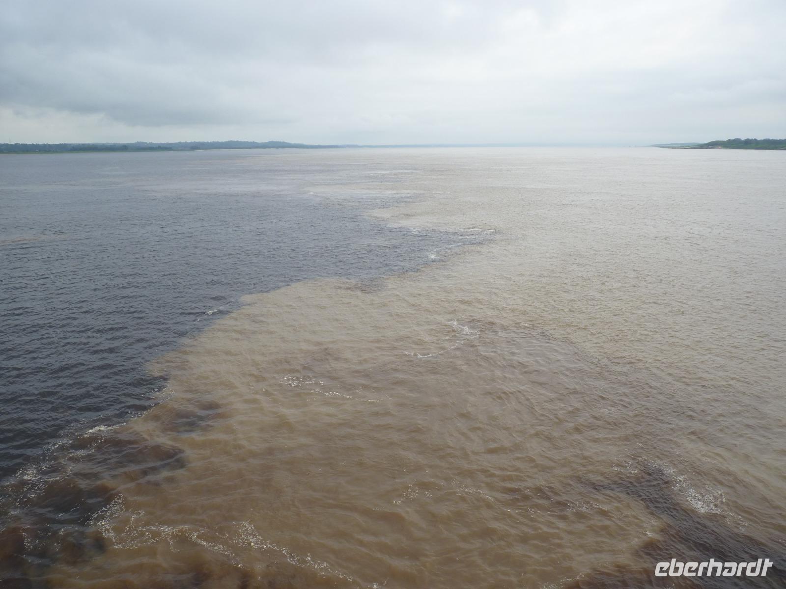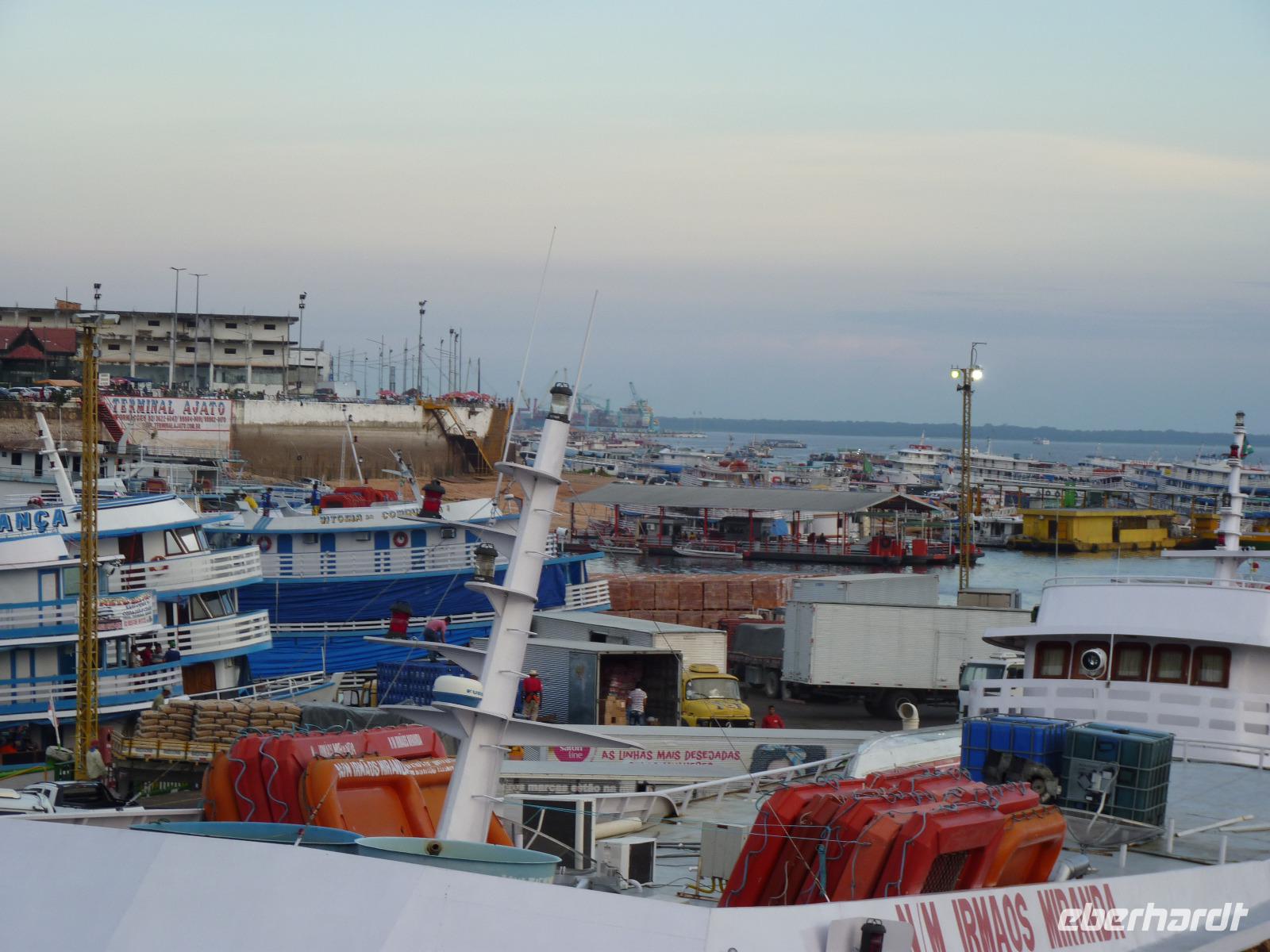 Es hieß Abschied nehmen von Rio und der Copacabana, um zu unserem nächsten Ziel, dem Amazonas aufzubrechen. Nachdem uns Natalina zum Flughafen gebracht hatte, verabschiedeten wir uns von ihr und unserem Fahrer Juan. Zur Mittagszeit starteten wir in Rio, um fast exakt 4 Stunden später in Manaus, der mit über 2 Millionen Einwohnern größten Stadt im Amazonas und auch deren Hauptstadt, zu landen. Schon beim Anflug auf Manaus konnten wir einen ersten Eindruck von den Wassermassen dieses gigantischen Stromes gewinnen. Maria erwartete uns bereits und nach einer halbstündigen Busfahrt erreichten wir den Hafen und konnten auch gleich an Bord gehen. Nach einem kurzen Check-In bezogen wir unsere Kabinen und ohne vorherige Absprache versammelte sich unsere Gruppe schon wenig später auf dem Oberdeck, um auf die bevorstehende Kreuzfahrt anzustoßen. Über die Anzahl der der geleerten Sektflaschen breite ich hier mal den Mantel des Schweigens aus . Kurz nach 18:00 Uhr legte unser Schiff, die Iberostar Grand Amazon dann vom Hafen in Manaus ab. Nach einem Welcomedrink und der Kapitäns-Vorstellung freuten wir uns auf unser erstes Abendessen an Bord. Nach diesem besuchten wir noch die kleine Magic-Show, um uns anschließend auf dem Oberdeck noch einmal den Wind um die Nase wehen zu lassen.