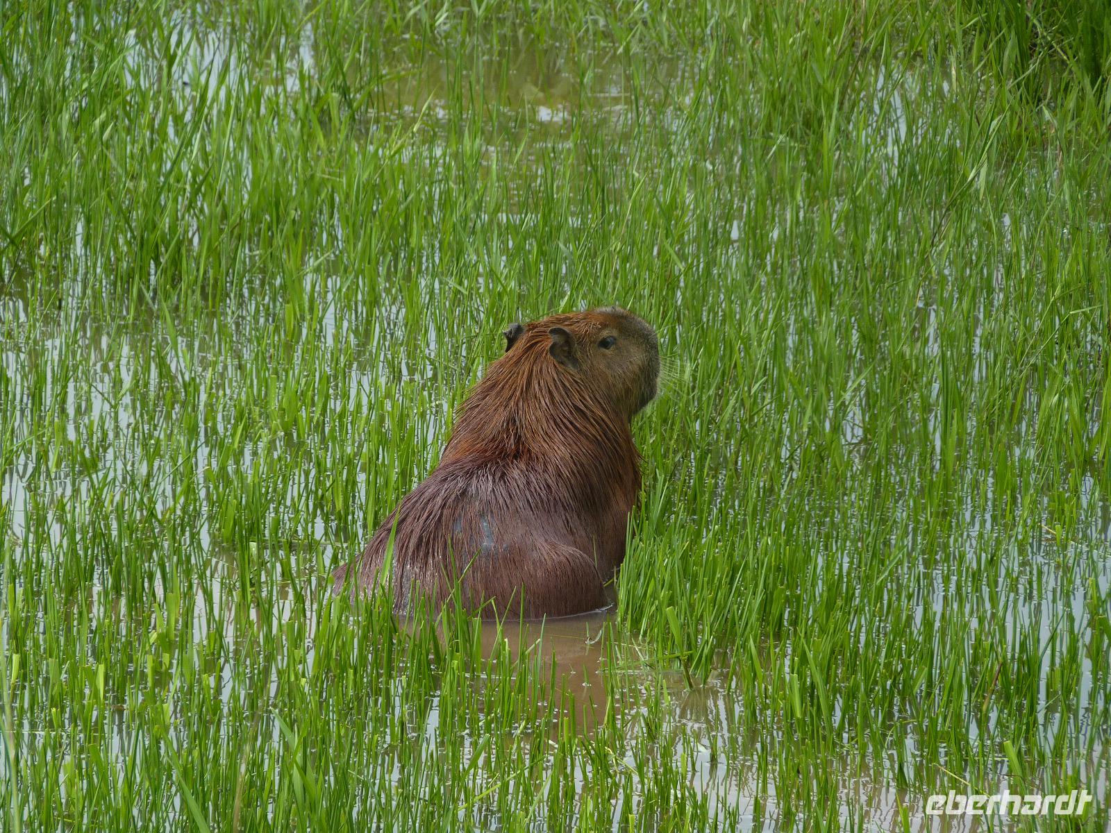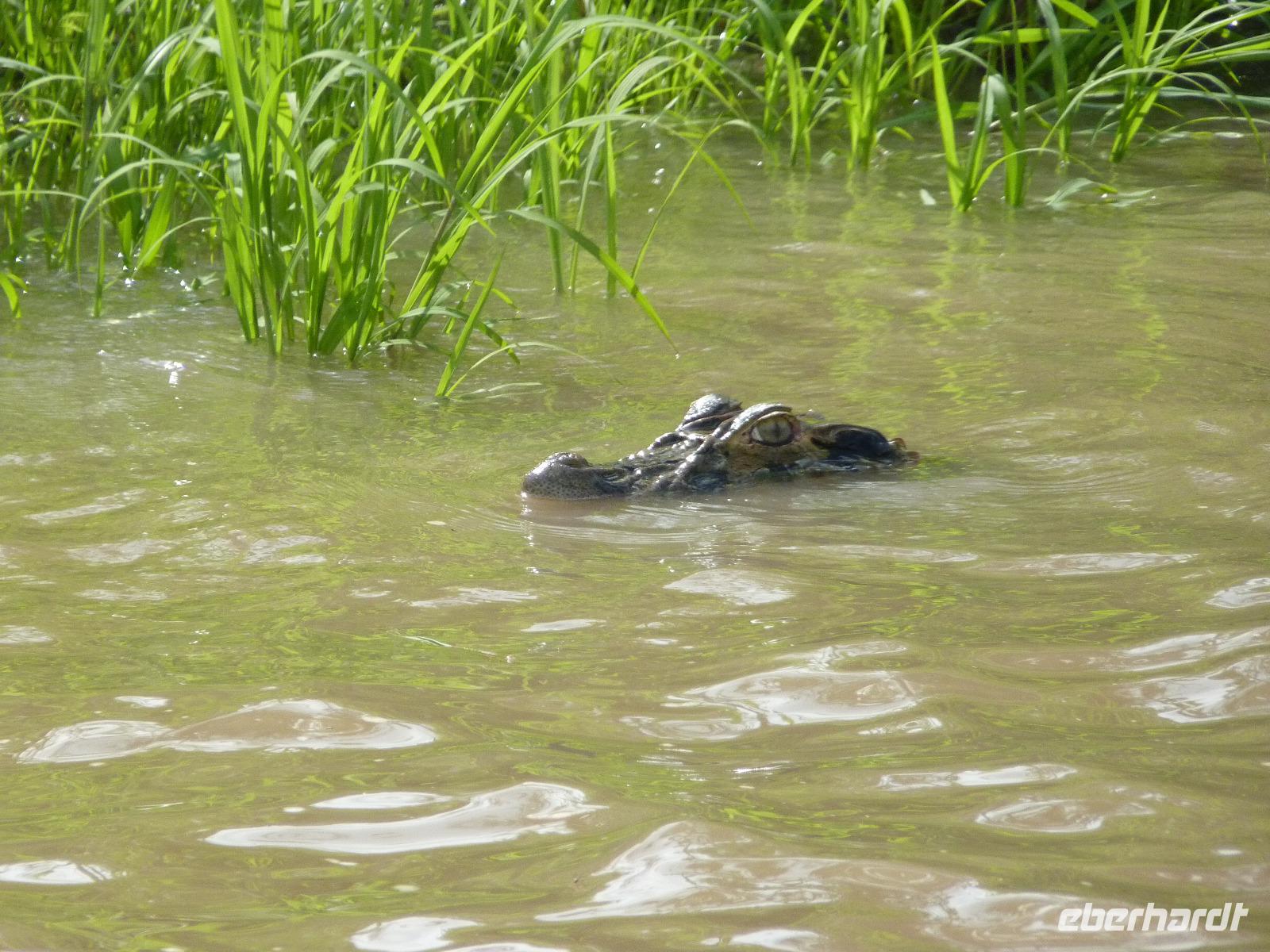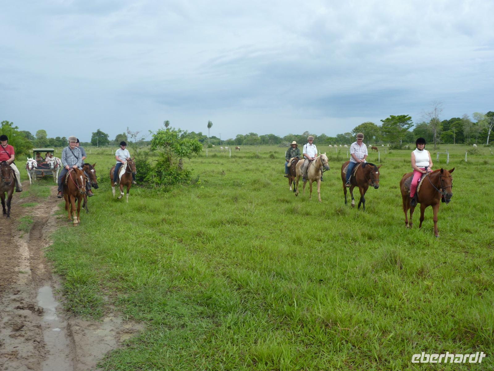 Am Vormittag machten die meisten Reisegäste meiner Gruppe das erste Mal die Erfahrung des Reitens auf einem Pferderücken. Wer nicht wollte, konnte mit der Kutsche fahren und so ging es raus auf die Felder, um auch hier Ausschau nach (wilden) Tieren zu halten. Während Affen und verschiedene Vögel eher nicht dazu gehörten, so entdeckte zu- mindestens unser Reitguide die Spur eines Jaguars. Zu sehen haben wir ihn leider nicht bekommen.