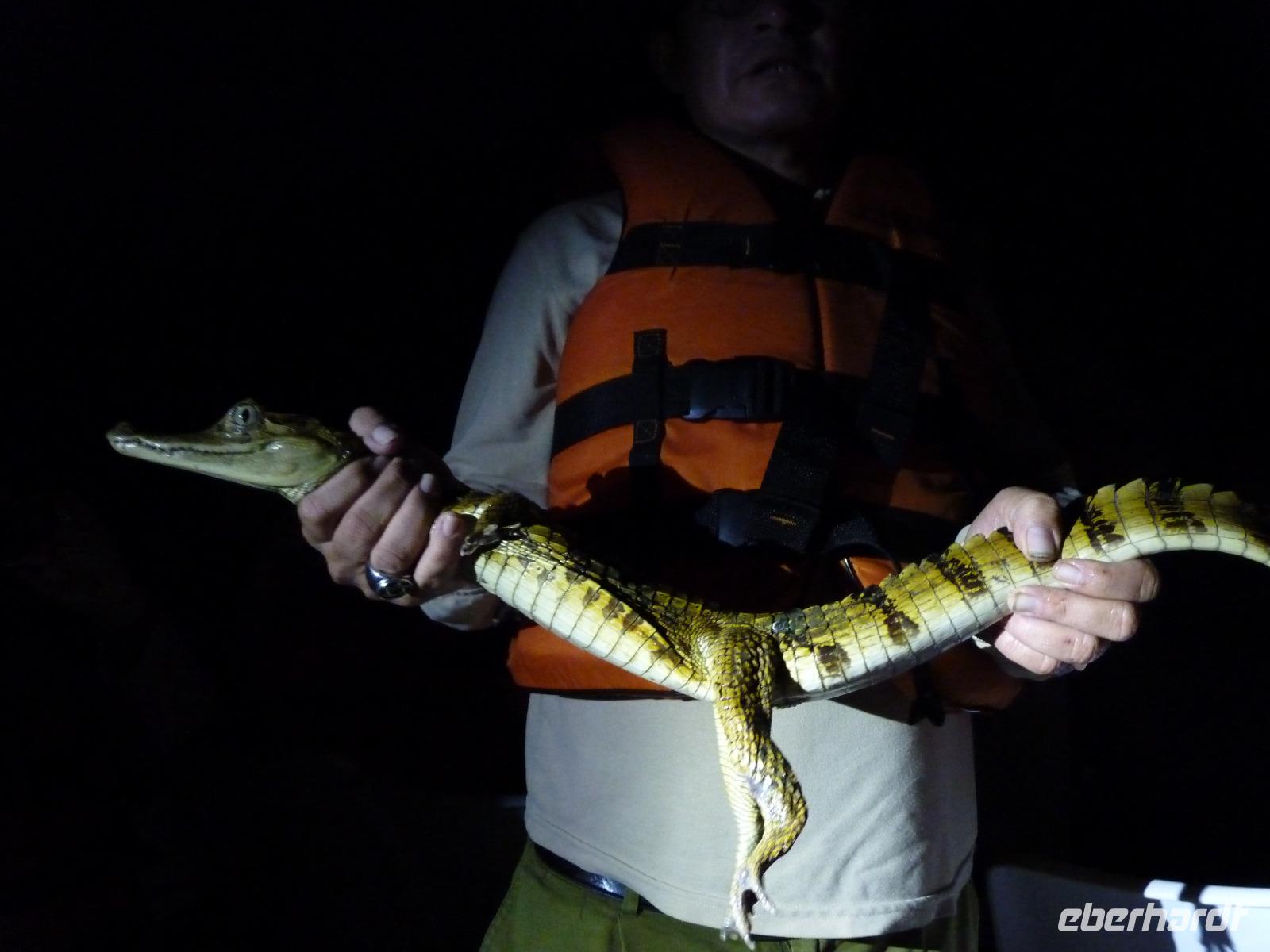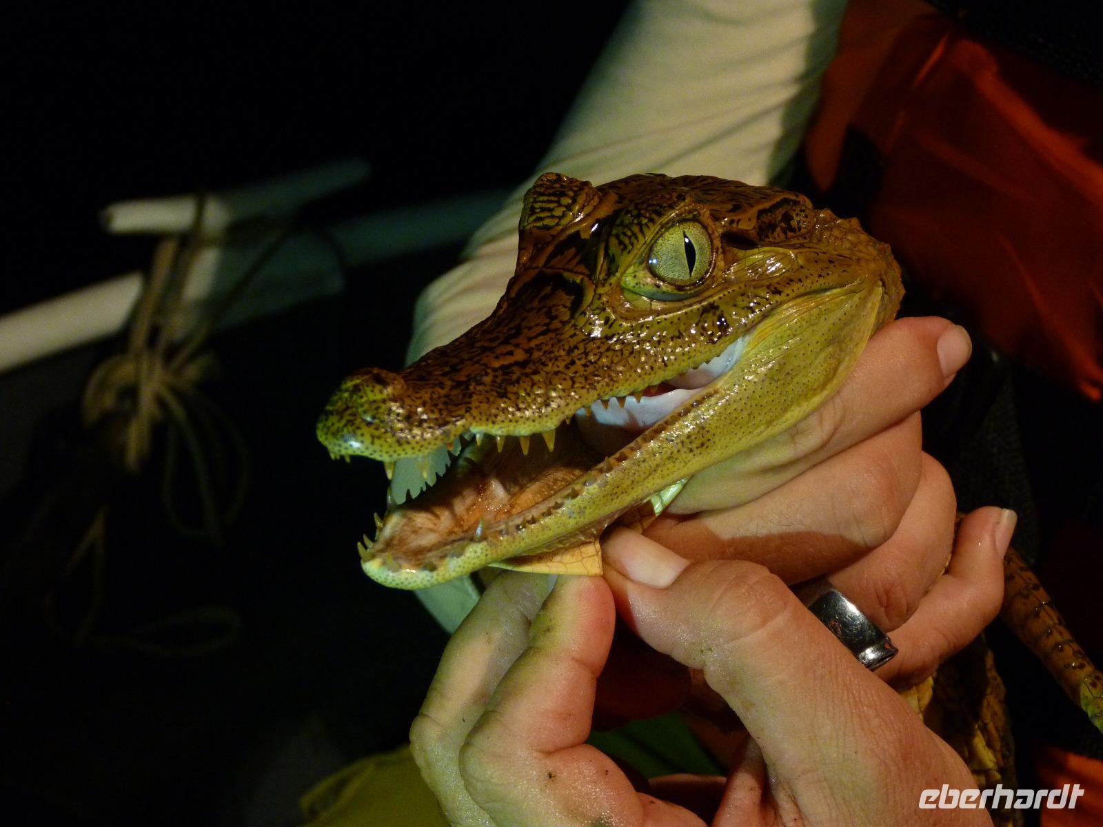 Am zeitigen Vormittag starteten wir unseren ersten Bootsausflug. Schon nach wenigen Minuten Bootsfahrt wurden Delphine gesichtet und bald darauf konnten wir auch die ersten Kaimane beobachten. Bei dem anschließenden Besuch einer Farm und deren Bewohnern machten wir uns einen Eindruck vom Leben im Amazonas und erfuhren von unserem Guide Jefferson zudem Einiges über die hiesigen Früchte, Bäume und Pflanzen. Bei einer Temperatur von über 30°C und einer extrem hohen Luftfeuchtigkeit mussten wir uns nicht viel bewegen, um schon nach kurzer Zeit ordentlich durchgeschwitzt zu sein. Zurück in der Kühle des Schiffes folgten wir bei einem Vortrag von Jefferson den Ausführungen zur Natur im Amazonas, um uns anschließend beim Mittag für unseren Ausflug am Nachmittag zu stärken. Piranha-Fischen war angesagt. Alle unsere Gäste nahmen an diesem Ausflug teil und mit einem separaten Boot nur für unsere Gruppe ging es dann auch gleich mal mit einem Regenguss zum Start los. Aber schon nach 3-4 Minuten waren wir aus der Regenwand raus und durch den Fahrtwind und die Wärme auch ganz schnell wieder trocken. Also Angeln in die Hand, Fleisch an den Haken und los ging es. Wenn auch nicht Alle das Anglerglück auf Ihrer Seite hatten, aber so betrug unsere Beute immerhin 7 Piranhas und 3 kleine Welse. Alle Fische wurden lebend wieder in die Freiheit entlassen und dann musste es schnell gehen. Rings um uns herum blitzte es und eine große Regenwand kam auf uns zu. Doch wir schafften es, trocken auf unser Schiff zurück zu kommen. Ein weiterer Höhepunkt stand an diesem Tag aber noch bevor. Nach dem Abendessen fuhren wir in der Dunkelheit noch einmal mit unseren kleinen Schnellbooten raus, um Kaimane zu beobachten. Für unsere erfahrenen Guides war es kein großes Problem, einige Exemplare zu sichten und Jefferson gelang es sogar, ein junges Tier zu fangen, so dass wir uns diesen Kaiman ganz aus der Nähe anschauen und natürlich auch fotografieren konnten. Mit diesem erfolgreichen Ausflug beendeten wir diesen erlebnisreichen Tag auf dem Amazonas.