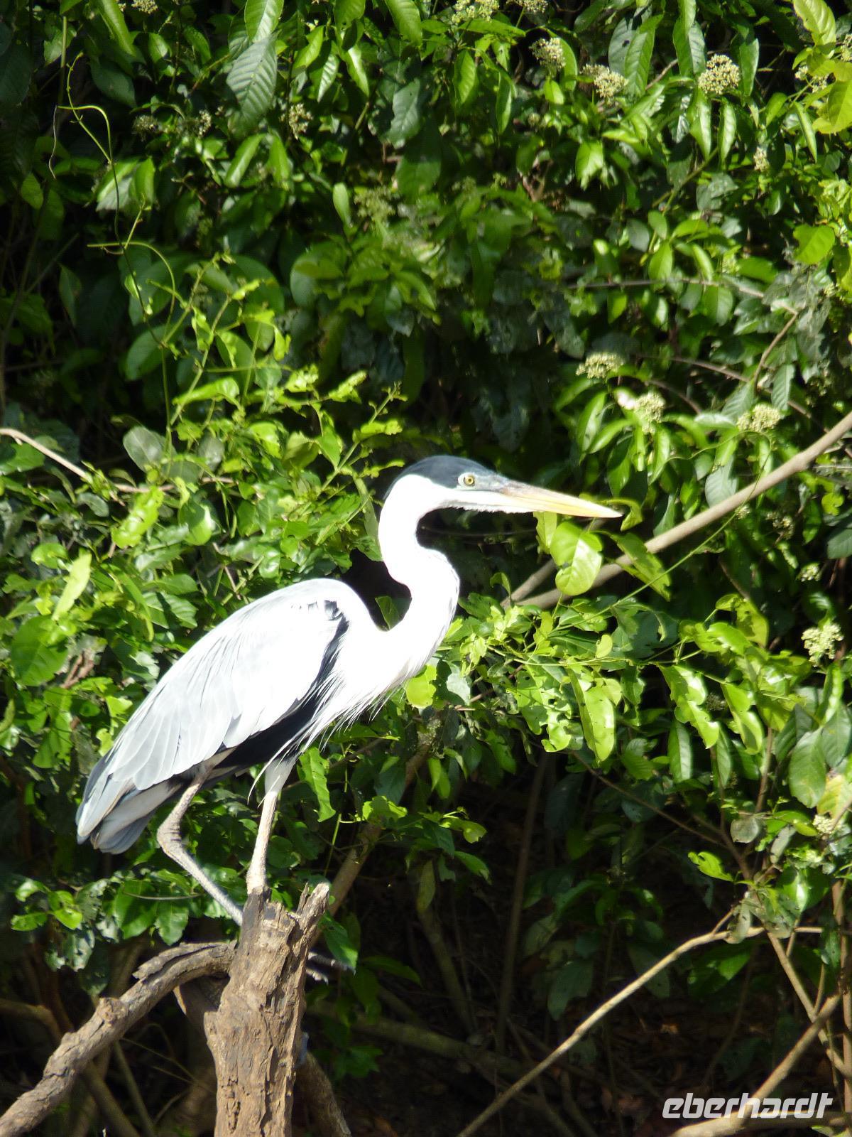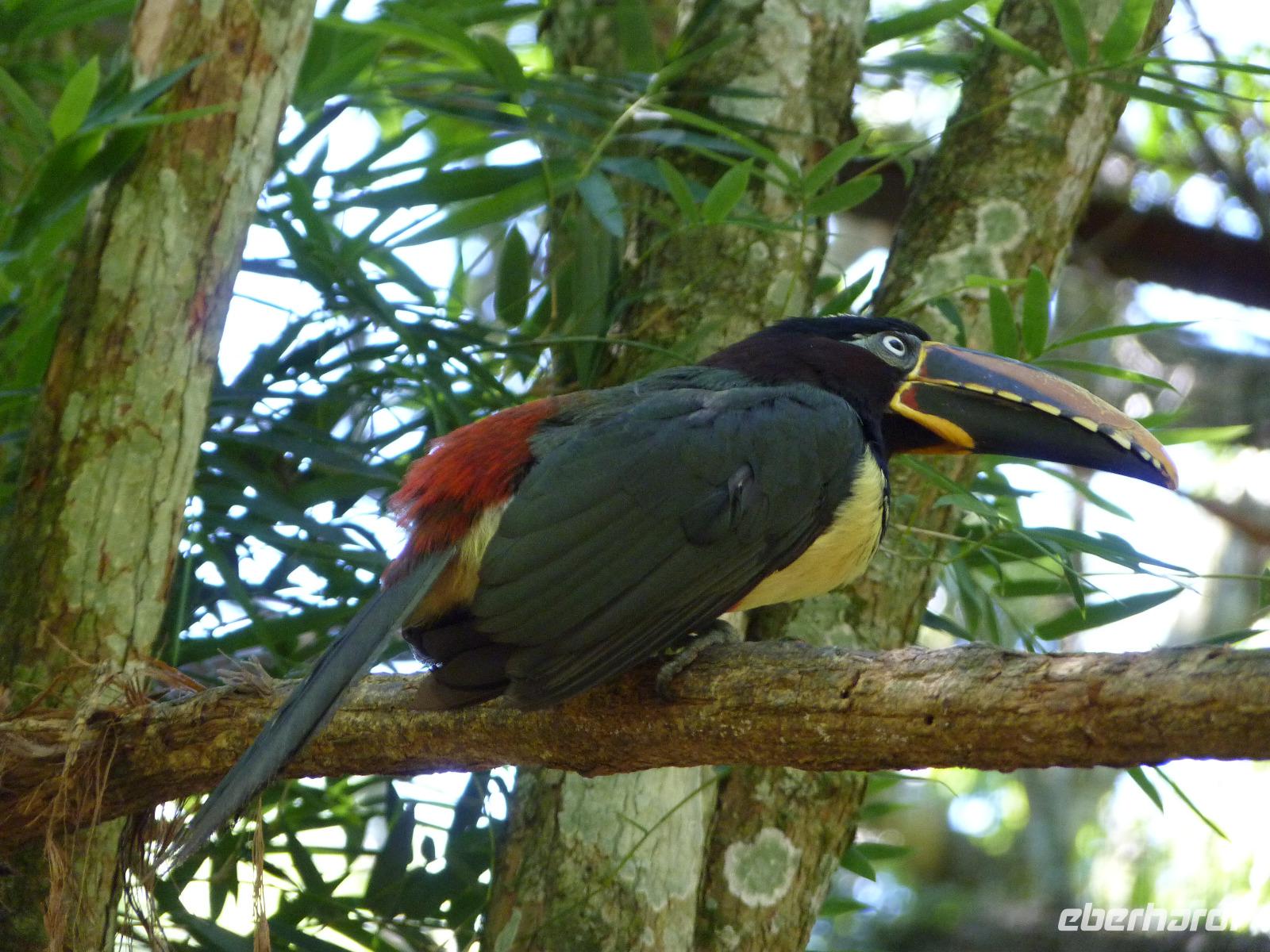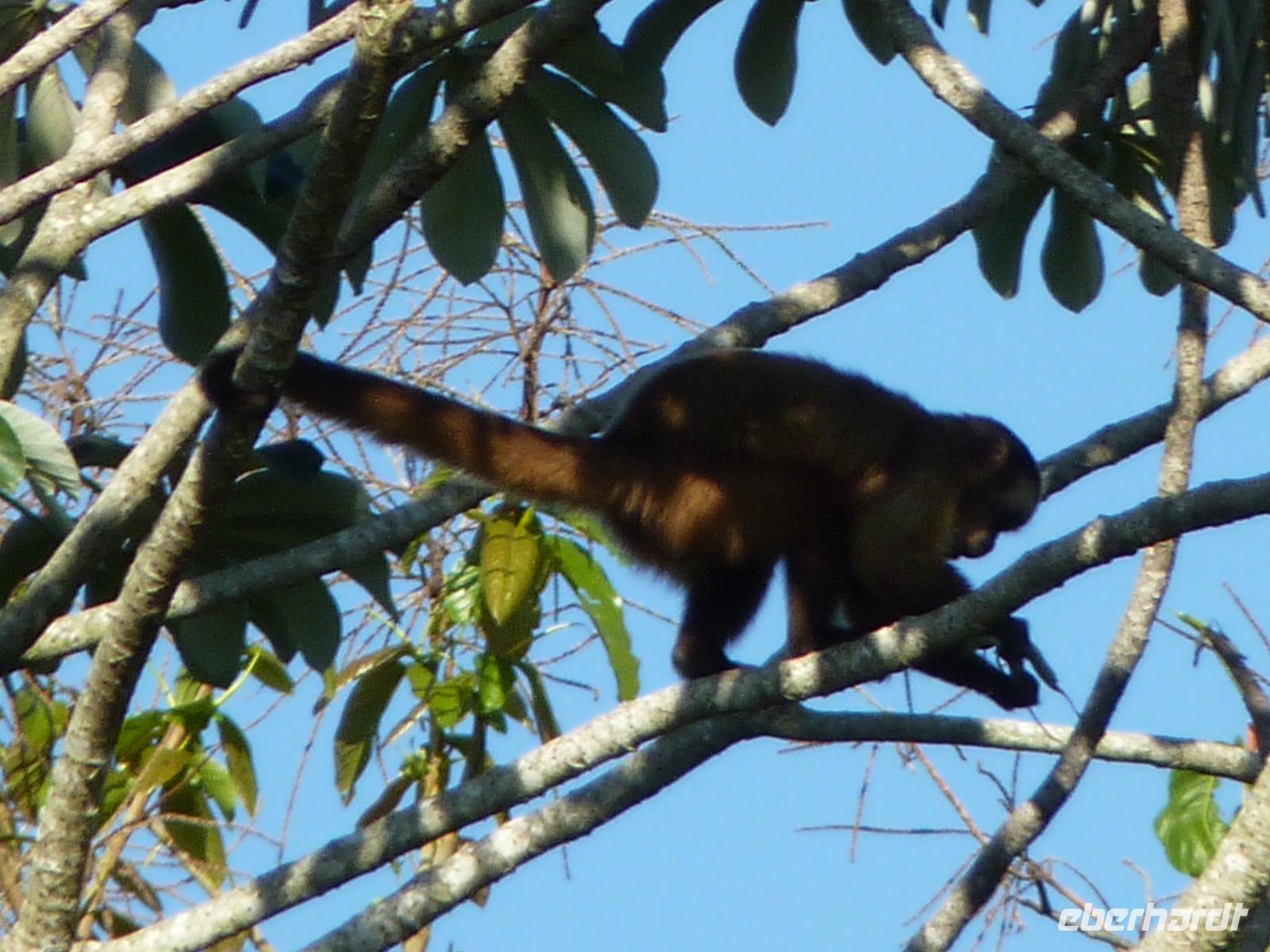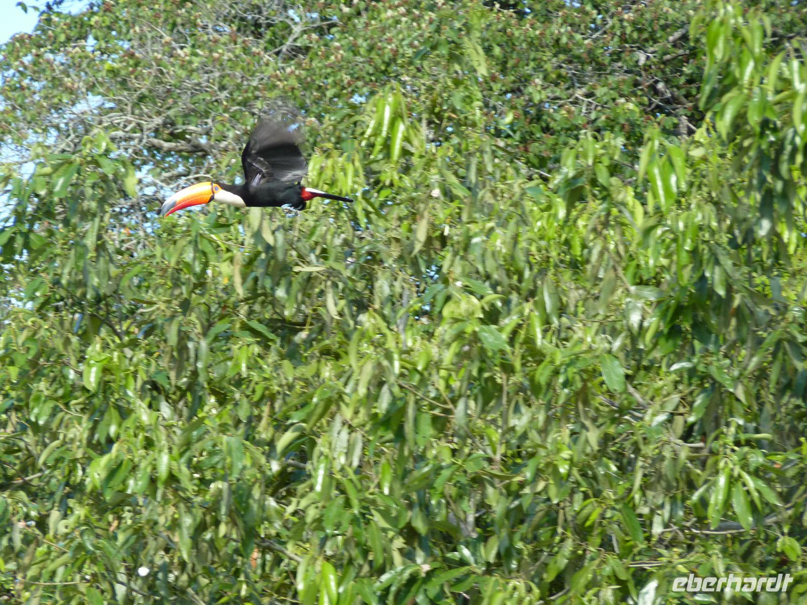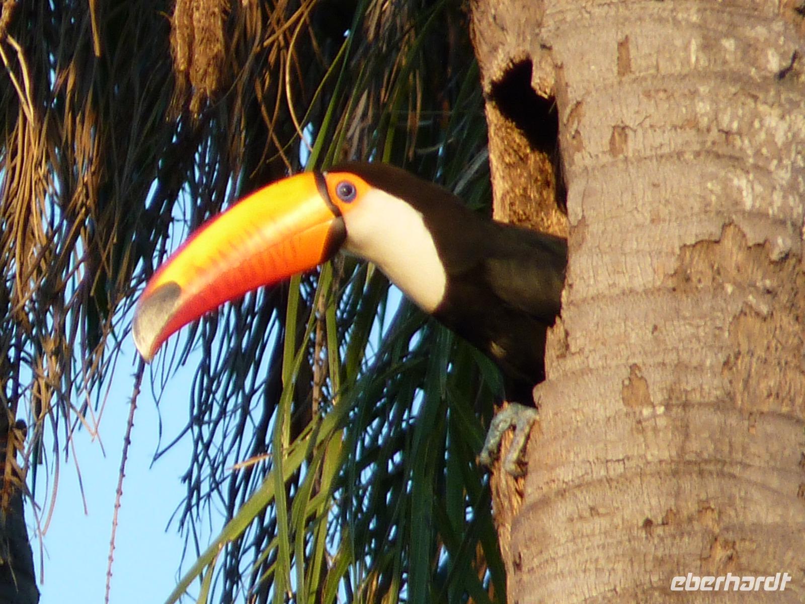 Am Nachmittag unternahmen wir dann eine Bootsfahrt auf dem Rio Aquidauana, einem insgesamt 1200 km langen Fluss. Dabei entdeckten wir die ersten Tucane, verschiedene Reiher und Affen und natürlich andere Vögel. Wollten sich die Tucane während der Bootsfahrt noch nicht fotografieren lassen, so gelang uns dies unmittelbar vor der Pousada, wo ein Tucan sein Nest in einem Nest hatte und dieser auf mein (An-)Klopfen neugierig rausschaute, wer da wohl ist.