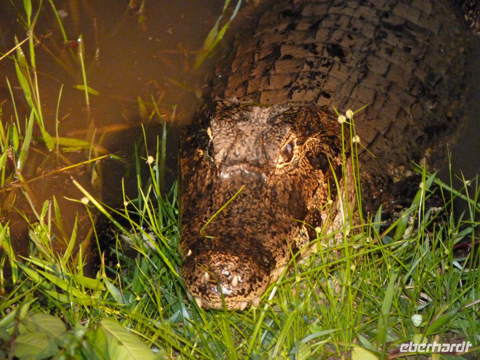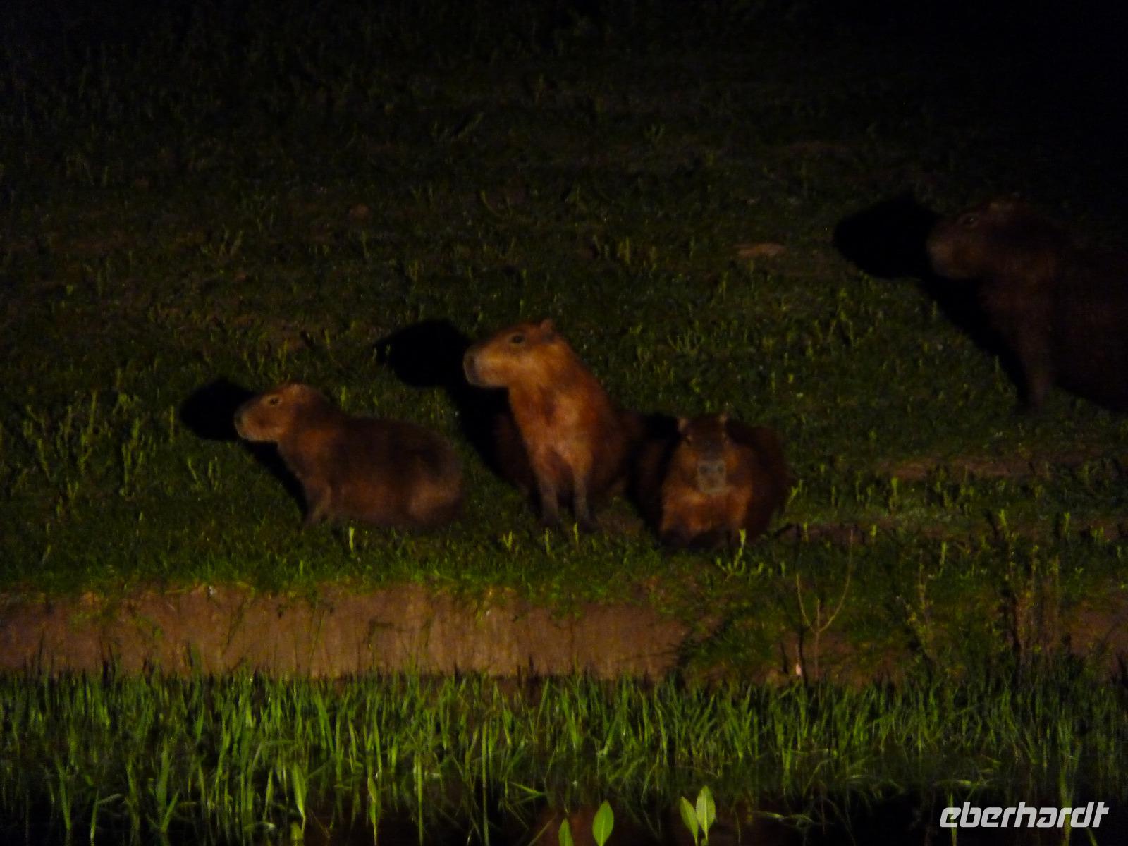 Nach unserem Abendessen unternahmen wir noch einen Jeepausflug im Dunkeln. Wasserschweine, jede Menge Kaimane, ein Gürteltier, Rehe, Hasen und einen Ameisenbär konnten wir dabei sehen. Zufrieden kehrten wir zu unserer Unterkunft zurück und stießen auf den Erfolg des Tages noch mit einem Bier an.