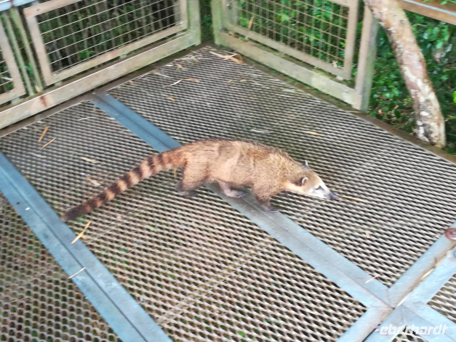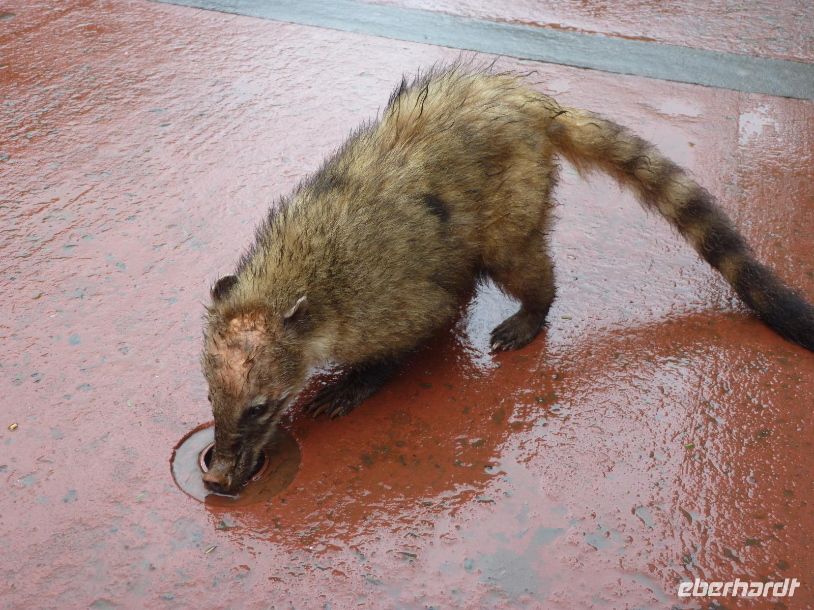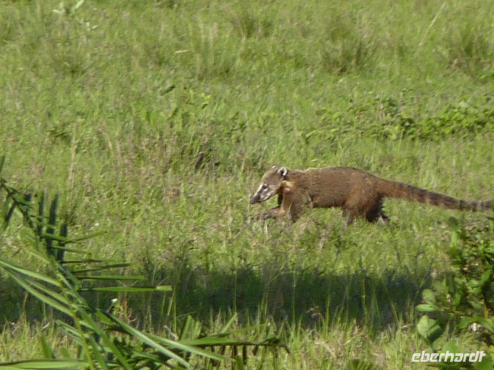 Dieser Tag stand ganz im Zeichen des Umzuges aus dem Pantanal zu unserem letzten Reiseziel, den Wasserfällen von Iguazu. Um unseren Flieger in Campo Grande zu erreichen, mussten wir schon zeitig aufbrechen. Laut dem Sprichwort „Morgenstund hat Gold im Mund" wird frühes Aufstehen belohnt und tatsächlich bekamen wir auf unserer Fahrt zum Flughafen endlich einen Ameisenbär bei Tage zu sehen und konnten diesen vor allem auch fotografisch festhalten.