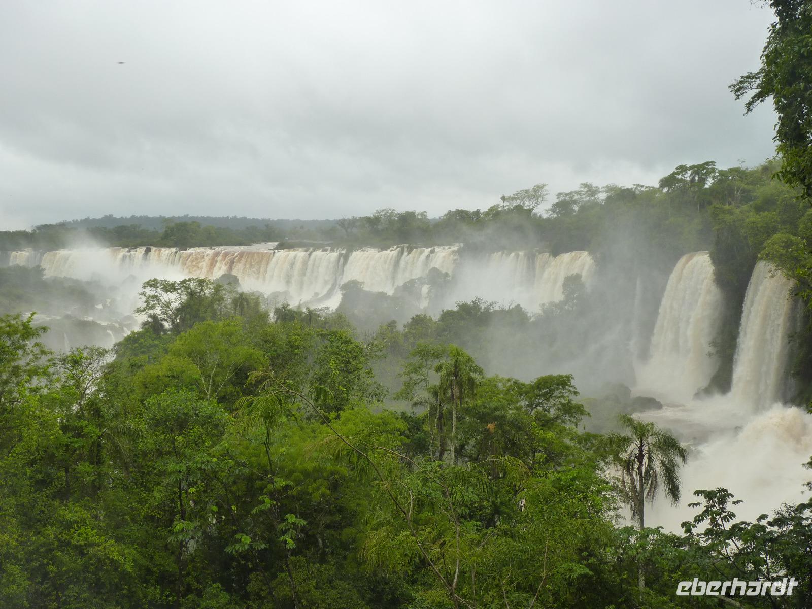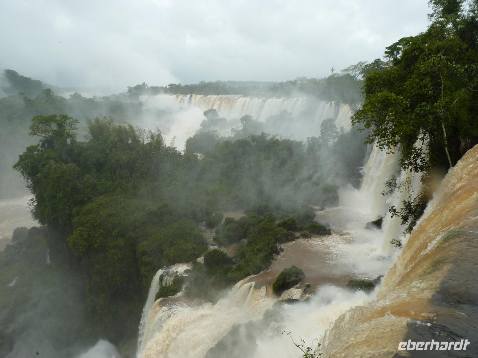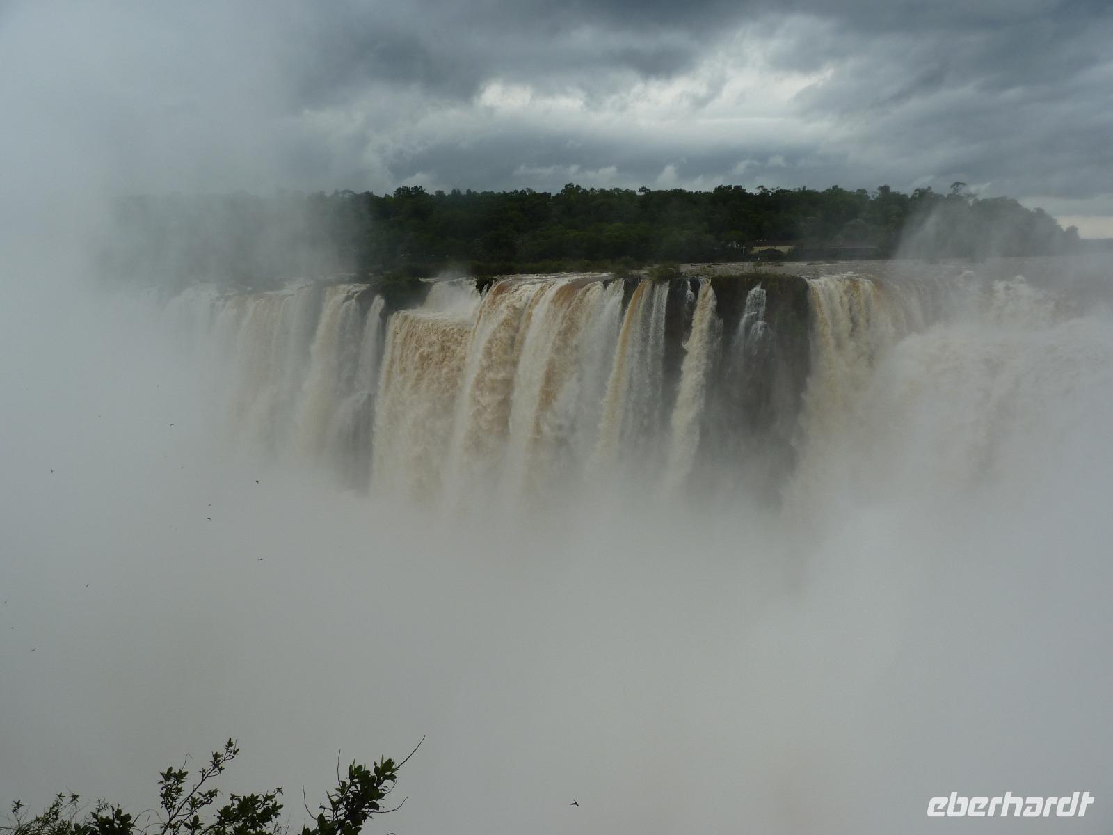 Heute gingen wir fremd. Nach 12 Tagen wechselten wir zu einem Ausflug von Brasilien nach Argentinien über. Die Besichtigung der Wasserfälle des Flusses Iguazu, welche zu den 3 größten ihrer Art weltweit gehören, nahmen wir zuerst auf argentinischer Seite in Angriff. Die Grenzüberfahrt ging recht unkompliziert und schnell vonstatten. Am Nationalpark angekommen, führte unser Weg zuerst zur Kleinbahn, die uns von der nahe dem Eingang gelegenen Central Station zur Teufelsschlucht bringen sollte. Dort bekamen wir einen ersten Eindruck von den gigantischen Wassermassen, die zudem durch die Regenfälle der letzten Wochen deutlich über dem Normalmaß lagen. Da zudem der Wind günstig stand und die Gischt nicht in Richtung Beobachtungsstege bliess, blieben wir recht trocken. Leider änderte sich dies auf dem Rückweg, denn es fing an leicht zu regnen. Wir ließen uns aber nicht davon stören, fuhren zurück zur Cataratas Station, um nach einem kleinen Fußweg den Panoramablick von oben auf die fast 3 km breiten Wasserfälle zu erhalten. Rund 20 größere und über 200 kleinere Wasserfälle vereinten sich zu einem beeindruckenden Naturschauspiel. Einfach großartig. Leider fing es am Ende unseres Besuches im argentinischen Iguazu-Nationalpark stärker an zu regnen, so dass wir uns dann doch beeilten, wieder zu unserem Bus zu kommen. Am Nachmittag unternahm dann unsere Gruppe noch einen kleinen Spaziergang durch den urwüchsigen Hotelpark zu einer Aussichtsplattform am Iguazu-Fluss. Auch heute beendeten wir diesen erlebnisreichen Tag mit einem schönen Abendessen im Restaurant unseres Hotels.