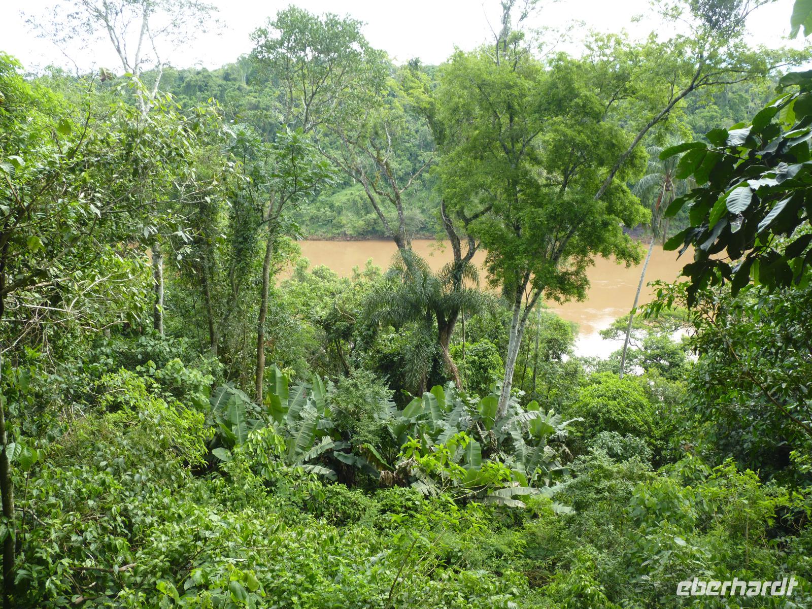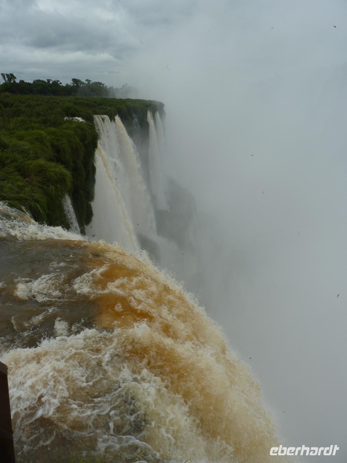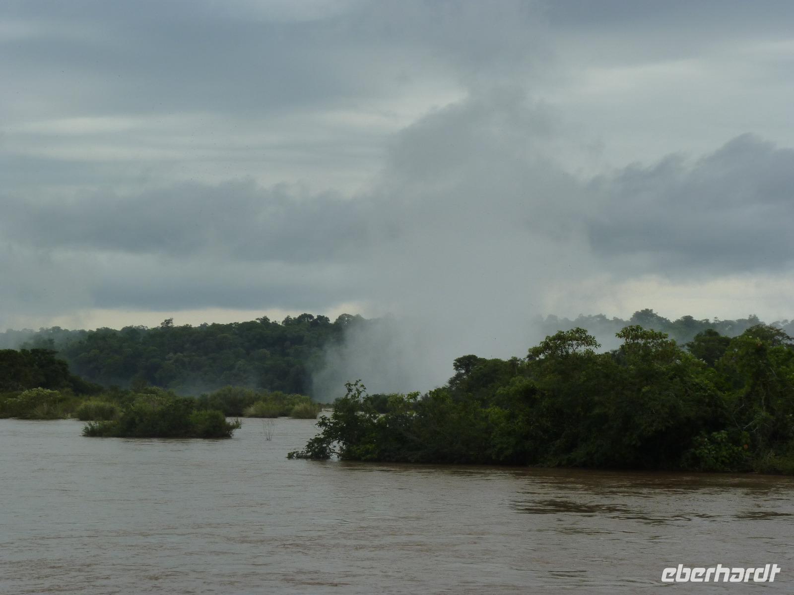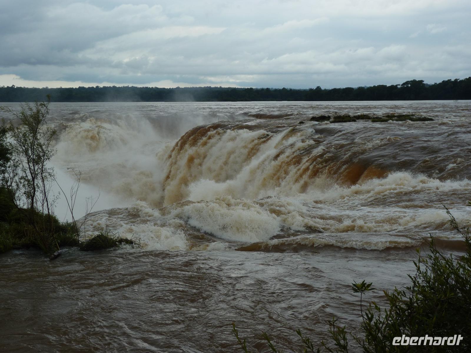 Heute gingen wir fremd. Nach 12 Tagen wechselten wir zu einem Ausflug von Brasilien nach Argentinien über. Die Besichtigung der Wasserfälle des Flusses Iguazu, welche zu den 3 größten ihrer Art weltweit gehören, nahmen wir zuerst auf argentinischer Seite in Angriff. Die Grenzüberfahrt ging recht unkompliziert und schnell vonstatten. Am Nationalpark angekommen, führte unser Weg zuerst zur Kleinbahn, die uns von der nahe dem Eingang gelegenen Central Station zur Teufelsschlucht bringen sollte. Dort bekamen wir einen ersten Eindruck von den gigantischen Wassermassen, die zudem durch die Regenfälle der letzten Wochen deutlich über dem Normalmaß lagen. Da zudem der Wind günstig stand und die Gischt nicht in Richtung Beobachtungsstege bliess, blieben wir recht trocken. Leider änderte sich dies auf dem Rückweg, denn es fing an leicht zu regnen. Wir ließen uns aber nicht davon stören, fuhren zurück zur Cataratas Station, um nach einem kleinen Fußweg den Panoramablick von oben auf die fast 3 km breiten Wasserfälle zu erhalten. Rund 20 größere und über 200 kleinere Wasserfälle vereinten sich zu einem beeindruckenden Naturschauspiel. Einfach großartig. Leider fing es am Ende unseres Besuches im argentinischen Iguazu-Nationalpark stärker an zu regnen, so dass wir uns dann doch beeilten, wieder zu unserem Bus zu kommen. Am Nachmittag unternahm dann unsere Gruppe noch einen kleinen Spaziergang durch den urwüchsigen Hotelpark zu einer Aussichtsplattform am Iguazu-Fluss. Auch heute beendeten wir diesen erlebnisreichen Tag mit einem schönen Abendessen im Restaurant unseres Hotels.