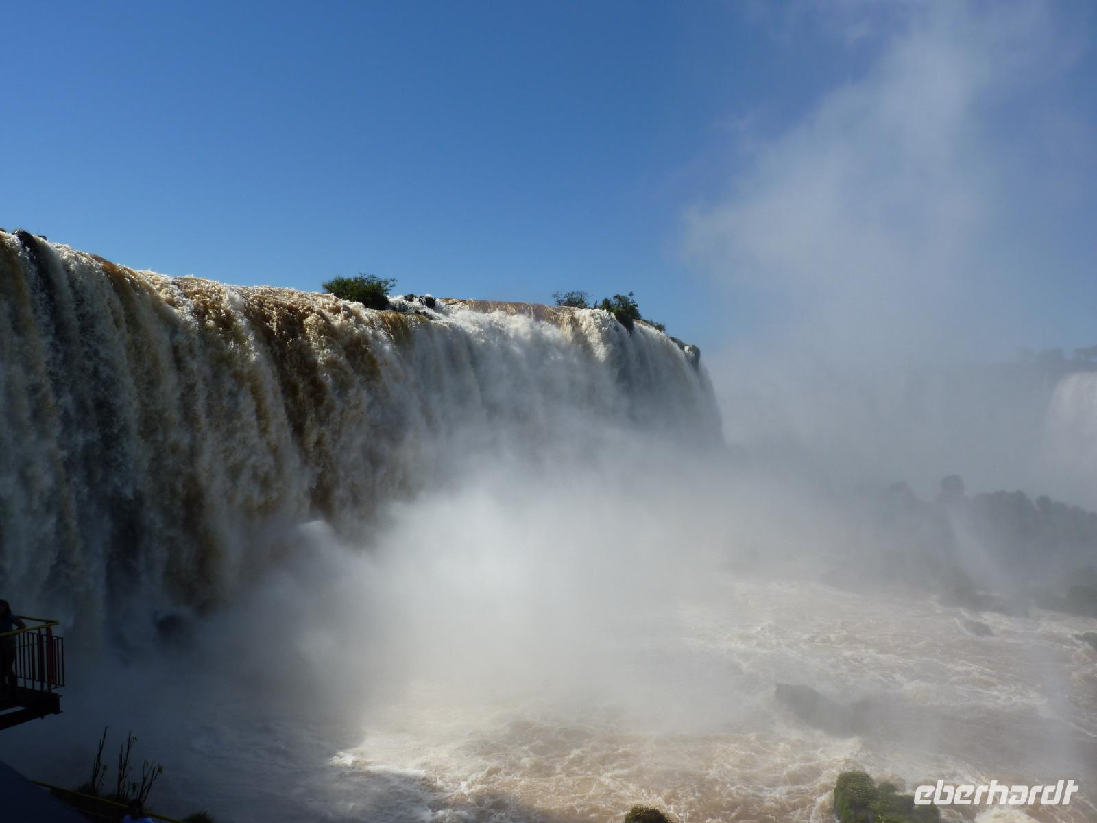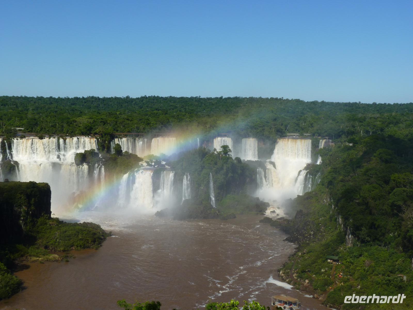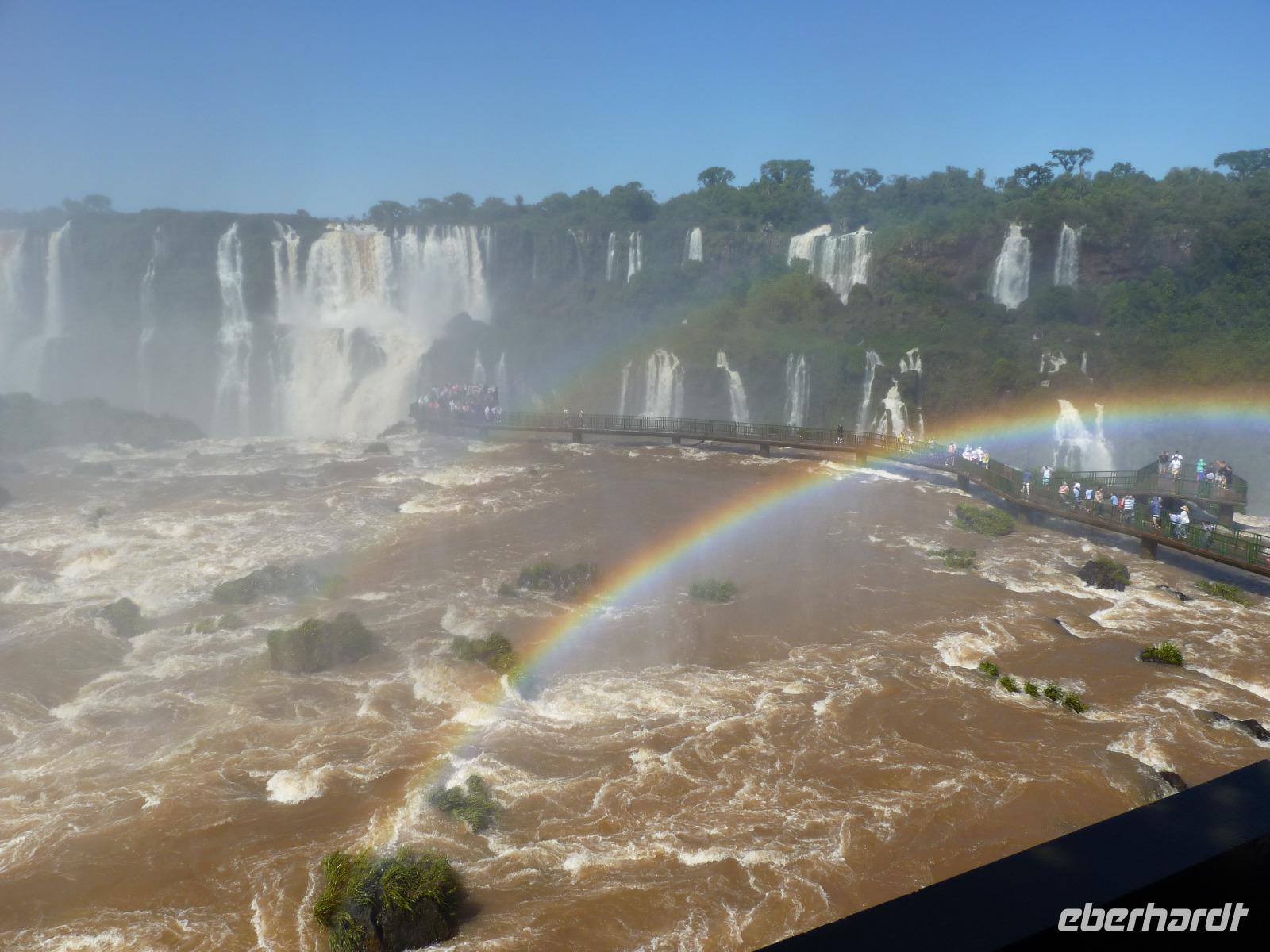 Das brasilianische Wetter zeigte sich noch einmal von seiner schönsten Seite, strahlender Sonnenschein und angenehm warm. Wir hatten nur wenige Minuten zu fahren und schon waren wir am Eingang des Nationalparks, der 1939 und damit 5 Jahre später als sein argentinischer Pendant errichtet wurde. Da an diesem Sonntag der sogenannte Cataratas-Day war, an dem alle Einheimischen kostenlos den Park betreten durften, war der Andrang im Park und den Wasserfällen sehr hoch. Wir fanden aber ausreichend Möglichkeiten, von verschiedenen Standorten aus sehr schöne Fotos von diesen fast 3 km breiten Wassermassen machen zu können. Natürlich durfte bei dem Sonnenschein auch ein Regenbogen nicht fehlen. Es war einfach phantastisch, diese grandiose Naturgewalt zu beobachten. Ganz Mutige hatten dann die Möglichkeit, sich direkt in der Teufelsschlucht der Gischt des herabstürzenden Wassers auszusetzen. Es fühlte sich wie Starkregen an. Ohne Regenschutz war man im nu bis auf die Haut nass. Da es aber sonnig und warm war, hat das nicht wirklich gestört. Es zählte einfach das Erlebnis.