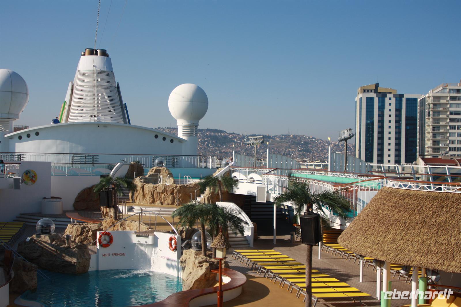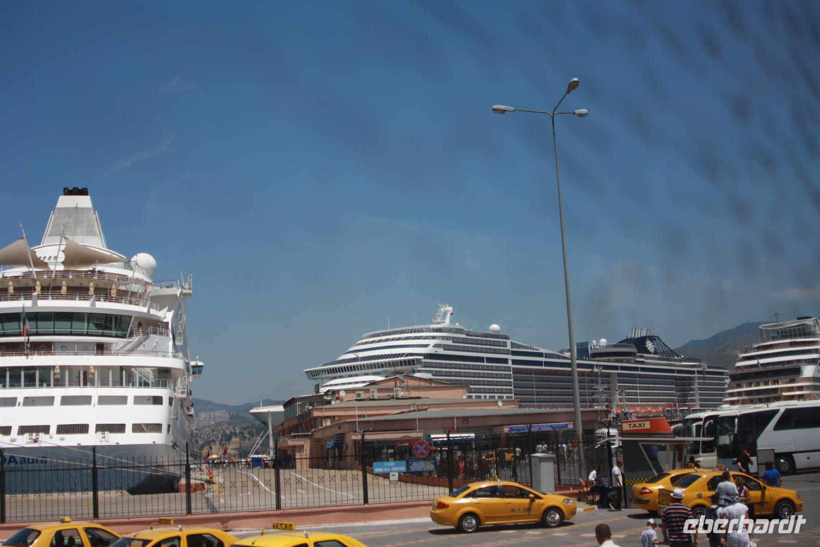 Nach dem leckeren und üppigen Frühstücksbuffet, dass wir in den drei Restaurants zu uns nehmen konnten, hatte man die Möglichkeit an verschiedenen Ausflügen teilzunehmen. Einige Gäste erkundeten die historische Stätte Ephesos, andere erkundeten die lebhafte türkische Stadt Izmir - das einst griechische Smyrna per Bus oder per Rad. Hier besuchte man ebenso die historische Ausgrabungsstätte Agra -einst eine große Markthalle und Kathedrale. Anschließend fuhren wir auf den großen Platz vor dem Rathaus mit Glockenturm, dessen Uhren von Kaiser Wilhelm als Geschenk an das osmanische Reich gelten. In den Nebenstraßen ist reges Leben auf dem Basaren und Geschäften. Am Nachmittag waren wir zurück auf dem Schiff, wer mochte konnte natürlich Izmir auch alleine erkunden. Nachdem wir am Nachmittag ablegten, schwangen am Abend einige Gäste das Tanzbein bei der Poolparty