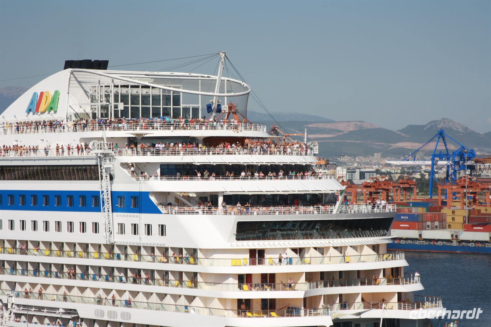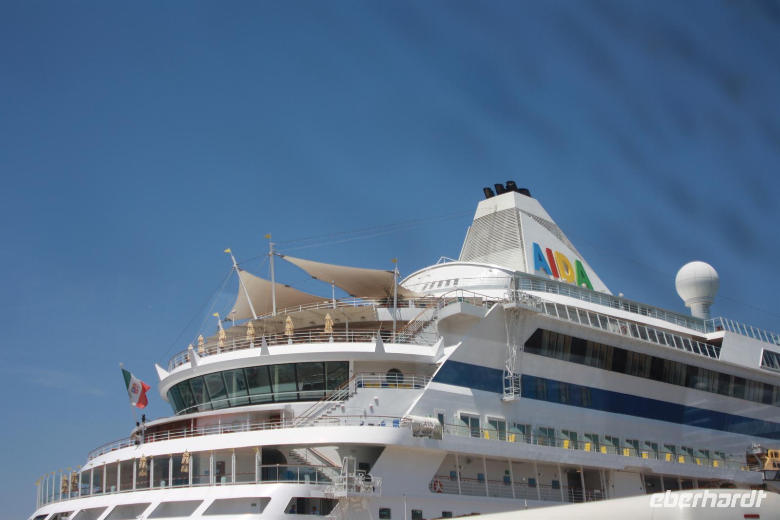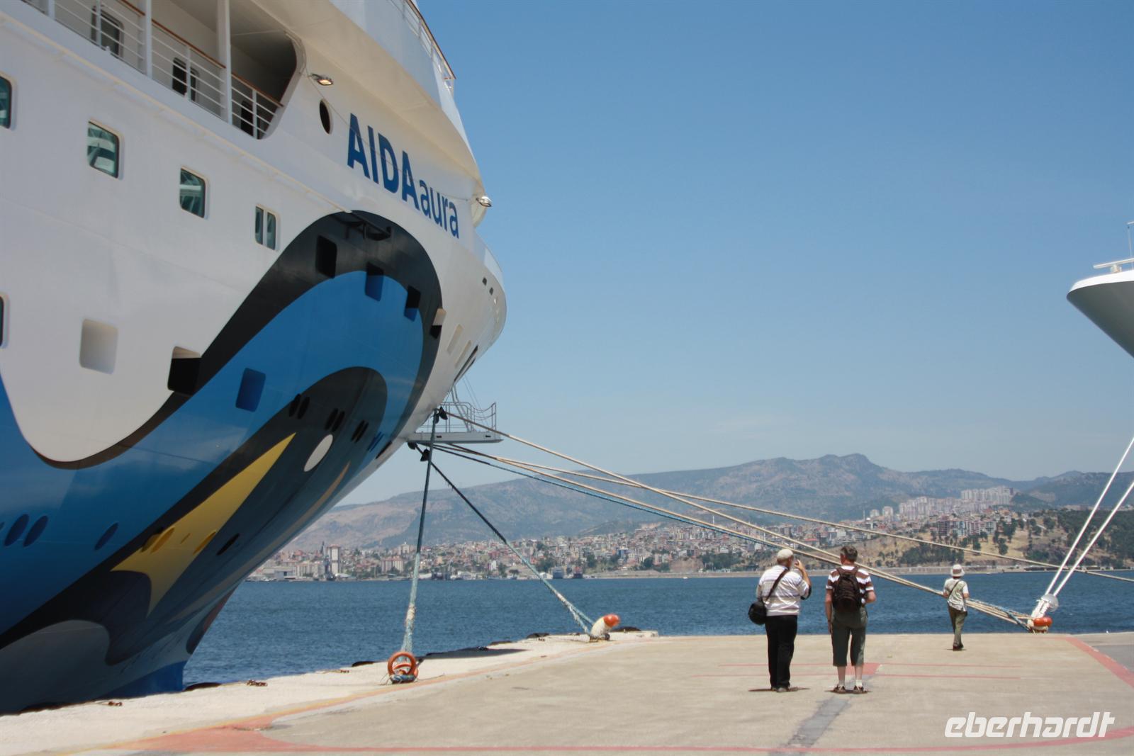 Bereits am frühen Morgen trafen sich die 25 Gäste der Eberhardt-Reisegruppe am Flughafen Dresden um gemeinsam nach Antalya zu fliegen. Da das Essen auf Kurzstreckenflügen ja bekanntlich kein kulinarischer Höhepunkt ist, hat Eberhardt TRAVEL ein paar leckere Frühstücksbrötchen und frischen Kaffee im Restaurant Chili im Flughafen bestellt. So begannen wir den 4-Stunden-Flug nach Antalya gut gestärkt. Bei heißen Temperaturen verließen wir den Flughafen Antalya um mit einem separaten Reisebus zum Passagierhafen Antalya zu fahren. Schon aus dem Flugzeug bestaunten wir die gigantischen Bergketten der Türkei, welche zu mehr als 50 % aus Gebirge (über 1000 Meter) besteht. Bereits am frühen Nachmittag konnten wir auf der AIDAaura einchecken und aufsteigen. Wir gingen direkt zum Mittagessen in eines der 3-Restaurants die uns zur Verfügung standen und nur einige Minuten später konnten wir bereits unsere Kabinen beziehen. Auch unser Gepäck kam früher als erwartet und so blieb uns mehr Zeit um das Schiff zu erkunden. Am Abend kamen wir zum Essen zusammen und stimmten uns auf eine schöne Reise ein. Bereits bevor die AIDAaura in Antalya den Hafen verließ probten wir den Ernstfall und waren erfreut darüber wie routiniert und gesittet die Seenotrettungsübung von statten ging. Auf dem Sonnendeck begrüßten die Crewmitglieder alle Gäste mit Sekt, Tanz, Musik und Lasershow.
