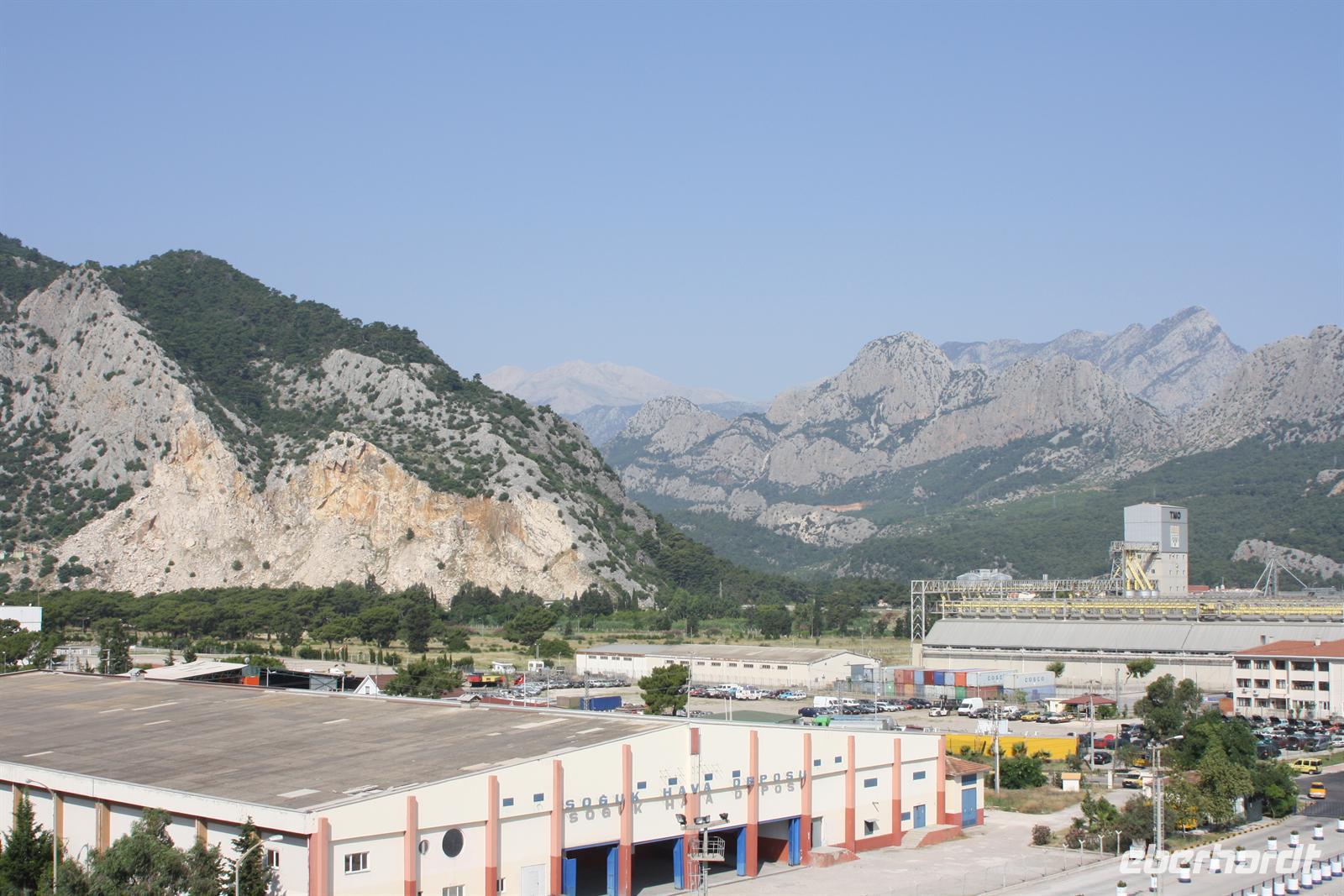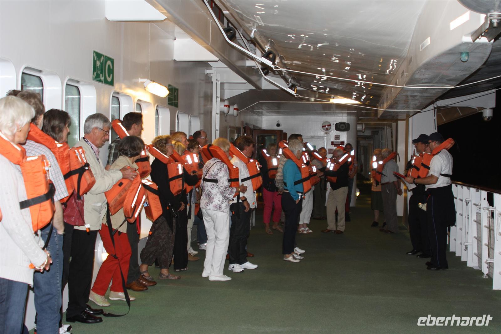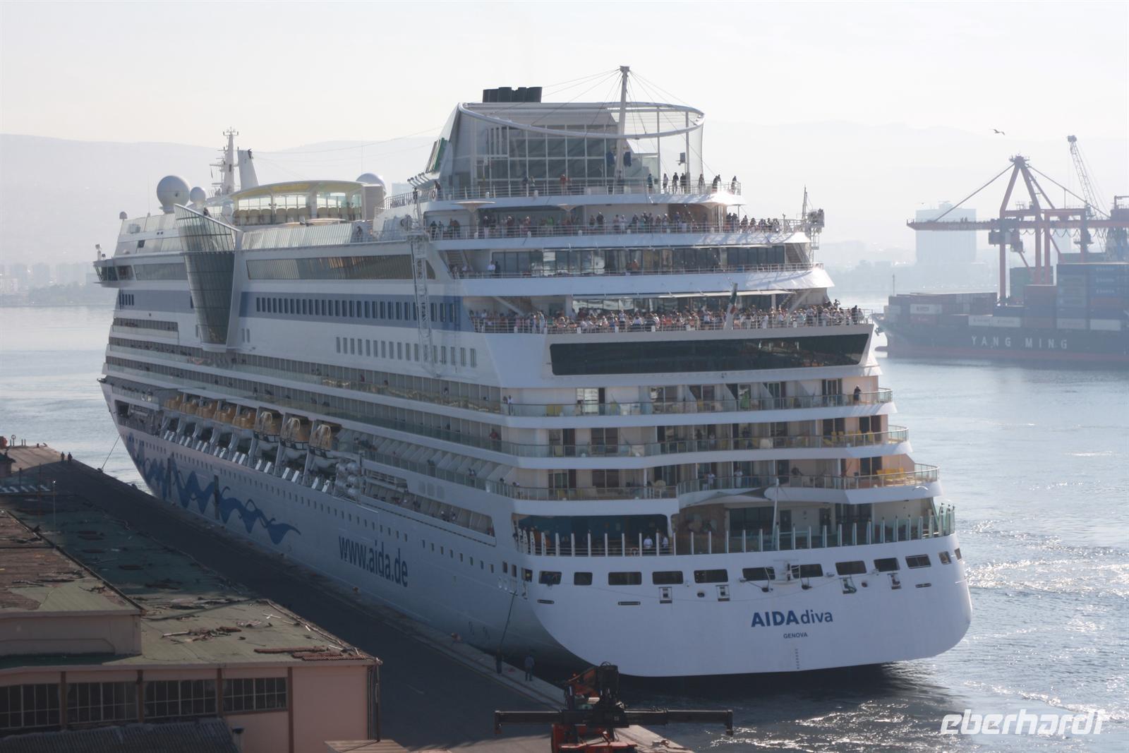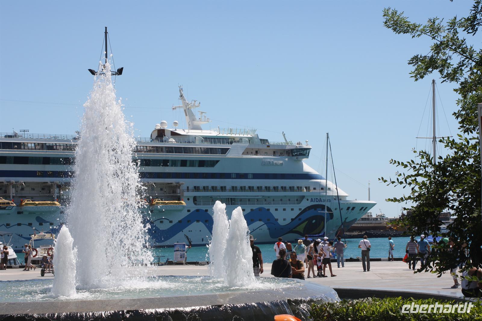 Bereits am frühen Morgen trafen sich die 25 Gäste der Eberhardt-Reisegruppe am Flughafen Dresden um gemeinsam nach Antalya zu fliegen. Da das Essen auf Kurzstreckenflügen ja bekanntlich kein kulinarischer Höhepunkt ist, hat Eberhardt TRAVEL ein paar leckere Frühstücksbrötchen und frischen Kaffee im Restaurant Chili im Flughafen bestellt. So begannen wir den 4-Stunden-Flug nach Antalya gut gestärkt. Bei heißen Temperaturen verließen wir den Flughafen Antalya um mit einem separaten Reisebus zum Passagierhafen Antalya zu fahren. Schon aus dem Flugzeug bestaunten wir die gigantischen Bergketten der Türkei, welche zu mehr als 50 % aus Gebirge (über 1000 Meter) besteht. Bereits am frühen Nachmittag konnten wir auf der AIDAaura einchecken und aufsteigen. Wir gingen direkt zum Mittagessen in eines der 3-Restaurants die uns zur Verfügung standen und nur einige Minuten später konnten wir bereits unsere Kabinen beziehen. Auch unser Gepäck kam früher als erwartet und so blieb uns mehr Zeit um das Schiff zu erkunden. Am Abend kamen wir zum Essen zusammen und stimmten uns auf eine schöne Reise ein. Bereits bevor die AIDAaura in Antalya den Hafen verließ probten wir den Ernstfall und waren erfreut darüber wie routiniert und gesittet die Seenotrettungsübung von statten ging. Auf dem Sonnendeck begrüßten die Crewmitglieder alle Gäste mit Sekt, Tanz, Musik und Lasershow.
