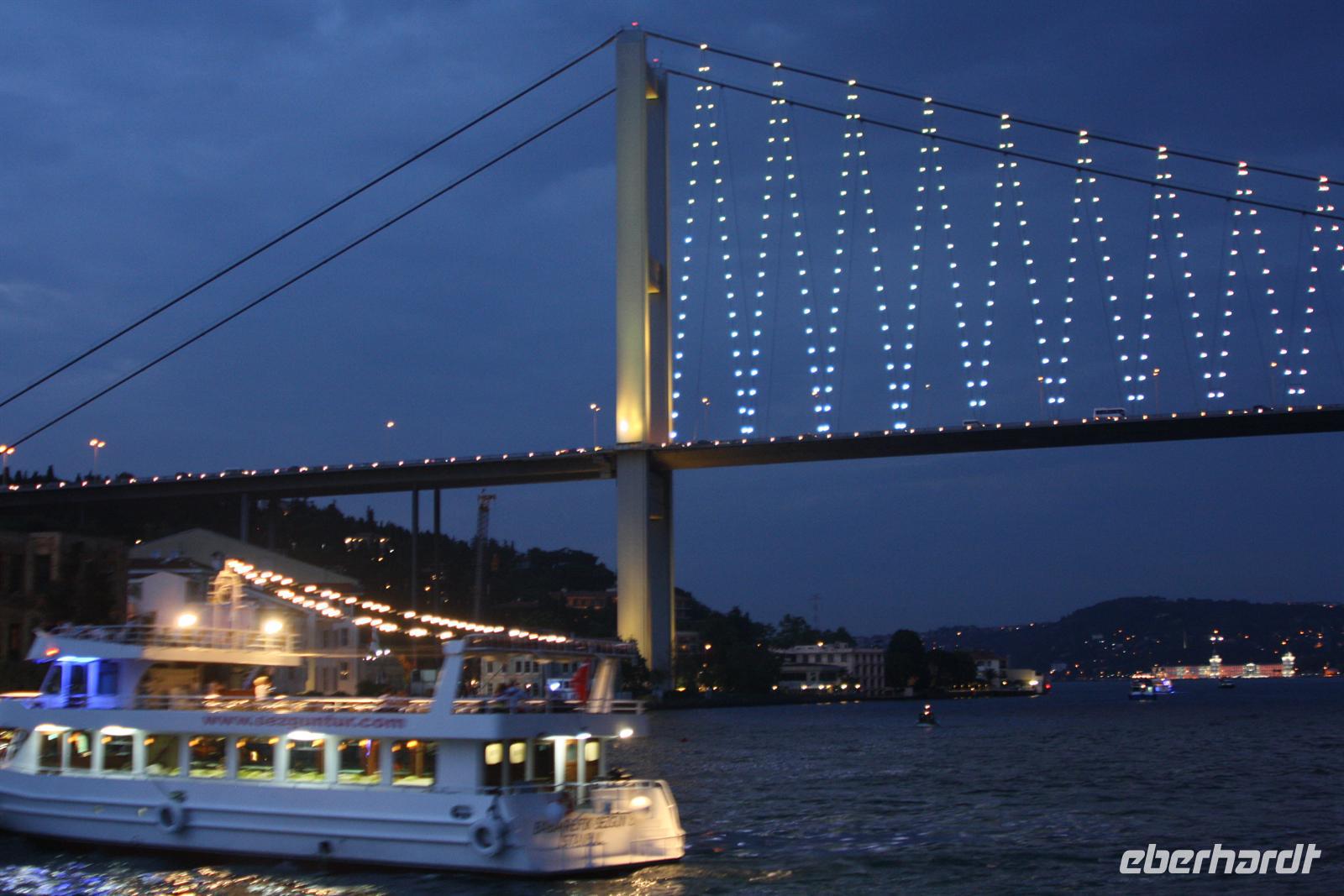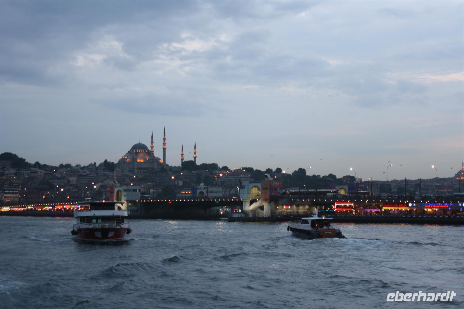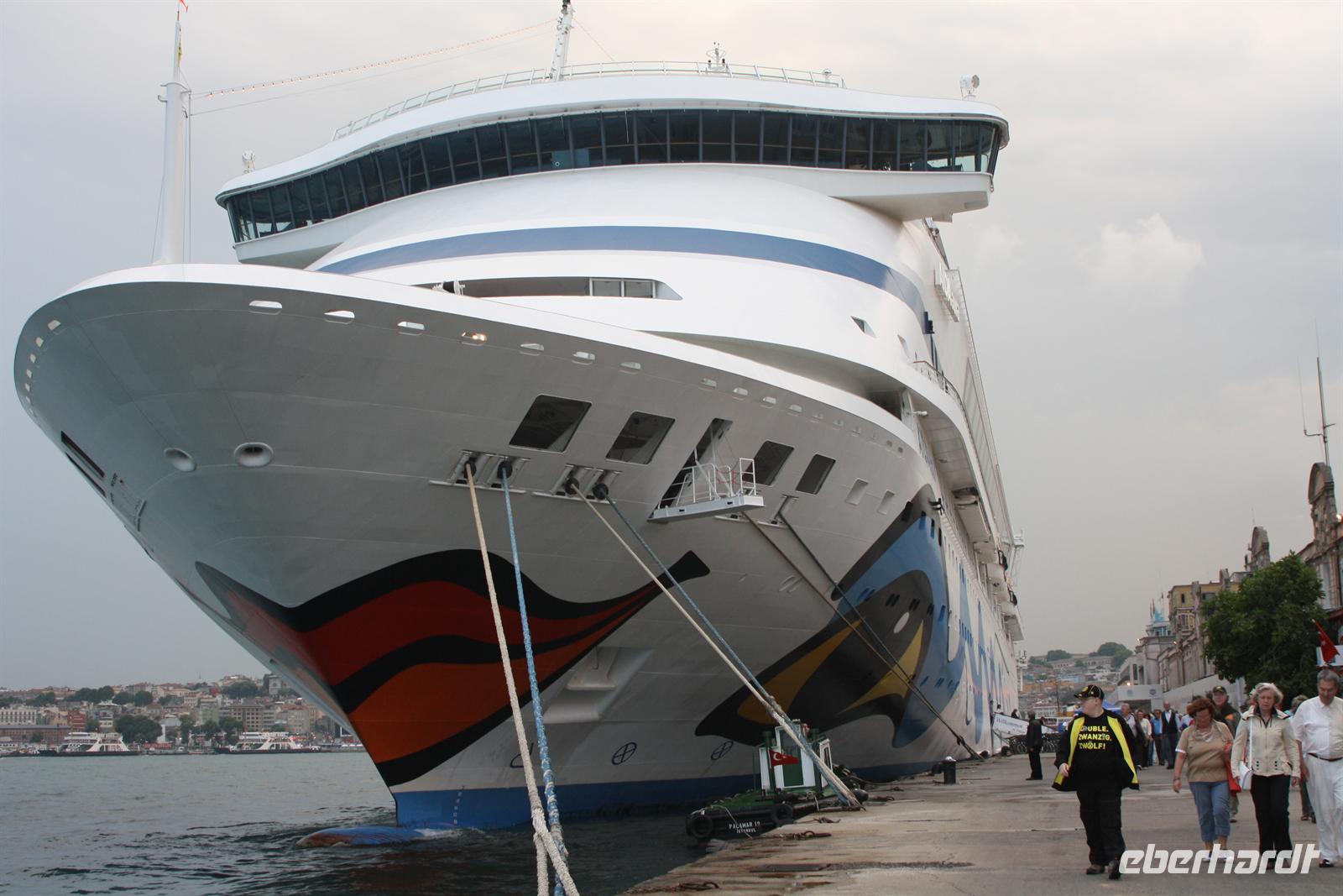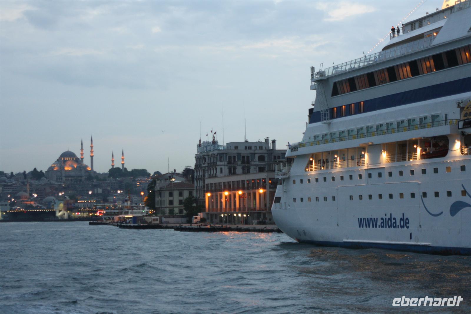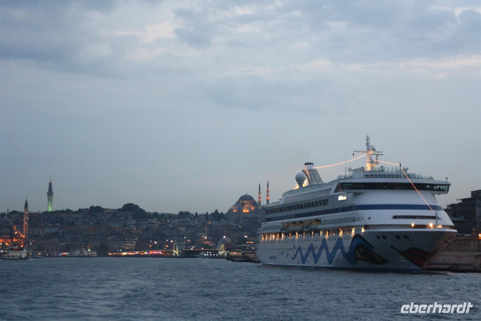 Nach dem Frühstück, dass für Langschläfer auch bis 11.00 Uhr geboten wird, konnte man den Tag auf dem Pooldeck genießen oder sich bei einem Vortrag über Istanbul auf die bedeutende Stadt einstimmen. Am Mittag versammelte man sich auf dem Pooldeck, um die spektakuläre Einfahrt in Istanbul und den Bosporus zu bekommen. Die Moderation des Lektors Gerrit Aust zu Istanbul und den Sehenswürdigkeiten rundete dieses einmalige Erlebnis ab. Nach dem Anlegen erkundete man die umliegenden Sehenswürdigkeiten, wie die Einkaufsstraße „Istiklal“ mit seiner historischen Straßenbahn oder den Galataturm, einen der ältesten in der ganzen Welt. Durch den guten Liegeplatz der AIDAaura hatte man auch die Möglichkeit die bunten und duftenden Gewürze auf dem naheliegenden Basar zu erleben. Auch die asiatische Seite mit unbekannten Schönheiten, Parkanlagen und Gebäuden konnte man bei einem AIDA Ausflug entdecken. Am Abend begaben sich viele Gäste auf eine abendliche Bootsfahrt den Bosporus hinauf. Vorbei an illuminierten Prachtbauten auf europäischer, sowie asiatischer Seite , bis hinauf in das alte Fischerdorf und unter der bunt leuchtenden Bosporusbrücke hindurch.