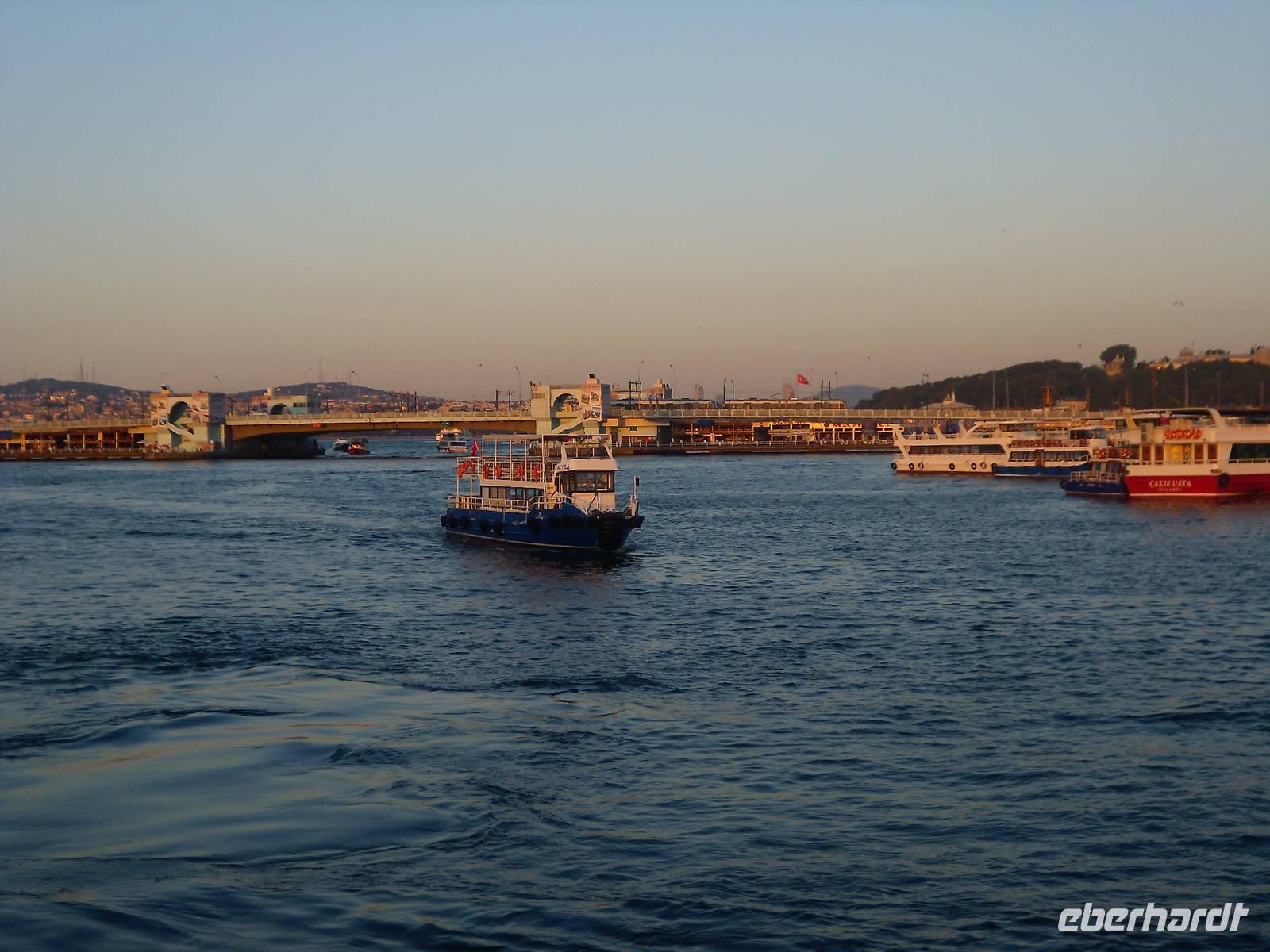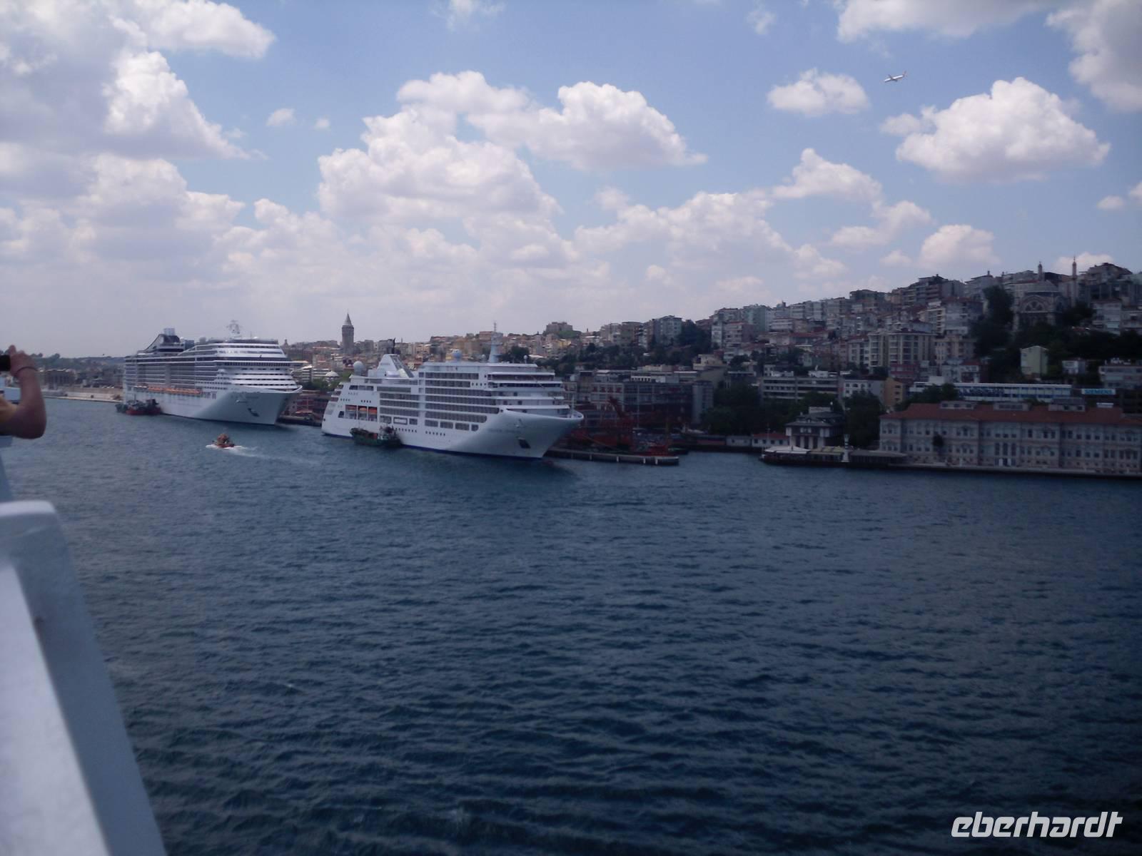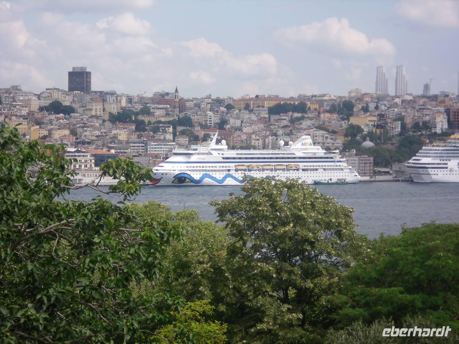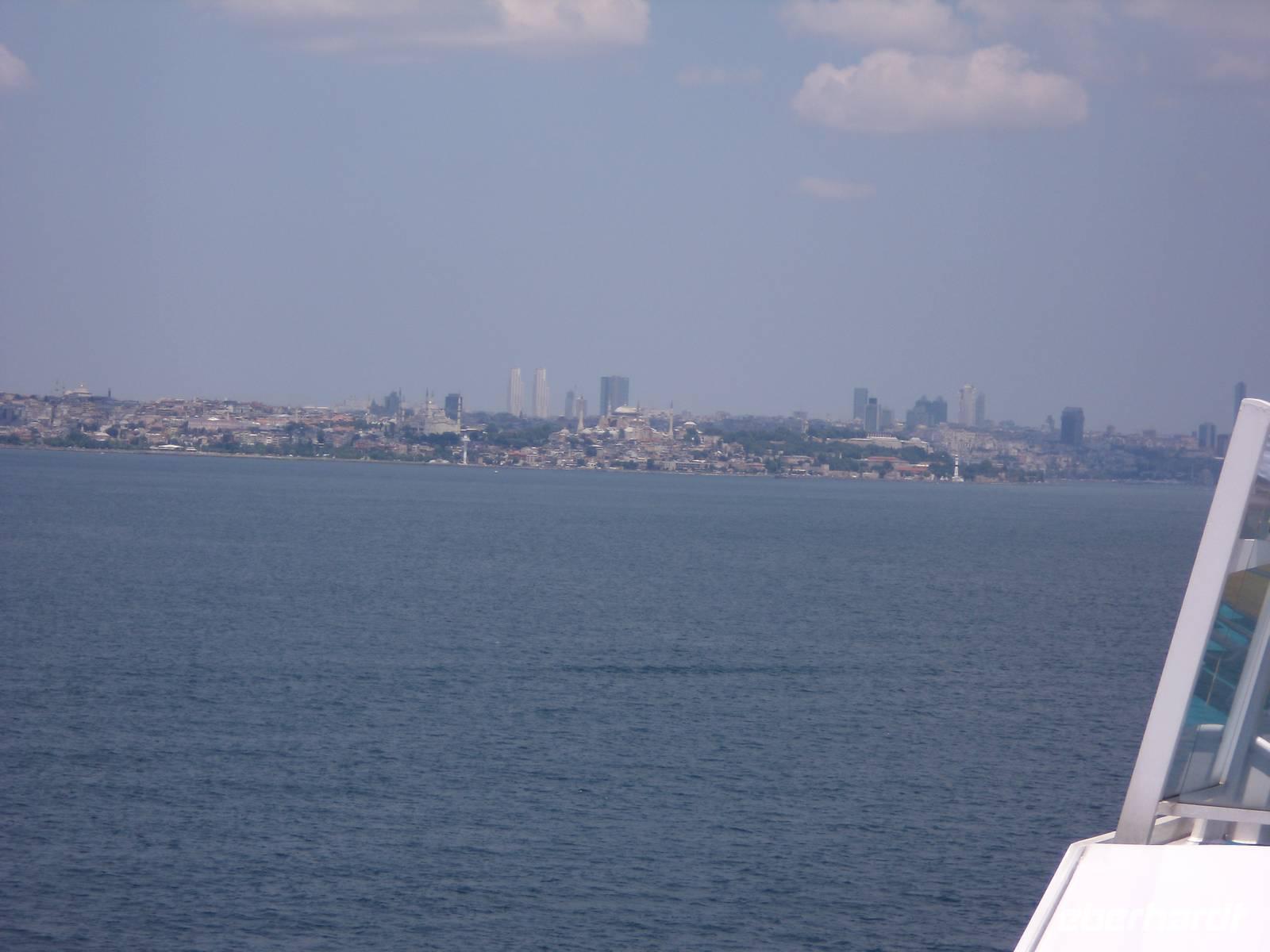 Leider war das in der Botschaft, wie das tägliche Prospekt von AIDA bei meinen Gästen genannt wurde, nicht so beschrieben das es sich darauf schließen ließ, dass es sich bei dem Künstler am Vortag um einen Travestie hielt, sonst wären mehrere aus unserer Reisegruppe im Theater gewesen. Aber davon ließen wir uns unsere gute Laune nicht nehmen und freuten uns auf, ich glaube das Highlight überhaupt während unserer Kreuzfahrt. Mit voller Kraft, also 21 Knoten, steuerte uns die Crew um unseren Kapitän bestens unterhalten nach Istanbul. Die Einfahrt vom Meer wurde mit netten Kommentaren eines Crewmitgliedes unterlegt, so wussten wir immer ganz genau was vor uns lag. Vorbei an der Sultan-Ahmet-Moschee, der Hagia Sophia und dem Topkapi-Palast erreichten wir zum zeitigen Nachmittag nach 267 Seemeilen die einzige Metropole auf zwei Kontinenten. Viele nutzten die Gelegenheit und erkundeten den Stadtteil Karaköy schon mal zu Fuß, ehe es abends für die meisten von uns auf den gebuchten Ausflug ging. Nach dem Abendessen bei untergehender Sonne hatten viele uns ihre gebuchten Ausflüge. Die pulsierende Stadt am Abend kennen lernen, das war unser Plan und so faszinierte uns die schillernde Stadt bei Nacht zu Wasser oder zu Land. Ein wenig abgeändert wurde das Programm durch die aktuell herrschenden Bedingungen in Istanbul, den Protesten am Taksim-Platz. Die Sicherheit stand an oberster Stelle und so bekamen wir die Freizeit nach einer abendlichen Bootsfahrt in einem anderen Stadtteil wie vorher beschrieben, doch damit hatte keiner von uns ein Problem und so genossen wir den angenehm warmen Abend in der Stadt.
