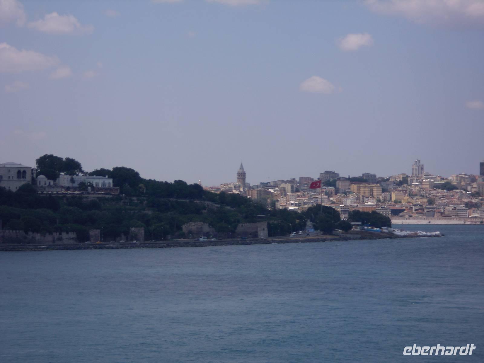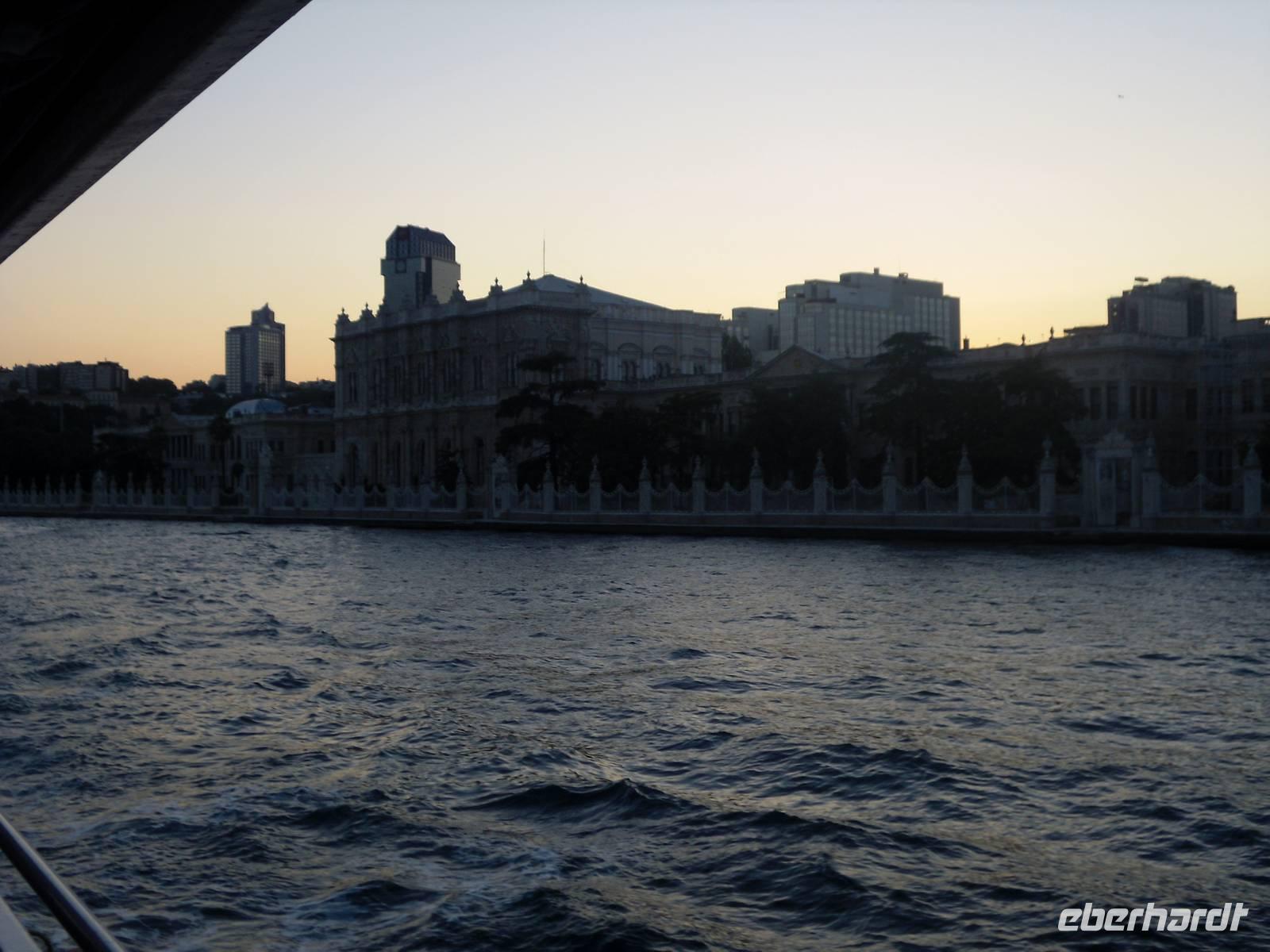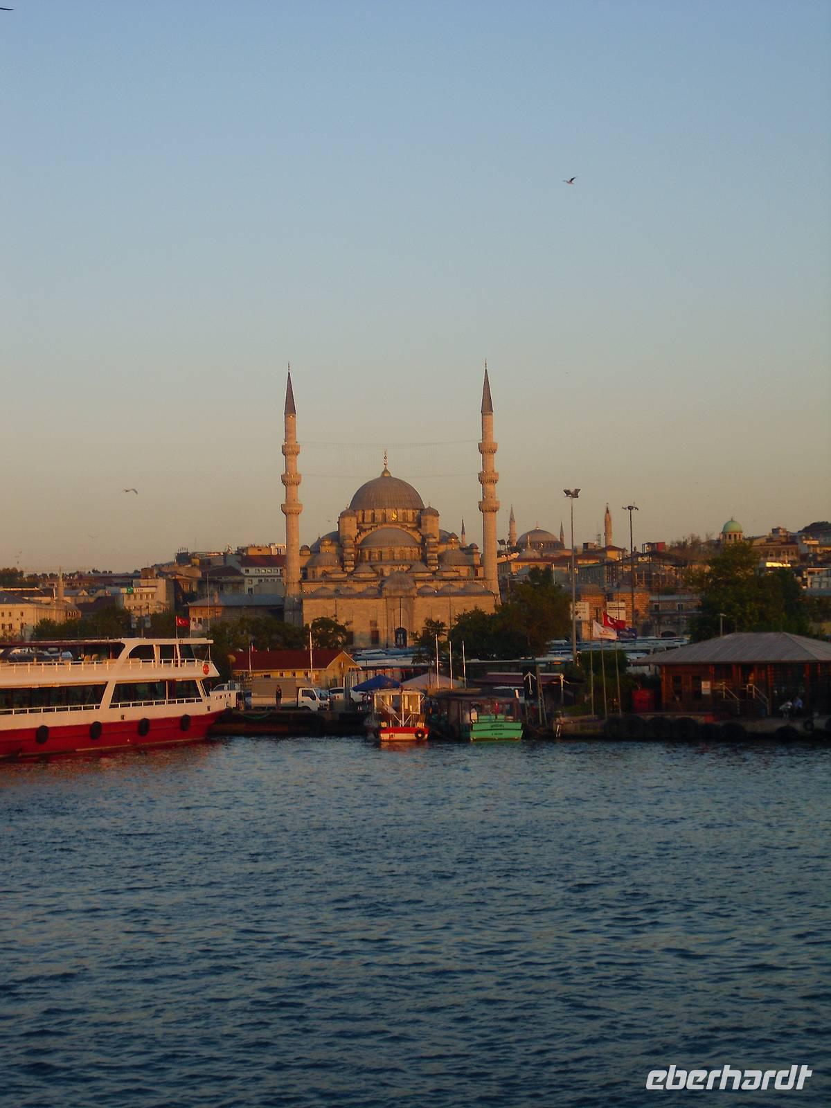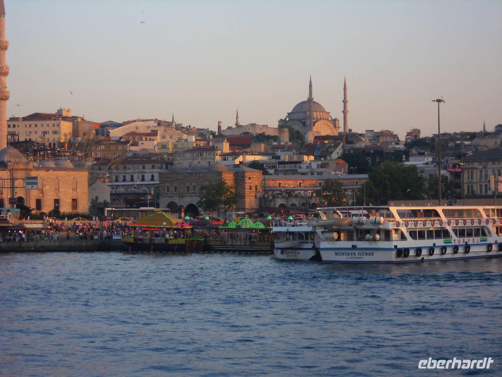 Leider war das in der Botschaft, wie das tägliche Prospekt von AIDA bei meinen Gästen genannt wurde, nicht so beschrieben das es sich darauf schließen ließ, dass es sich bei dem Künstler am Vortag um einen Travestie hielt, sonst wären mehrere aus unserer Reisegruppe im Theater gewesen. Aber davon ließen wir uns unsere gute Laune nicht nehmen und freuten uns auf, ich glaube das Highlight überhaupt während unserer Kreuzfahrt. Mit voller Kraft, also 21 Knoten, steuerte uns die Crew um unseren Kapitän bestens unterhalten nach Istanbul. Die Einfahrt vom Meer wurde mit netten Kommentaren eines Crewmitgliedes unterlegt, so wussten wir immer ganz genau was vor uns lag. Vorbei an der Sultan-Ahmet-Moschee, der Hagia Sophia und dem Topkapi-Palast erreichten wir zum zeitigen Nachmittag nach 267 Seemeilen die einzige Metropole auf zwei Kontinenten. Viele nutzten die Gelegenheit und erkundeten den Stadtteil Karaköy schon mal zu Fuß, ehe es abends für die meisten von uns auf den gebuchten Ausflug ging. Nach dem Abendessen bei untergehender Sonne hatten viele uns ihre gebuchten Ausflüge. Die pulsierende Stadt am Abend kennen lernen, das war unser Plan und so faszinierte uns die schillernde Stadt bei Nacht zu Wasser oder zu Land. Ein wenig abgeändert wurde das Programm durch die aktuell herrschenden Bedingungen in Istanbul, den Protesten am Taksim-Platz. Die Sicherheit stand an oberster Stelle und so bekamen wir die Freizeit nach einer abendlichen Bootsfahrt in einem anderen Stadtteil wie vorher beschrieben, doch damit hatte keiner von uns ein Problem und so genossen wir den angenehm warmen Abend in der Stadt.