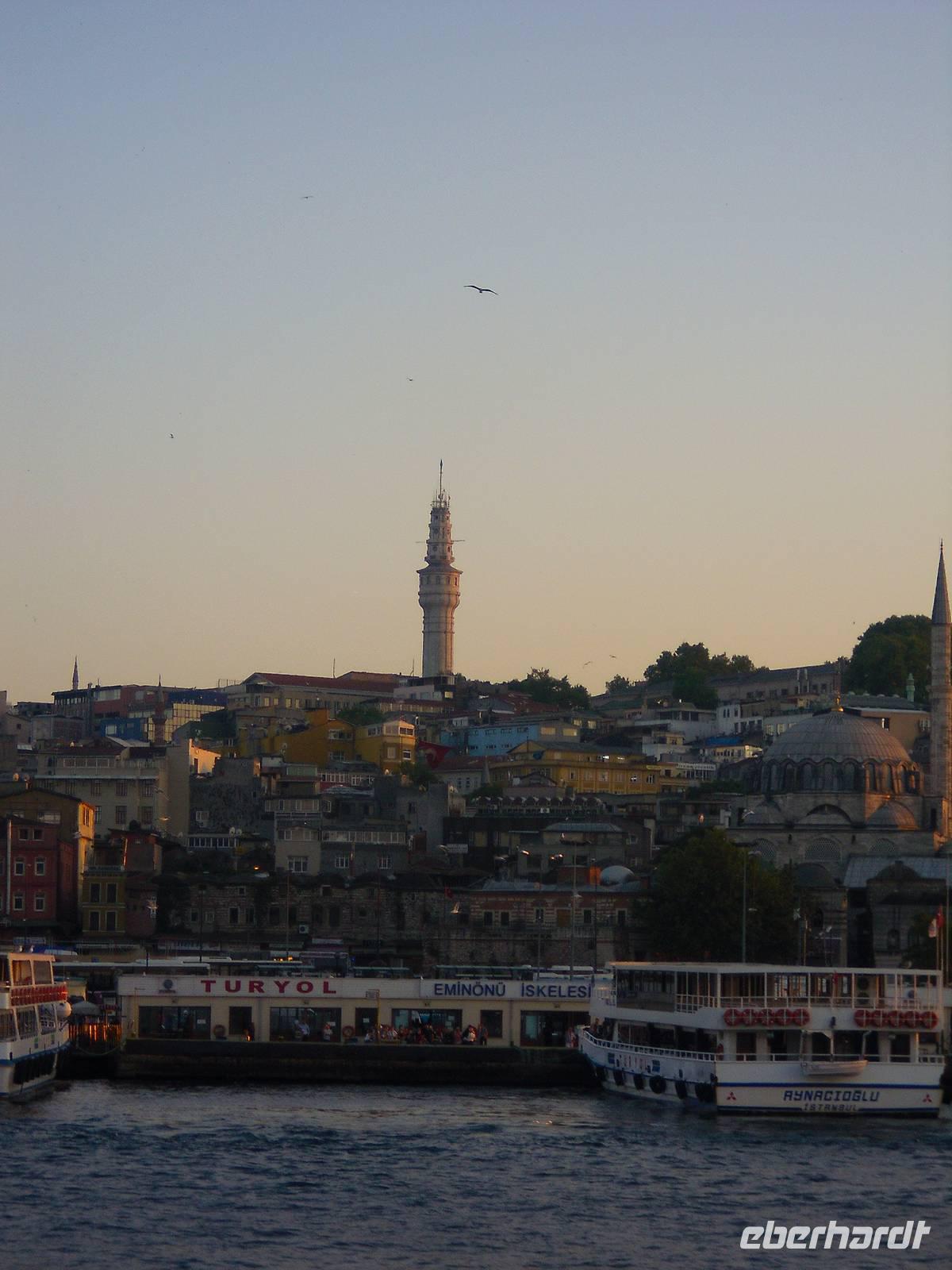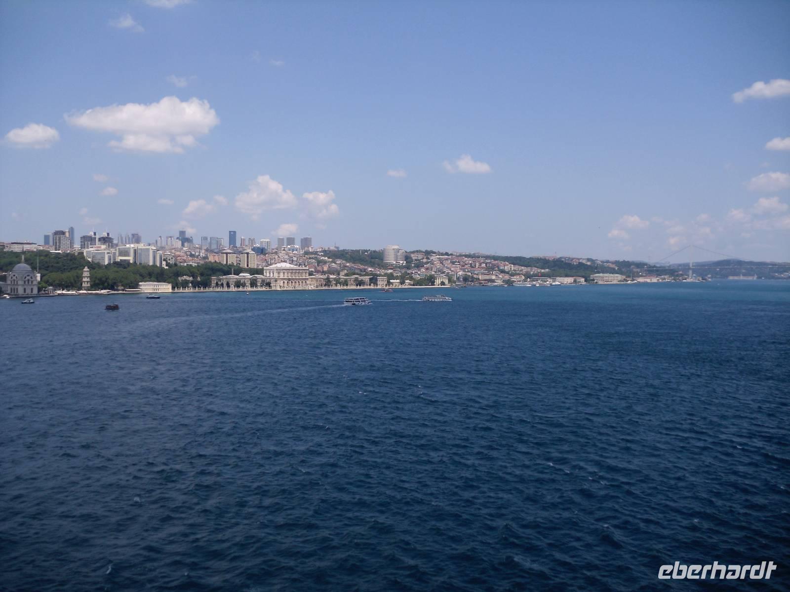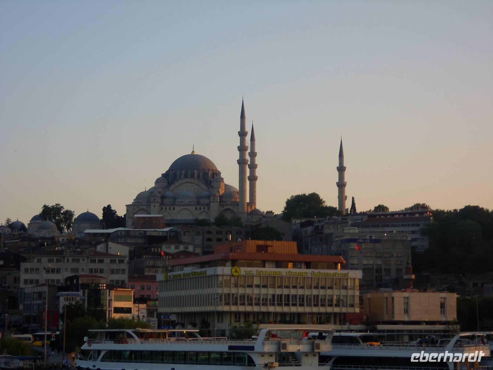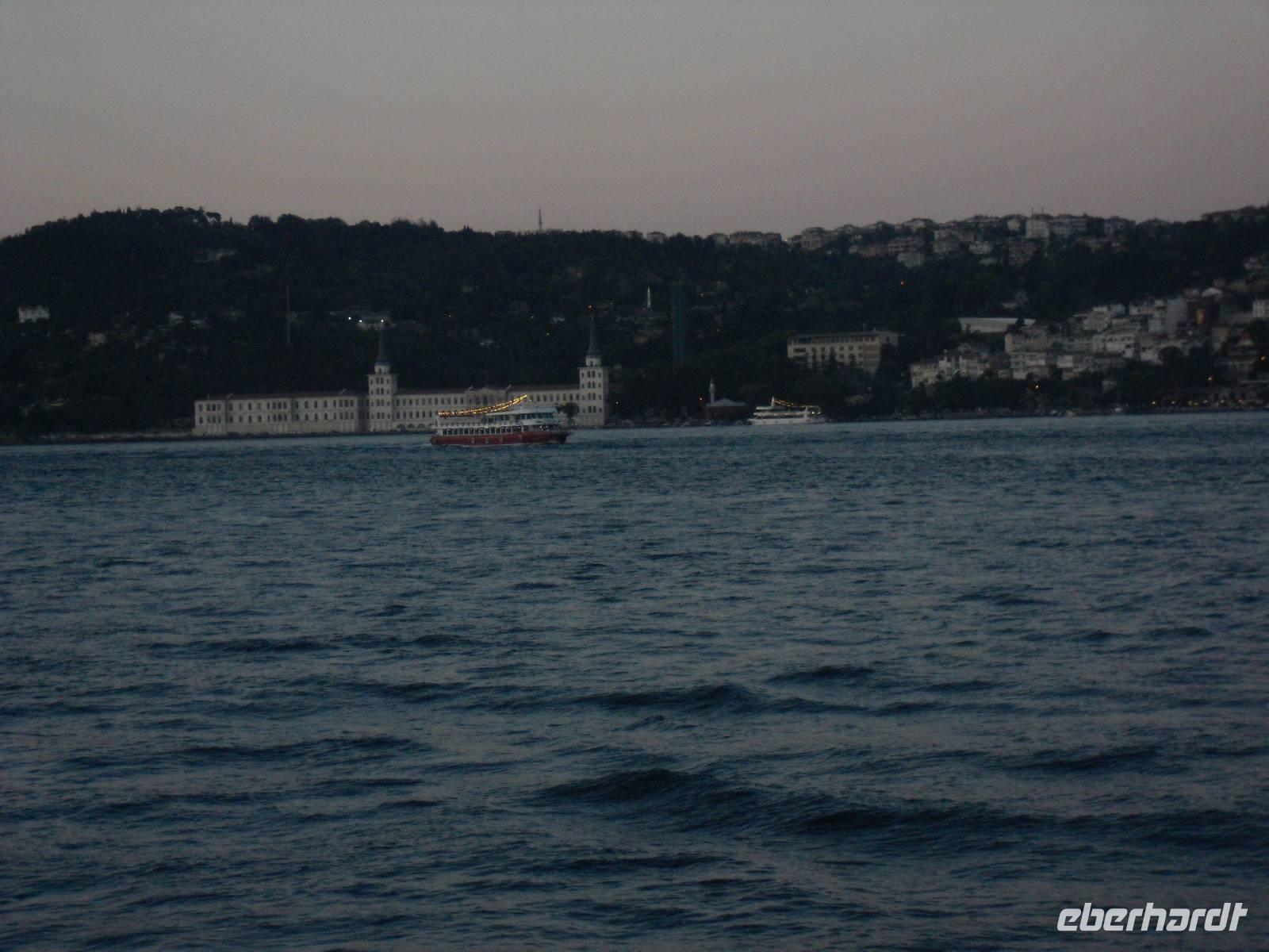 Leider war das in der Botschaft, wie das tägliche Prospekt von AIDA bei meinen Gästen genannt wurde, nicht so beschrieben das es sich darauf schließen ließ, dass es sich bei dem Künstler am Vortag um einen Travestie hielt, sonst wären mehrere aus unserer Reisegruppe im Theater gewesen. Aber davon ließen wir uns unsere gute Laune nicht nehmen und freuten uns auf, ich glaube das Highlight überhaupt während unserer Kreuzfahrt. Mit voller Kraft, also 21 Knoten, steuerte uns die Crew um unseren Kapitän bestens unterhalten nach Istanbul. Die Einfahrt vom Meer wurde mit netten Kommentaren eines Crewmitgliedes unterlegt, so wussten wir immer ganz genau was vor uns lag. Vorbei an der Sultan-Ahmet-Moschee, der Hagia Sophia und dem Topkapi-Palast erreichten wir zum zeitigen Nachmittag nach 267 Seemeilen die einzige Metropole auf zwei Kontinenten. Viele nutzten die Gelegenheit und erkundeten den Stadtteil Karaköy schon mal zu Fuß, ehe es abends für die meisten von uns auf den gebuchten Ausflug ging. Nach dem Abendessen bei untergehender Sonne hatten viele uns ihre gebuchten Ausflüge. Die pulsierende Stadt am Abend kennen lernen, das war unser Plan und so faszinierte uns die schillernde Stadt bei Nacht zu Wasser oder zu Land. Ein wenig abgeändert wurde das Programm durch die aktuell herrschenden Bedingungen in Istanbul, den Protesten am Taksim-Platz. Die Sicherheit stand an oberster Stelle und so bekamen wir die Freizeit nach einer abendlichen Bootsfahrt in einem anderen Stadtteil wie vorher beschrieben, doch damit hatte keiner von uns ein Problem und so genossen wir den angenehm warmen Abend in der Stadt.