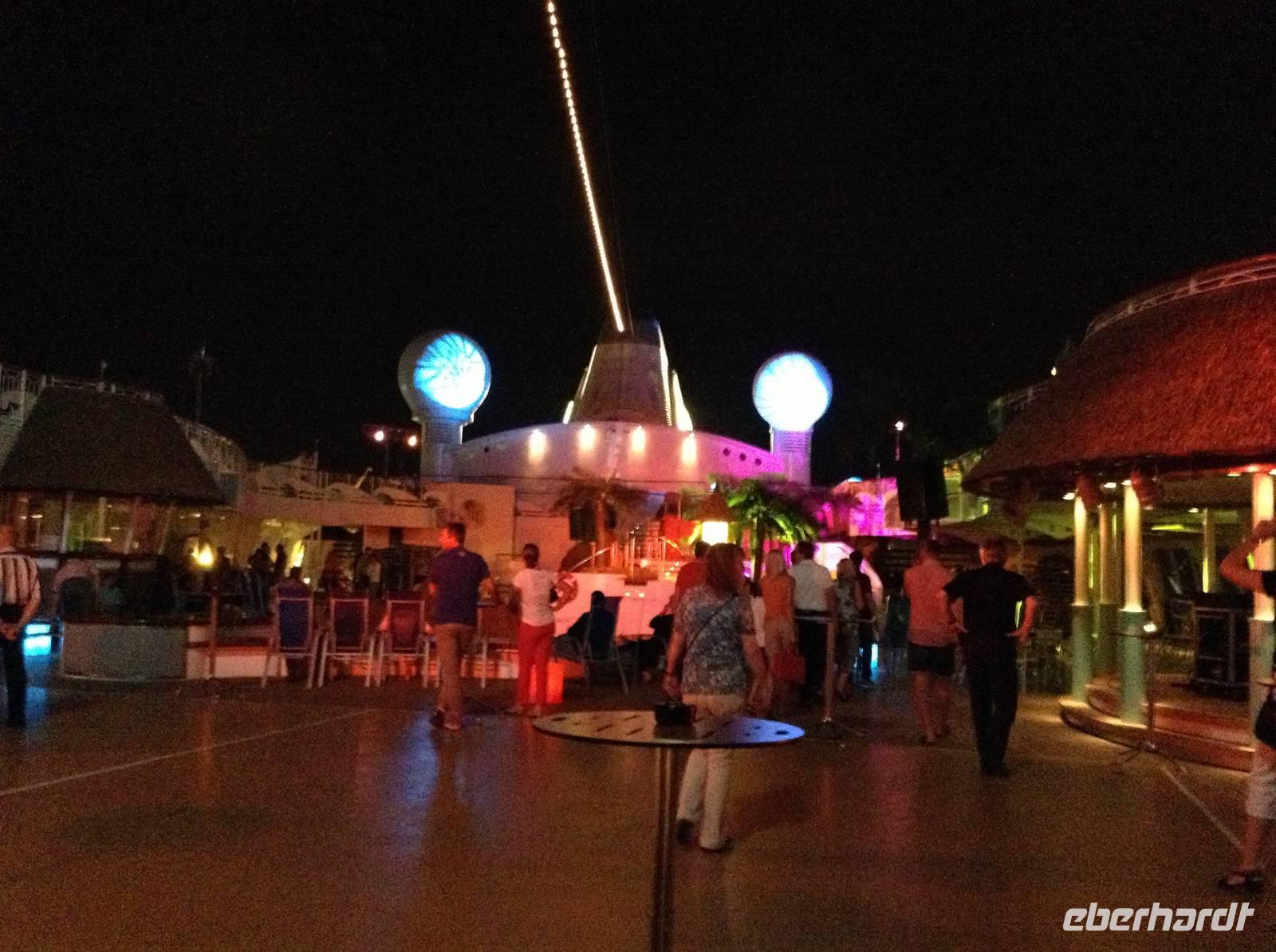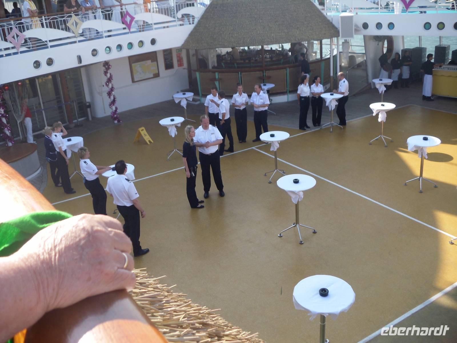 Am frühen Morgen begrüßte uns als erstes die Sonne und ehe wir merkten, dass es das Schiff war welches ein wenig schaukelte und nicht wir am Vortag zu viel getrunken hatten, dauerte es einen kurzen Augenblick. Doch alles verlief gut und wir genossen den ersten richtigen Tag auf hoher See. Zum angewöhnen an das Klima war es gut, dass wir nicht gleich im nächsten Hafen ankamen. Um die Annehmlichkeiten an Bord besser kennen zu lernen, hatte ich meine Gäste zu einem Sektempfang mit anschließendem Schiffsrundgang eingeladen. Viele folgten auch meiner Einladung, was mir die Möglichkeit gab mich zu erkundigen wie die erste Nacht auf dem Schiff war. Nach dem Rundgang wurde die Zeit wieder von jedem individuell genutzt. Die einen genossen die Sonne auf dem Pooldeck, andere waren lieber im Schatten und manche genossen die lockere Atmosphäre an Bord eines Clubschiffes. Zum Abendessen versammelten wir uns wieder vor dem Restaurant und gingen anschließend mit denen die wollten ins Theater um die Kapitän- und Offiziersvorstellung nicht zu verpassen. Pedro, unser Captain, stellte sich vor und wir erfuhren, dass er, wenn er nicht gerade auf den Weltmeeren herumschippert in Suhl zu Hause war.