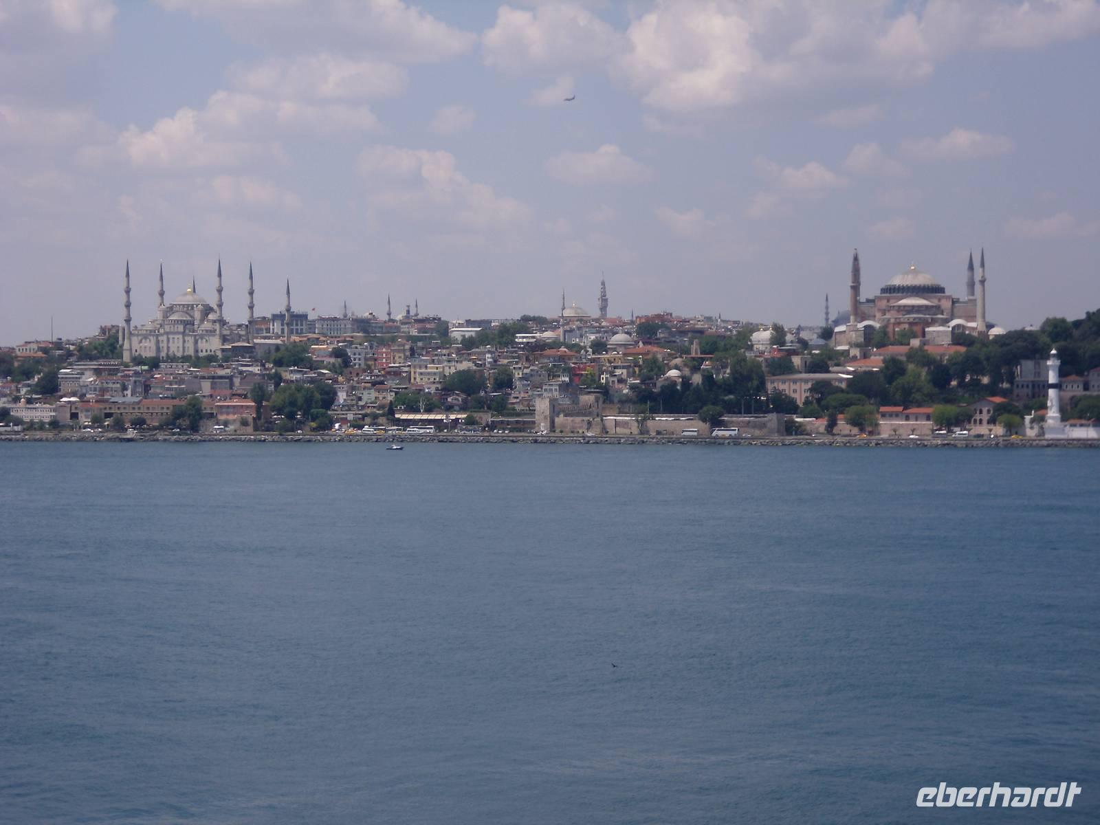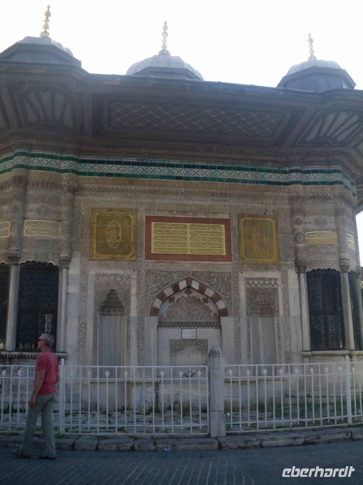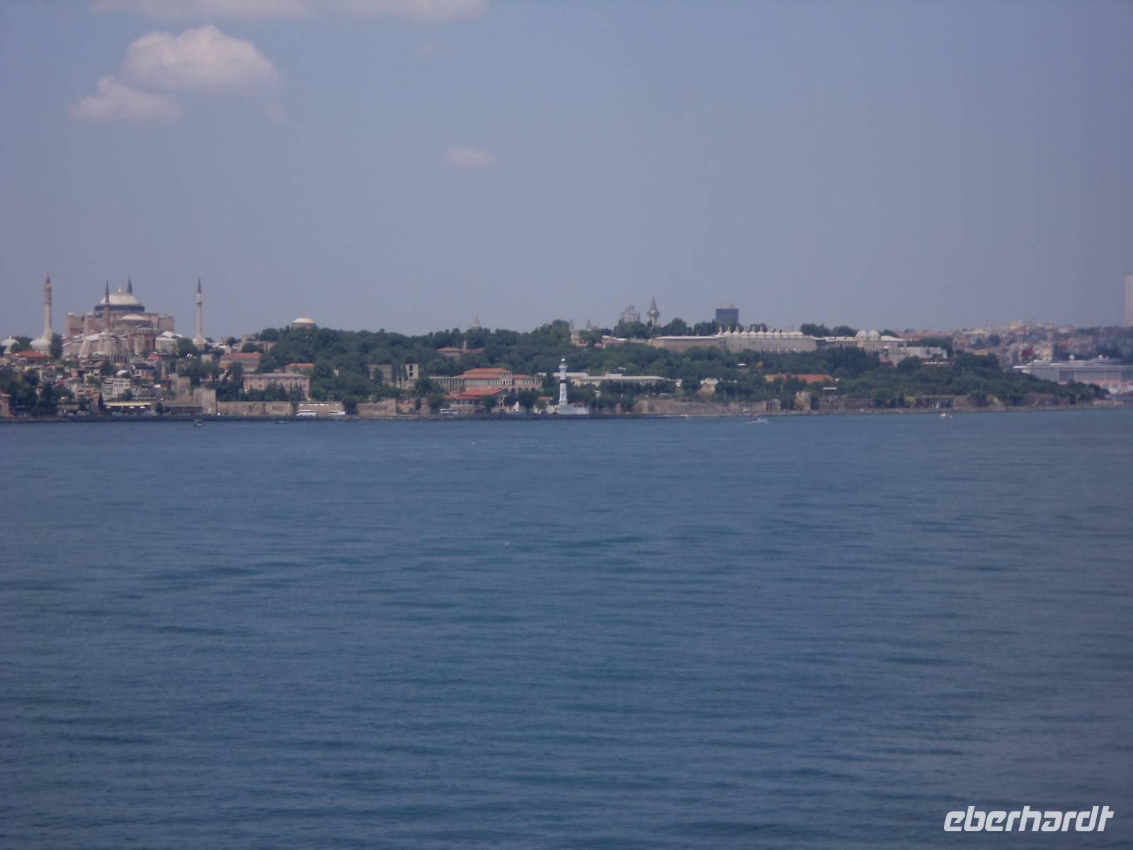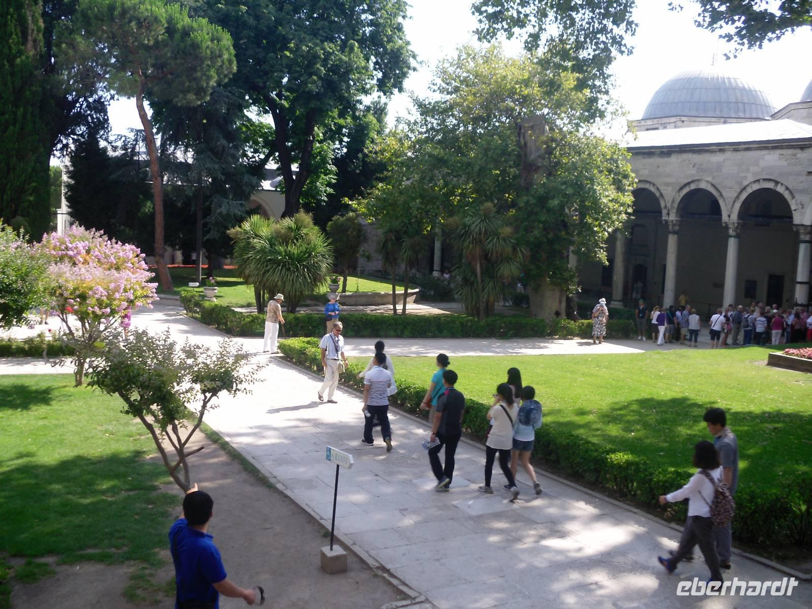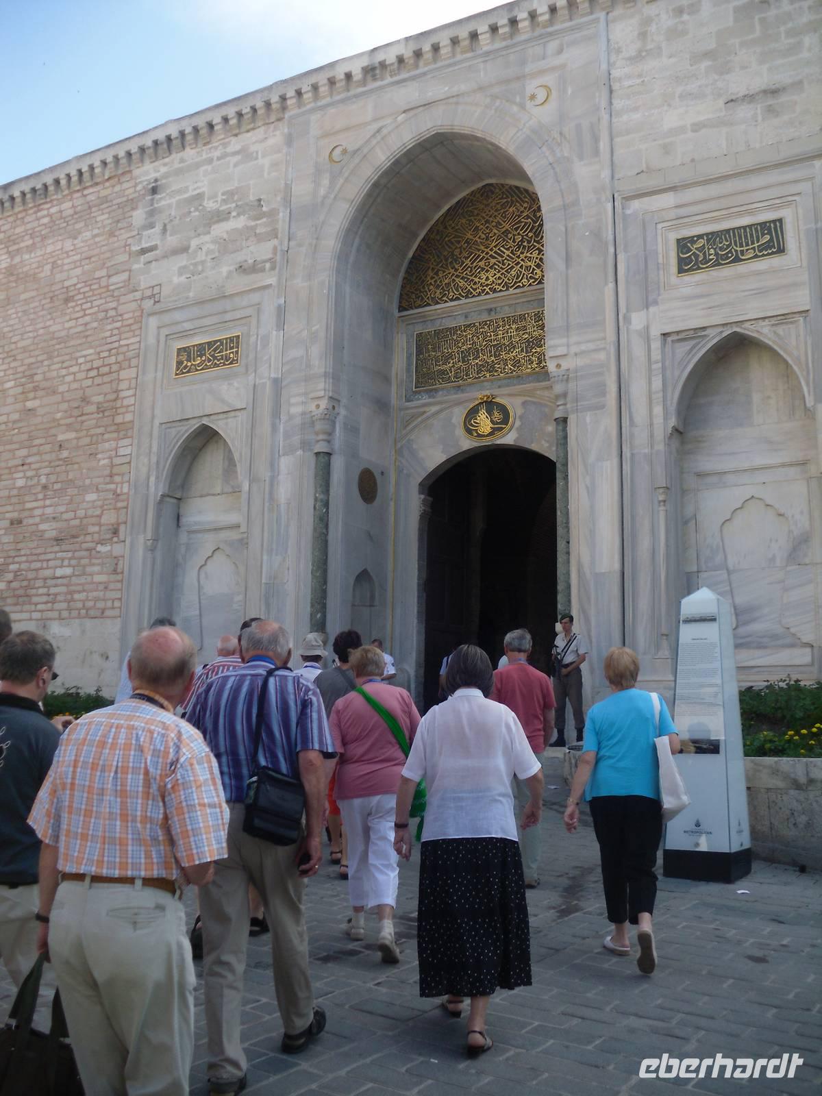 Heute stand der erste von drei Eberhardt-Inklusivausflügen auf dem Plan. Istanbul zu Fuß. Nein, natürlich nicht die ganze Stadt da wären wir viel zu lang unterwegs und schließlich mussten wir wieder pünktlich an Bord sein um unsere Reise fortzusetzen. Wer in Istanbul ist, muss natürlich auf dem Hippodrom-Platz mit seinen angrenzenden Sehenswürdigkeiten gewesen sein. So also auch wir... Der Topkapi-Palast war unser erster Anlaufpunkt. Er diente als Verwaltungszentrum während der Zeit des Osmanischen Reiches. Die vier Höfe in die der Palast geteilt ist, haben zur damaligen Zeit allen unterschiedlichen Zwecken gedient. Der erste Hof war überwiegend für die Wächter angedacht. Der zweite beherbergte bereits Staats- und Verwaltungsräume und war somit das politische Zentrum. Doch auch die Palastküche war hier untergebracht. Um in den dritten Hof zu kommen, muss man vorher noch das „Tor der Glückseligkeit" passieren. Der dahinterliegende Teil, durfte auch nur mit einer ausdrücklichen Erlaubnis betreten werden und diente durch den Thronsaal als Empfangsteil für die höchsten Staatsbesuche. Im vierten Hof befinden sich damals wie heute Parkanlagen und Terrassen, mit einmaligen und atemberaubenden Blicken über das Goldene Horn, den Bosporus und das Marmarameer. Schon seit vielen Jahren dient der Palast als Museum für Porzellan, Gewändern, Juwelen und Waffen aus der damaligen Zeit.
