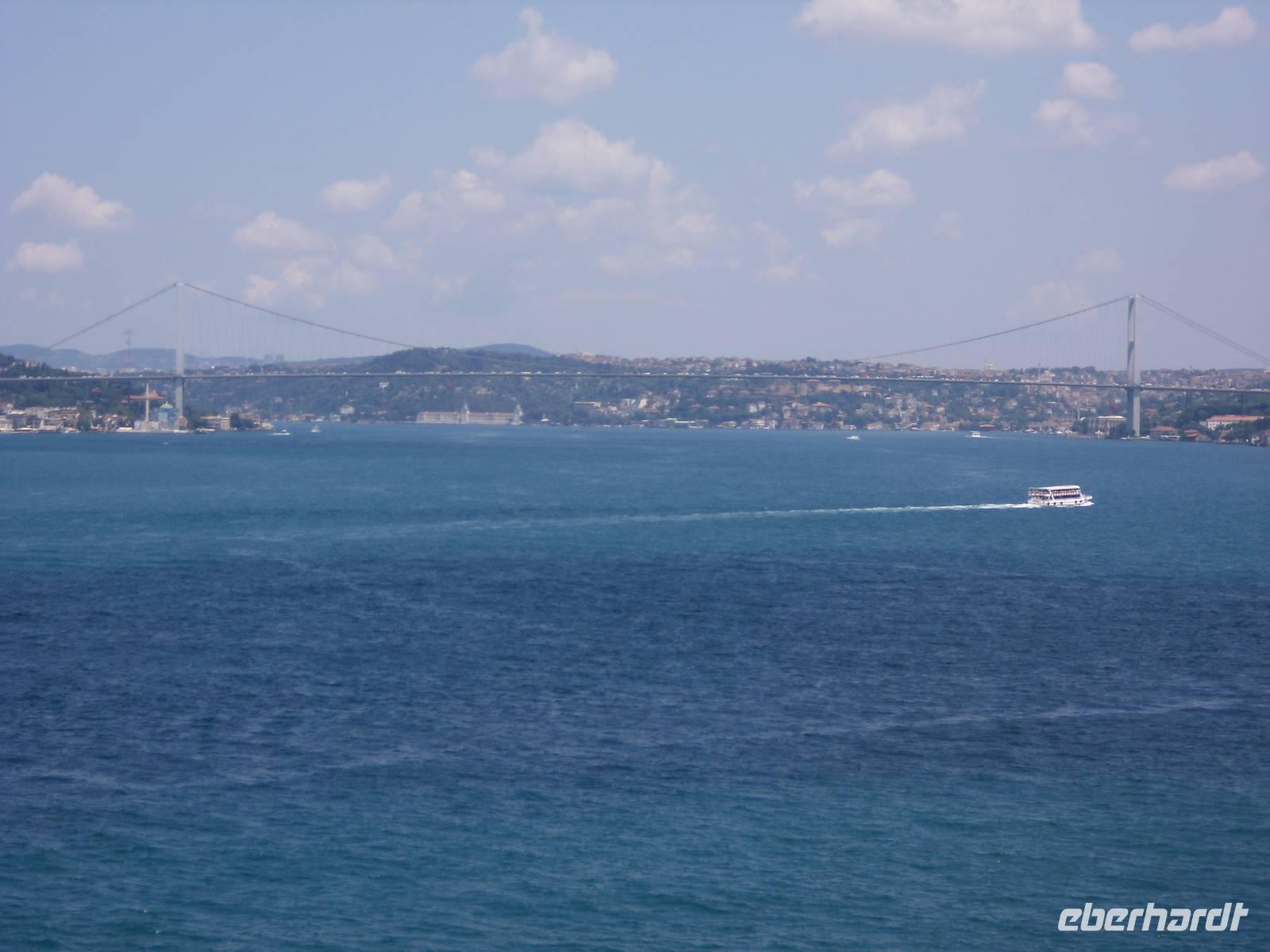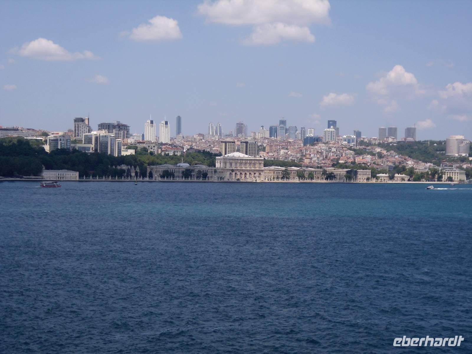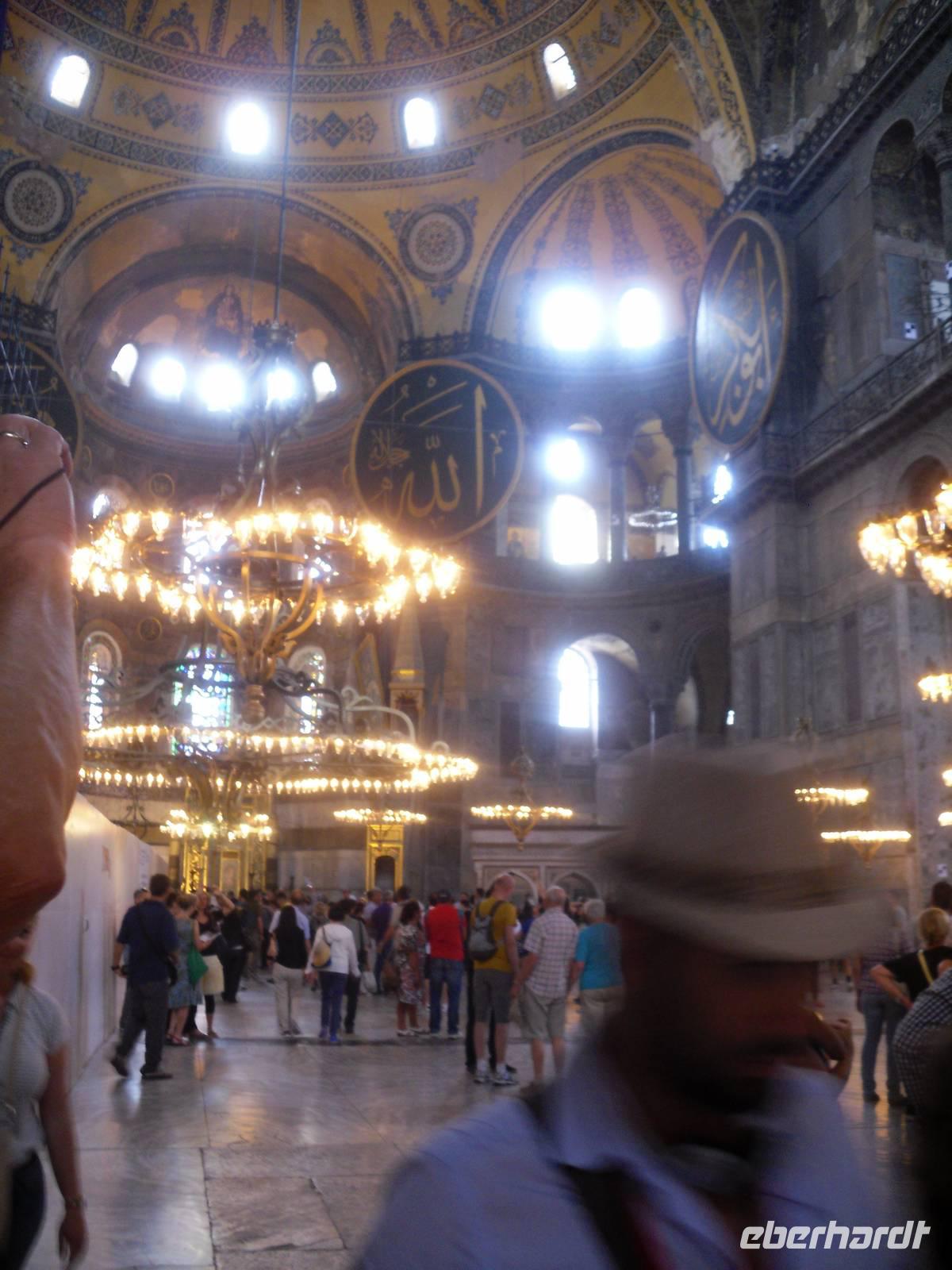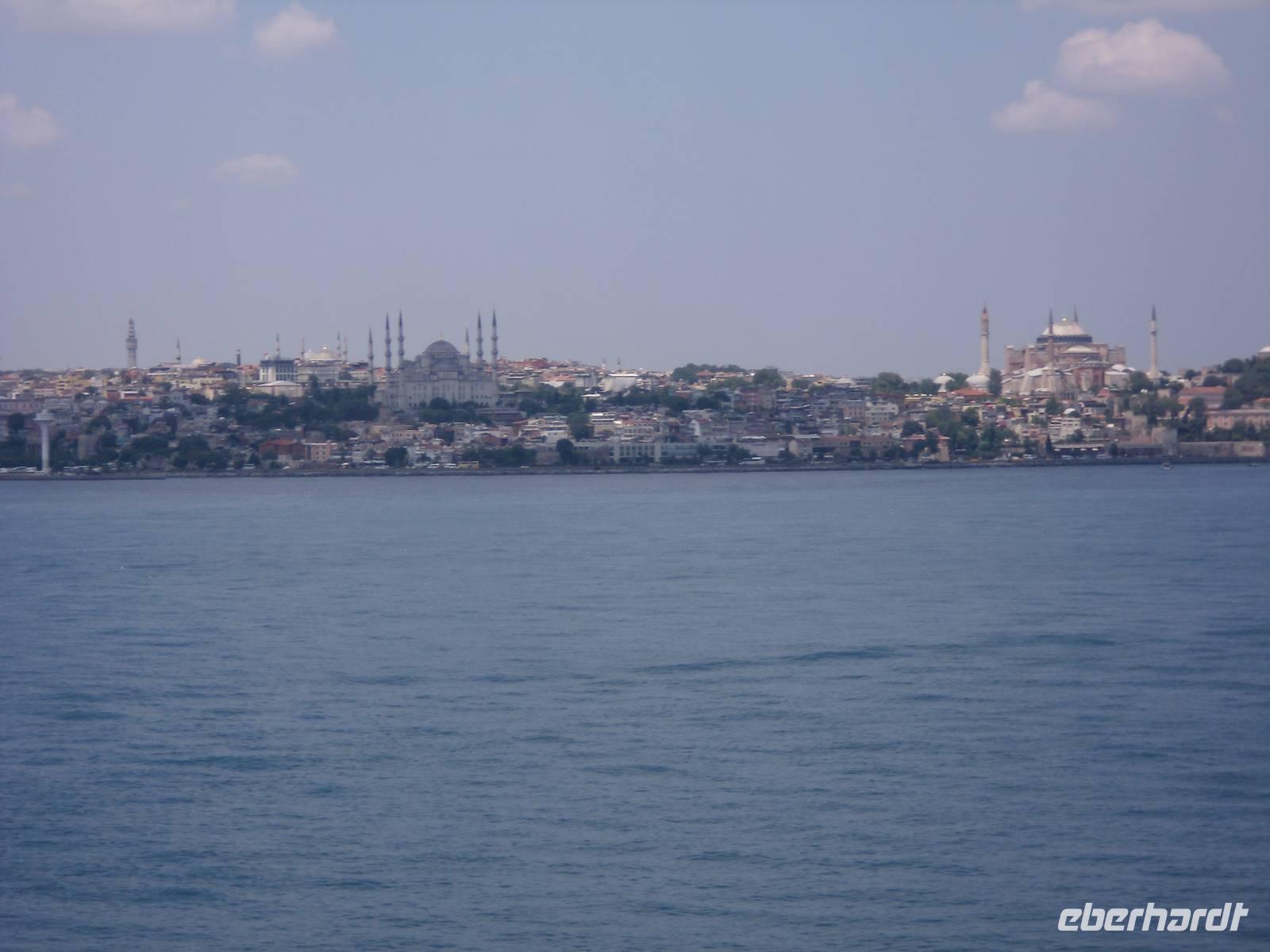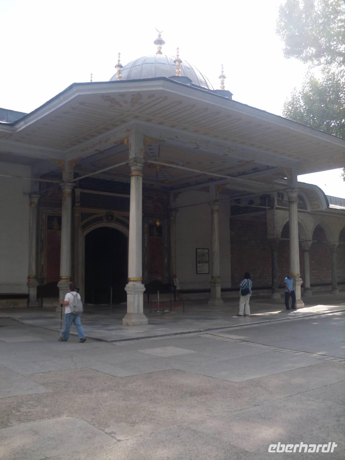 Heute stand der erste von drei Eberhardt-Inklusivausflügen auf dem Plan. Istanbul zu Fuß. Nein, natürlich nicht die ganze Stadt da wären wir viel zu lang unterwegs und schließlich mussten wir wieder pünktlich an Bord sein um unsere Reise fortzusetzen. Wer in Istanbul ist, muss natürlich auf dem Hippodrom-Platz mit seinen angrenzenden Sehenswürdigkeiten gewesen sein. So also auch wir... Der Topkapi-Palast war unser erster Anlaufpunkt. Er diente als Verwaltungszentrum während der Zeit des Osmanischen Reiches. Die vier Höfe in die der Palast geteilt ist, haben zur damaligen Zeit allen unterschiedlichen Zwecken gedient. Der erste Hof war überwiegend für die Wächter angedacht. Der zweite beherbergte bereits Staats- und Verwaltungsräume und war somit das politische Zentrum. Doch auch die Palastküche war hier untergebracht. Um in den dritten Hof zu kommen, muss man vorher noch das „Tor der Glückseligkeit" passieren. Der dahinterliegende Teil, durfte auch nur mit einer ausdrücklichen Erlaubnis betreten werden und diente durch den Thronsaal als Empfangsteil für die höchsten Staatsbesuche. Im vierten Hof befinden sich damals wie heute Parkanlagen und Terrassen, mit einmaligen und atemberaubenden Blicken über das Goldene Horn, den Bosporus und das Marmarameer. Schon seit vielen Jahren dient der Palast als Museum für Porzellan, Gewändern, Juwelen und Waffen aus der damaligen Zeit.