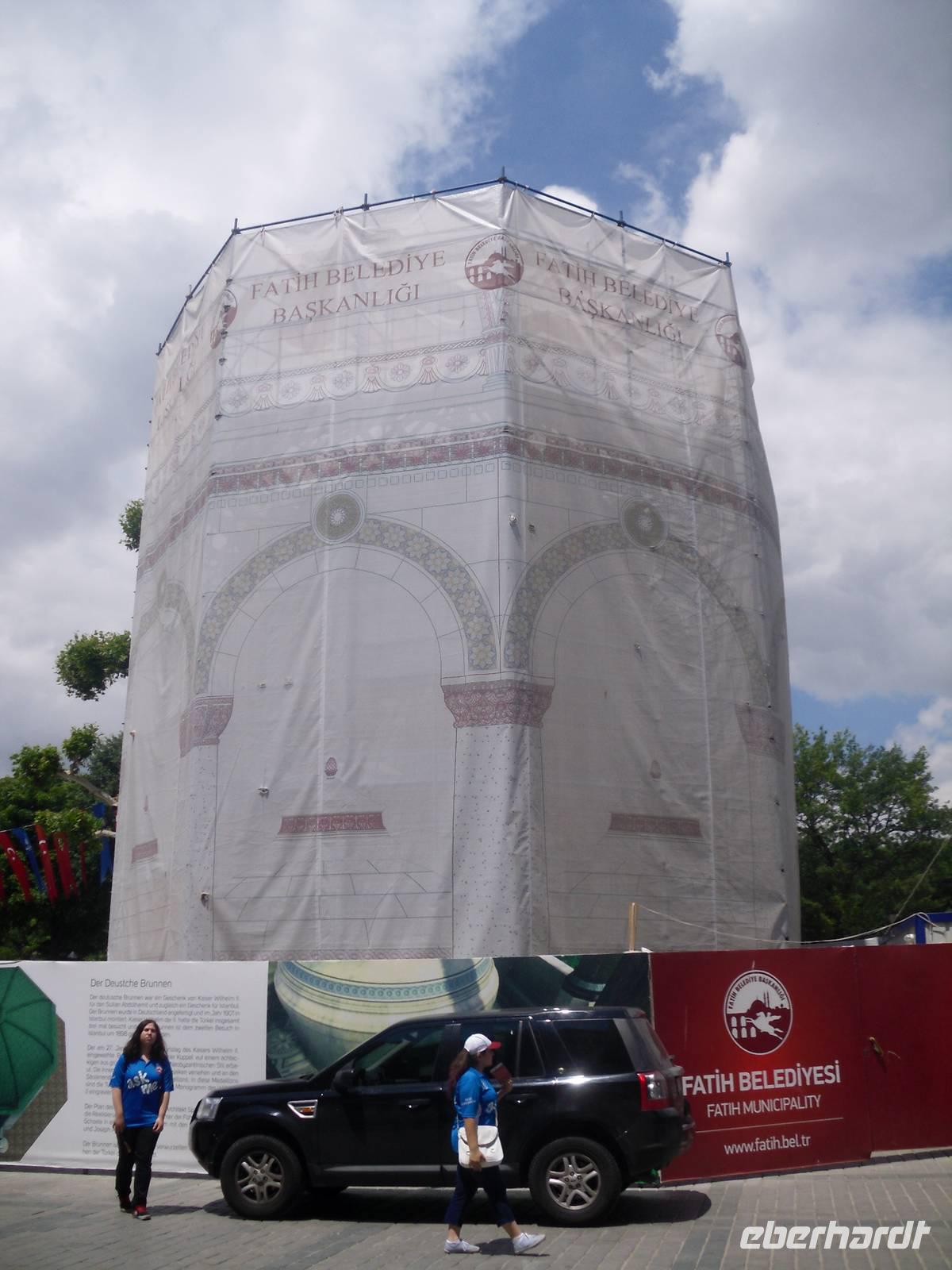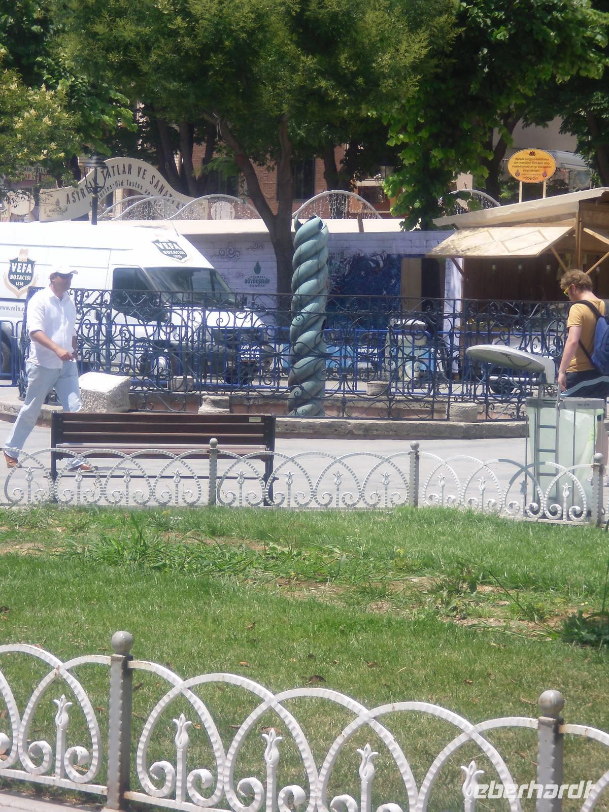 Durch die Wärme waren wir schon jetzt alle ein wenig erschöpft, doch wir zeigten keine Müdigkeit und weiter ging es mit unserem Programm. Mit ihrer Geschichte von Kirche über Moschee bis hin zum heutigen Museum ist die Hagia Sophia eines der Wahrzeichen Istanbul und das letzte große Bauwerk der Spätantike. Erst im Inneren des Museums lernt man dieses Bauwerk zu schätzen, allein das Hauptschiff, welches von 31 Meter Durchmesser beherrscht wird, lässt nur erahnen welche Größen hier eine Rolle spielen. Noch heute findet man in der Hagia Sophia die Spuren der Geschichte die Vorhallen zeigen Mosaike von Maria und dem Christuskind, hingegen das Hauptschiff zeigt die Vergangenheit einer Moschee durch eine Gebetsnische und dem Podest für den Muezzin. Bevor wir zum Mittagessen gingen, liefen wir im Schatten entlang des Hippodroms, welches im antiken Konstantinopel als Pferderennbahn galt. Es war das sportliche und soziale Zentrum der einstigen Hauptstadt. Auf dem Hippodrom befindet sich heute ein achteckiger, überdachter Brunnen, welcher Deutscher Brunnen oder und jetzt kommt der Name, welche einige von uns schon in Izmir gehört hatten... Kaiser-Wilhelm-Brunnen genannt wird. Doch nicht nur Kaiser Wilhelm besuchte die Stadt auch Theodosius I. stattete Istanbul einen Besuch ab und ließ einen Obelisken aus Ägypten in der Mitte der Rennbahn aufrichten. Ein weiteres Highlight ist die bronzene Schlangensäule. Die Säule soll eigentlich mit ihren 3 Schlangen an die Schlacht von Plataiai erinnern, doch leider sind die Schlangenköpfe heute nicht mehr erkennbar.