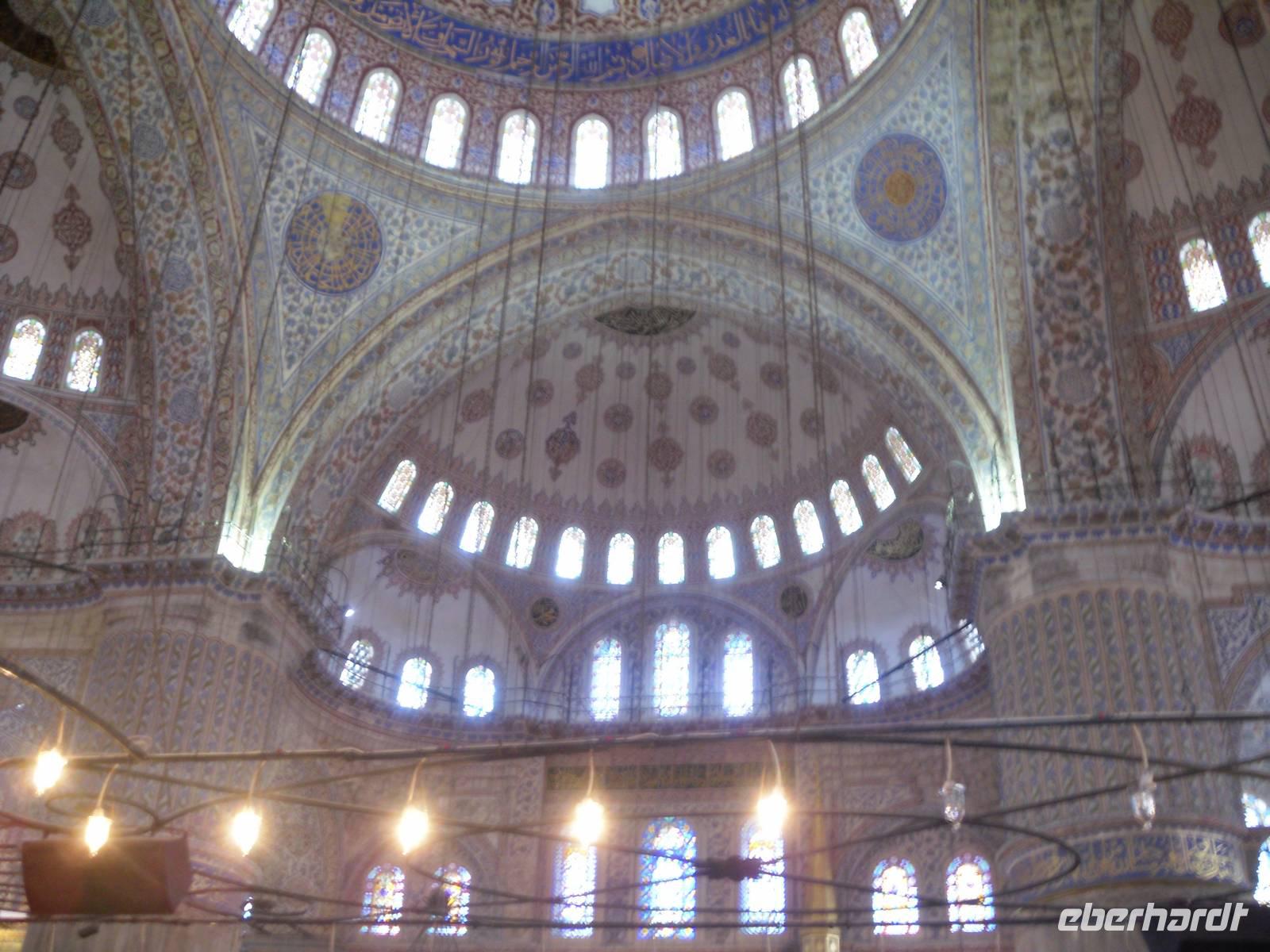 Pünktlich zur Mittagszeit hörten wir den Muezzin zum Gebet rufen, einige von nahmen den Gebetsruf noch mit der Kamera auf um zu Hause den Ton für ihr Video zu nutzen. Bevor dann am Nachmittag wieder auf dem Schiff ankamen, stand noch ein kleiner Besuch auf unserem Plan. Die Moschee, mit den 6 Minaretten. Richtig die Sultan-Ahmet-Moschee, aber auch oft Blaue Moschee genannt. Die Moschee trägt ihren Namen nicht wegen ihrer äußeren Fassade. Sie bekam den Namen durch ihr Inneres. Durch die blauen Wände im Gebetsraum, bekam sie ihren Spitznamen Blaue Moschee, welcher unter den Touristen der häufiger verwendete Begriff ist.