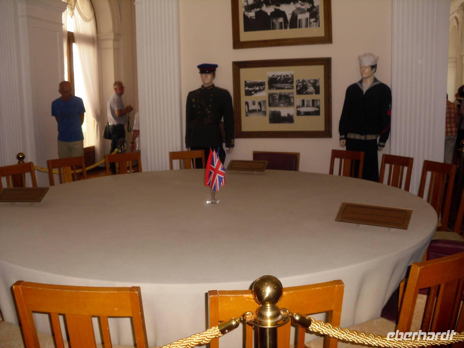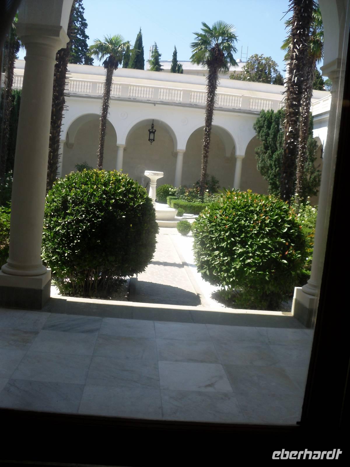 In Jalta angekommen, machte sich die gesamte Reisegruppe auf den Weg. Mit einem kurzen Spaziergang über die Promenade bis zur Alexander-Newski-Kirche begannen wir den Tag. Die Kirche fiel bereits von weiten durch ihre goldenen Zwiebeltürme auf. Schnell noch ein paar Fotos gemacht, ging es auch schon weiter. Unsere Fahrt führte uns zu dem Gebäude, in dem bereits Roosevelt, Churchill und Stalin zusammen an einem Tisch saßen. Der Liwadija-Palast, auch Weiße Palast genannt, ist bekannt durch die Konferenz von Jalta. Unsere Reiseleiterin gab uns in jedem Raum viele interessante Informationen. Doch ich denke für viele die schönste Erinnerung an den Palast war die Gesangseinlage von vier jungen Männern.