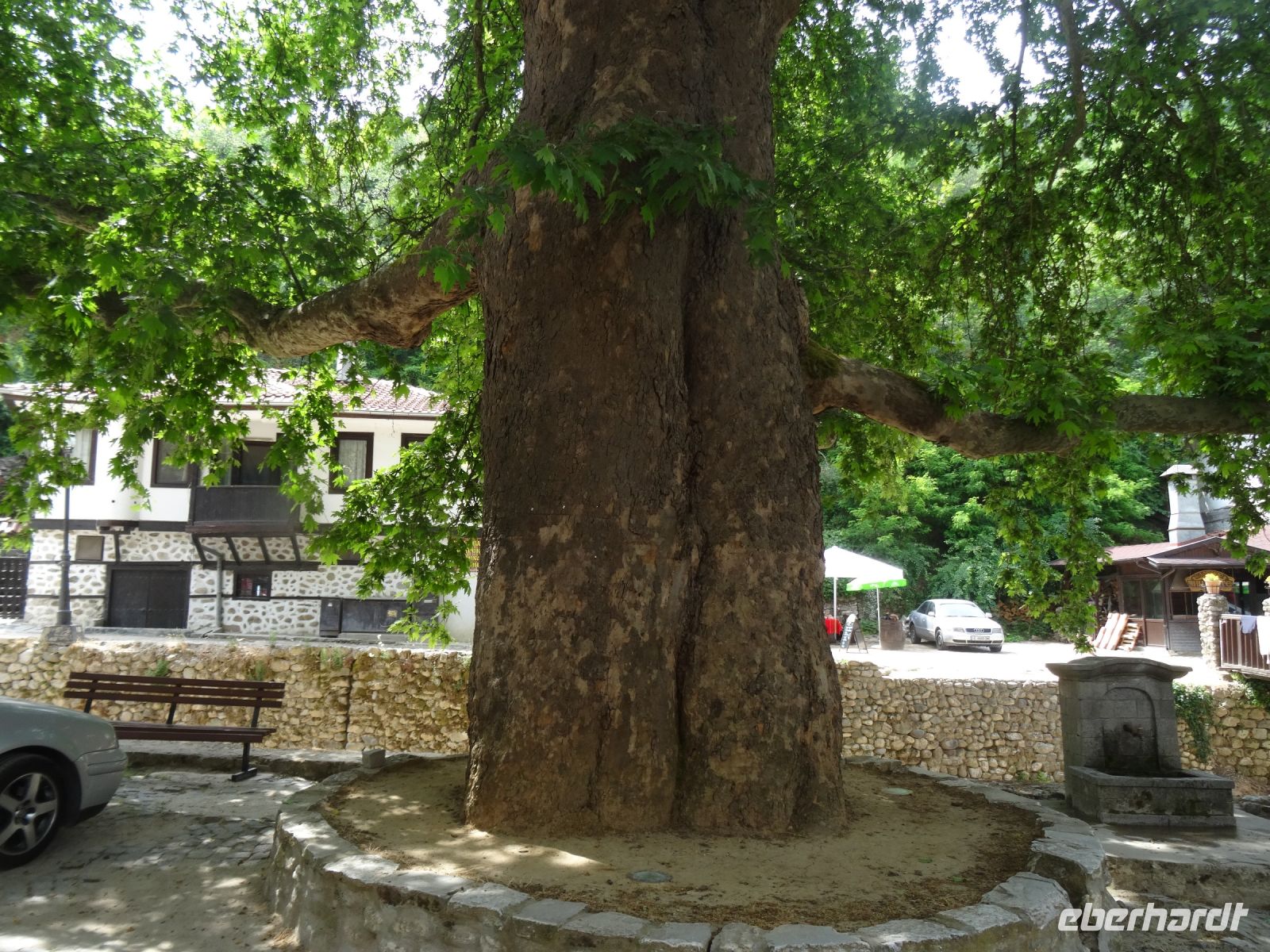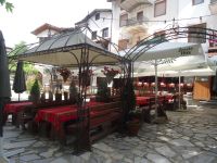 Nach ausführlichem Fotografieren kehren wir in das weltliche Leben zurück und verspeisen im Restaurant Waldeck die vorbestellten Rila-Forellen. Gut gestärkte geht es weiter zum nächsten Halt in Dobarsko. Dort erwarten und drei rüstige Omas mit einem Gläschen Schnaps und Gebäck und sie singen für uns einige traditionelle Lieder. Auch wir werden zum Mitmachen aufgefordert und geben uns wirklich Mühe, aber unser Gesang ist sicher ausbaufähig. In der kleinen Kirche betrachten wir ein Wandfresko mit der Jesusfigur in einer Umrahmung, ausgedeutet als Jesus in einer Rakete. Wie auch immer-es war eine interessante Abwechslung und schwungvoll machten wir uns auf die Weiterfahrt in Richtung Bansko. In der frischen Bergluft unternehmen wir einen schönen Spaziergang durch den Ort. Er ist bekannt als Wintersportzentrum, jetzt war er recht ruhig, vieles war auch geschlossen. Schöne Wiedergeburtshäuser säumen die Straßen in der Altstadt, darunter das Hausmuseum Ivan Rilski, der als Mönch eine bulgarische Grammatik schrieb und das Neue Testament ins Bulgarische übersetzte. Die Dreifaltigkeitskirche von 1850 hat einen Glockenturm von 30 m Höhe, was durch die türkische Besatzungsmacht eigentlich nicht erlaubt war. Alles sollte klein und bescheiden sein, vor allem kleiner als eine Moschee. Die Stadt missachtete das Verbot und trotz Schmiergeldzahlungen musste der bulgarische Bürgermeister für 5 Jahre ins Gefängnis. Diese harten Zeiten sind zum Glück vorbei und wir wenden uns noch den ökologischen Waschmaschinen zu - in Holzbottichen wird das Wasser des Gebirgsbaches aufgefangen und hindurchgeleitet. Die Kraft des Wassers reinigt die im Bottich befindlichen Teppiche ganz ohne Chemie und Elektrizität.