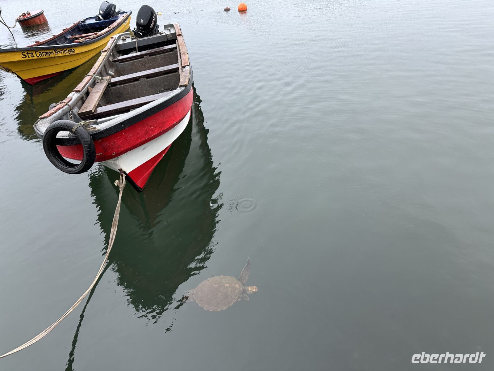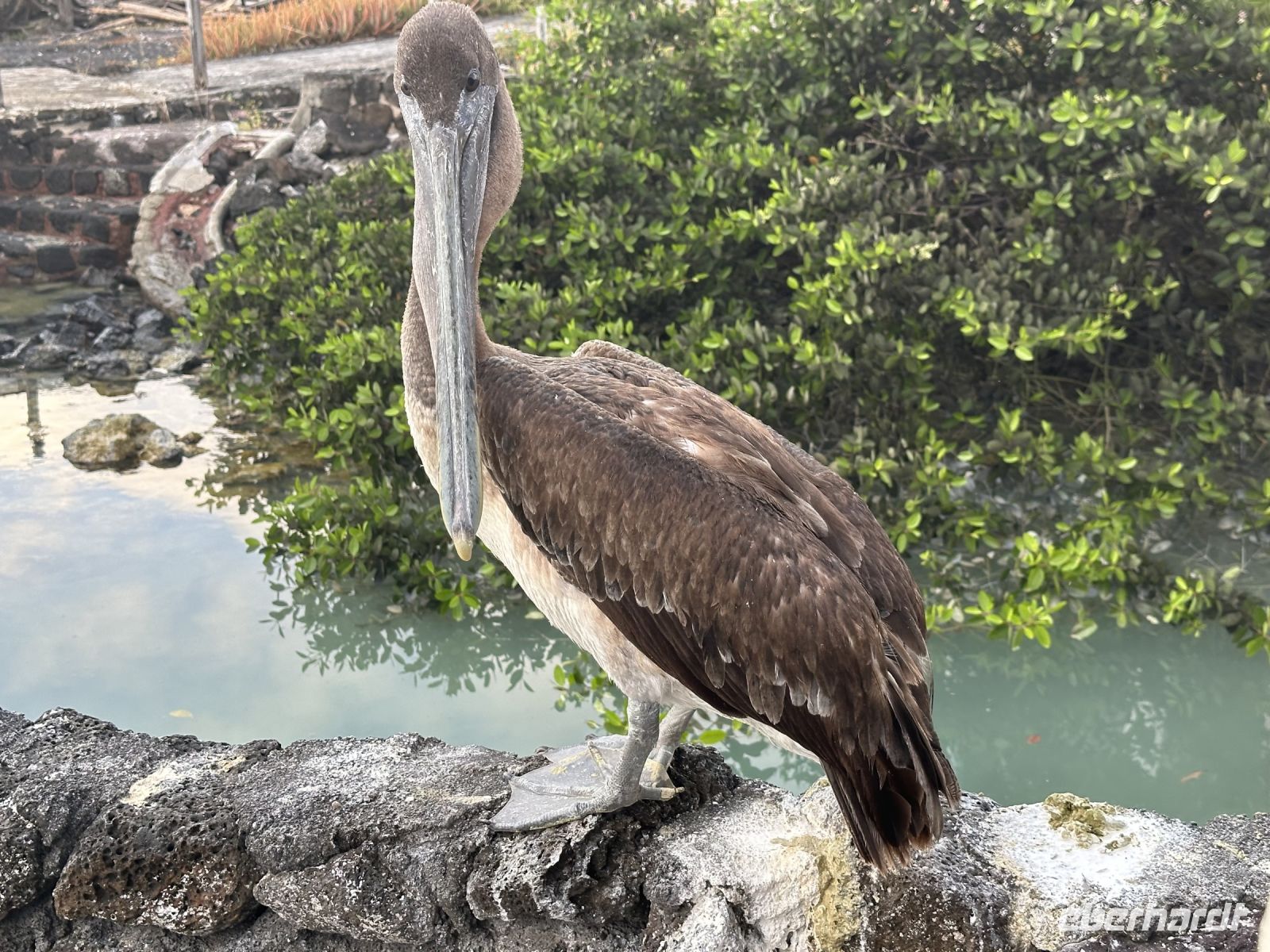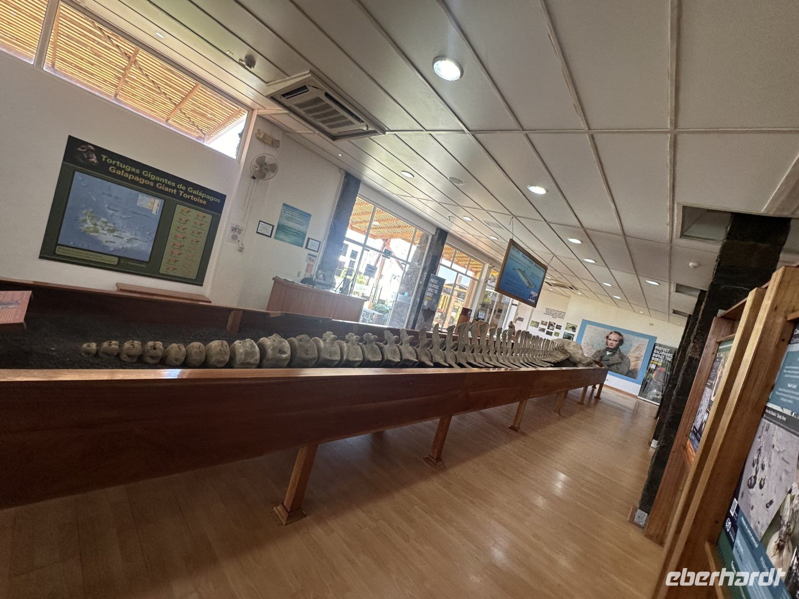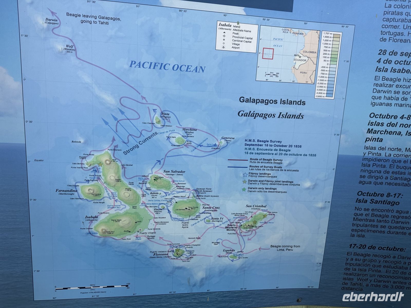 Nach dem Frühstück mit Meerblick, Pelikanen und Meeresechsen sammeln wir unsere Koffer. Nach Isabella reisen wir mit kleinem Gepäck. In zwei Tagen sind wir wieder hier. Den Vormittag verbringen wir in der Charles-Darwin-Forschungsstation. Die Forschungsstation wurde nach Charles Darwin benannt, dem berühmten Naturforscher, der während seiner Reise mit der HMS Beagle in den 1830er Jahren die Galapagos-Inseln besuchte und deren einzigartige Tierwelt studierte. Die Station dient auch als Zentrum für Umweltbildung und -aufklärung, sowohl für die lokale Bevölkerung als auch für uns Touristen. In einem kleinen Museum sehen wir einen kurzen Film über die Galapagosinseln, bewundern ein riesiges Walskelett und andere Ausstellungsstücke. Ein bisschen Spaß muss sein und wir nutzen die uns angebotene Gelegenheit für Spaß-Fotos. Auf einem großen Plakat wird über die fünfjährige Forschungsreise der HMS (Her Majesty Ship) Beagle informiert. Die HMS Beagle war ein britisches Forschungsschiff, das im 19. Jahrhundert bekannt wurde, insbesondere durch seine berühmteste Expedition, die von Charles Darwin begleitet wurde. Die Beagle unternahm mehrere Reisen, aber ihre berühmteste war die zweite Reise von 1831 bis 1836. Während dieser Reise war Darwin als Naturforscher an Bord und sammelte Daten, die später seine Evolutionstheorie beeinflussten. Eine gruselige Geschichte wird hier über die sogenannte Route der Schildkröten erzählt. Hunderte, wenn nicht tausende Schildkröten wurden von Seglern mitgenommen und dienten als frische Mahlzeit auf den langen Seereisen. Zum Schluss begegnen wir dem einsamen George. Die Geschichte des einsamen George oder Lonesome George ist tragisch und gleichzeitig faszinierend. George war eine Ikone der Galapagos-Inseln und ein Symbol für den Artenschutz. Er gehörte zu einer Unterart der Riesenschildkröten, die auf der Insel Pinta beheimatet war. Diese Schildkröten waren einst zahlreich auf den Galapagos-Inseln zu finden, aber durch die Auswirkungen menschlicher Aktivitäten wie die Einführung von nicht-einheimischen Arten und die Jagd waren sie stark dezimiert worden. George wurde in den 1970er Jahren als die letzte bekannte Pinta-Riesenschildkröte identifiziert. In den folgenden Jahrzehnten wurde viel unternommen, um eine Partnerin für George zu finden, in der Hoffnung, seine Art zu retten. Doch trotz intensiver Bemühungen und zahlreicher Versuche, ihn mit Weibchen anderer Riesenschildkrötenarten zu paaren, gelang es nie, Nachkommen zu zeugen. George blieb ein einsames Symbol des bedrohten Artenreichtums der Galapagos. Im Juni 2012, im Alter von über 100 Jahren, verstarb George unerwartet in seinem Gehege im Charles Darwin Station auf der Insel Santa Cruz.
