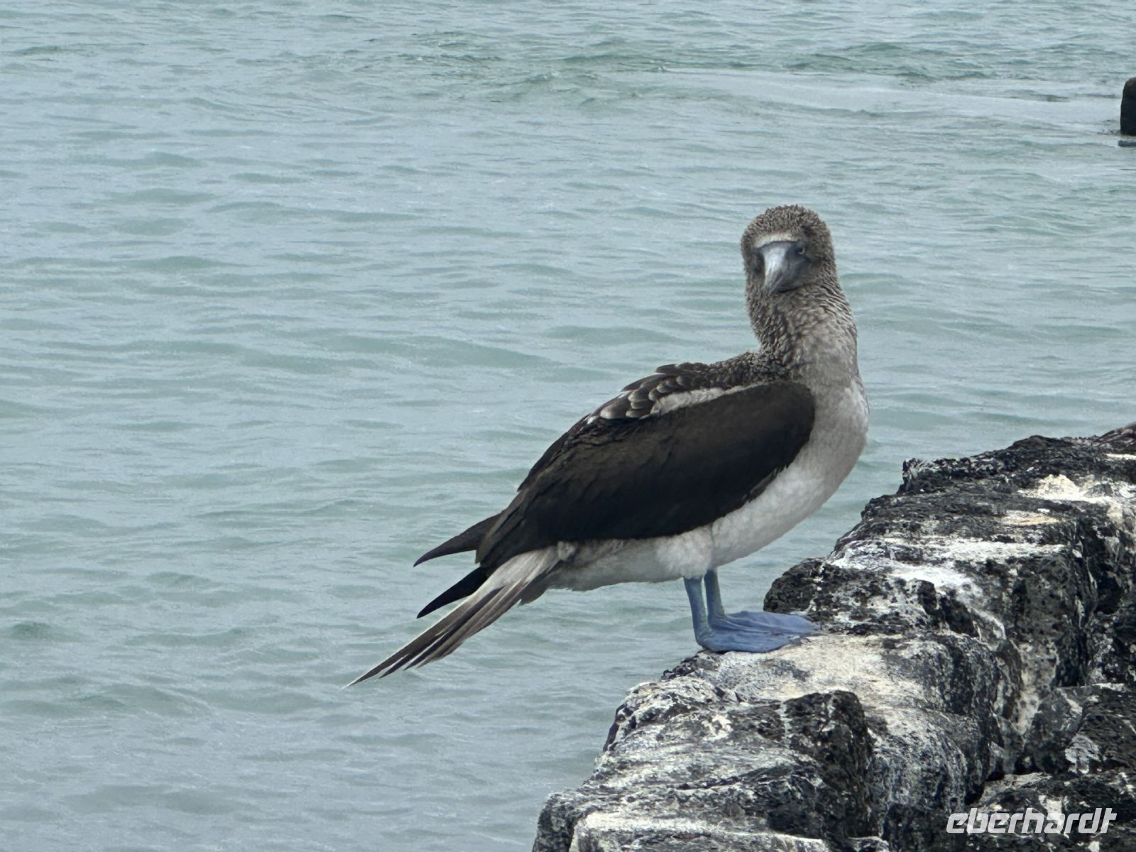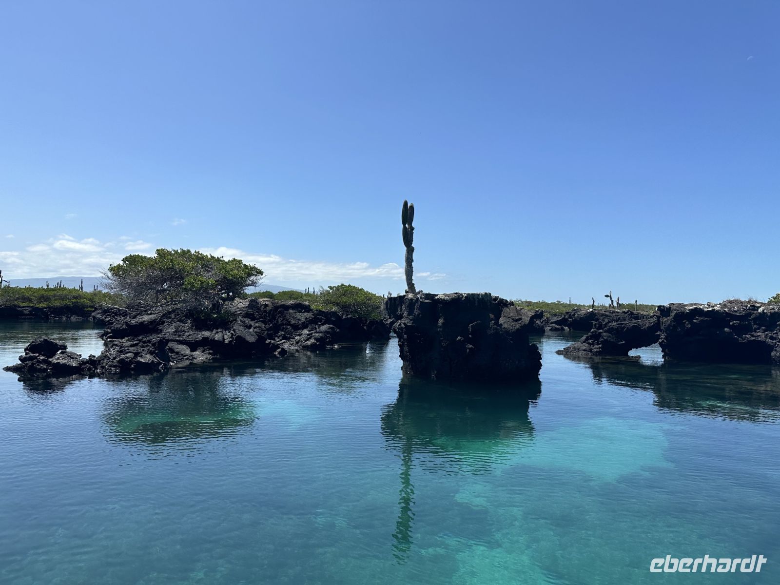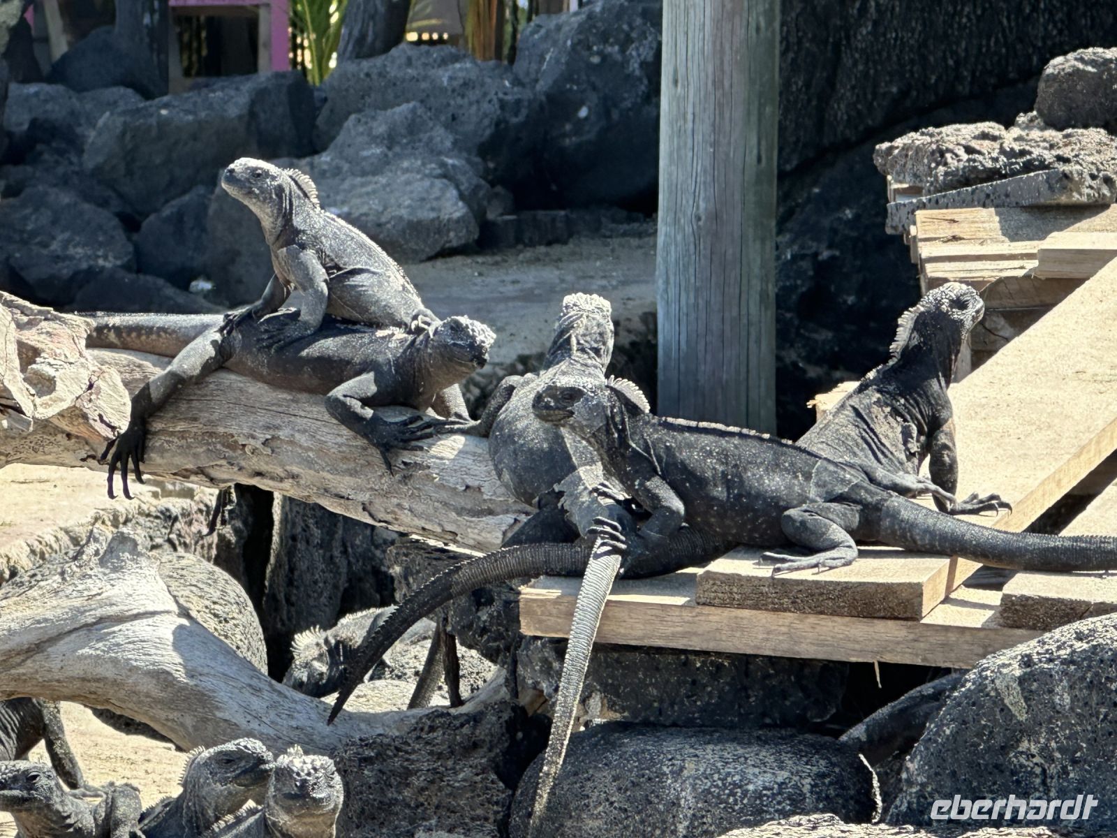 Wir besuchen das Riesenschildkröten Brutzentrum (Giant Tortoise Breeding Center). Die Anlage umfasst verschiedene Gehege und Einrichtungen, die darauf abzielen, optimale Bedingungen für die Brut, das Schlüpfen und das Aufwachsen von Riesenschildkröten zu schaffen. Und so können wir hier die Riesenschildkröten in verschiedenen Altersstufen beobachten. Anschließend legen wir einen Stopp an einer Salzlagune ein. Hier ist eine Gruppe von Flamingos heimisch. Fredy weiß, womit er uns begeistern kann. Wir fahren zum Strand und laufen zur Pink Iguana Bar. Und was gibt es hier zusehen? Meeresechsen in Hülle und Fülle. Und so viele! Sie stapeln sich förmlich, umarmen sich und lassen sich von der Sonne bescheinen. Nachdem wir uns satt gesehen und fotografiert haben, müssen wir weiter, die Seelöwen warten schon am Hafen auf uns. Für den nächsten Ausflug teilen wir uns auf zwei Schiffe auf. Unser Ziel ist die Felsformation Los Tuneles, die entgegen ihres Namens mit einem Tunnel recht wenig zu tun hat. Aber nun: nachdem wir fast eine halbe Stunde mit den Schnellbooten über die Wellen gebrettert sind, erreichen wir einen Felsen, auf dem eine Vogelkolonie brütet. Aber das, was uns fasziniert, sitzt nicht auf dem Felsen, sondern befindet sich unter Wasser. Unser Guide hat tatsächlich eine Gruppe von Riesenmantas entdeckt. Das ist wahrlich der absolute Höhepunkt der Reise. Unter der Wasseroberfläche zeichnen sich große schwarze Schatten ab. Auch für unseren Kapitän und unseren Guide scheint diese Begegnung selten zu sein. Immer wieder tauchen die riesigen Tiere mit ihren weißen Bäuchen an der Oberfläche auf. Das ist eine ganze Schule von Mantas, nicht nur ein einziger. Sie machen gucci gucci, wie unser Guide immer wieder ruft. Es ist nicht schwer zu erraten, was er meint. Die Mantas haben sich heute hier versammelt, um für Nachwuchs zu sorgen. Was haben wir für ein Glück. Nach dieser unglaublichen Begegnung setzen wir unseren Weg fort zu unserem eigentlichen Ziel, den Los Tuneles. Diese faszinierende Landschaftsformation ist durch erodierende Lava entstanden, als vor vielen Jahren Lavaströme aus den Vulkanen der Galapagosinseln ins Meer flossen. Durch die schnelle Abkühlung der Lava bildeten sich Türme und Brücken, vielleicht auch kleine Tunnel. Wir halten und verweilen hier. Es besteht die Möglichkeit zum Schnorcheln. Korallen, verschiedene Fische, Meeresschildkröten und Haie gibt es zu sehen. Nachdem unsere Schnorchler wieder an Bord sind, fahren wir weiter. Unterwegs begegnen uns Blaufußtölpel und Pinguine. Jetzt ist die Sammlung komplett. Wir haben alle Tiere gesehen, die es hier zu entdecken gibt.