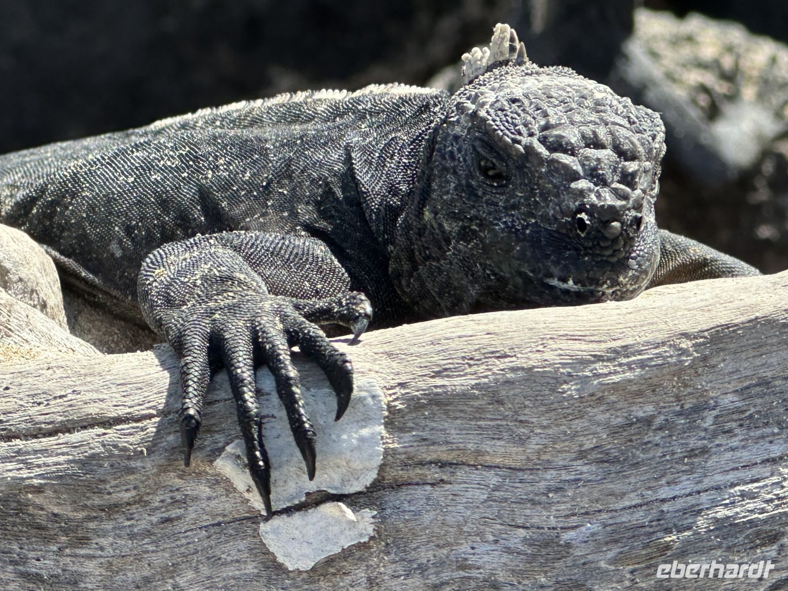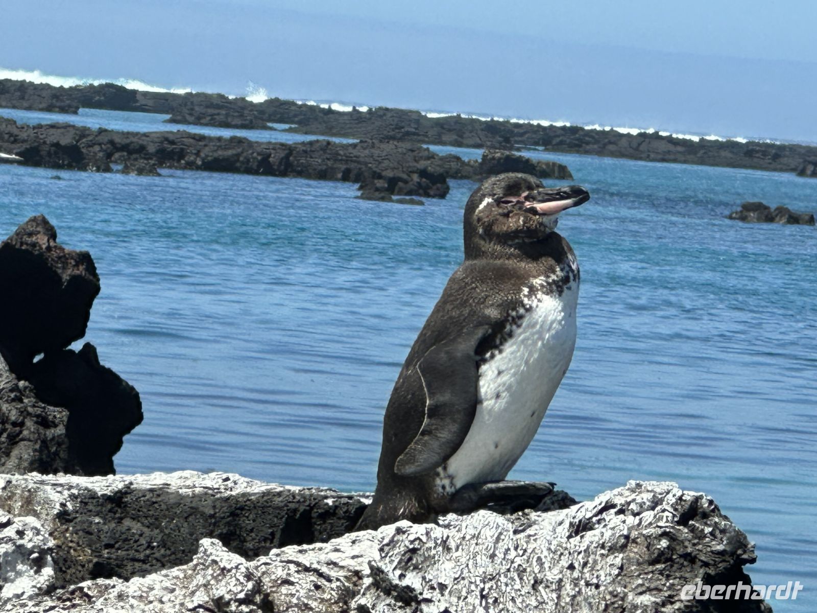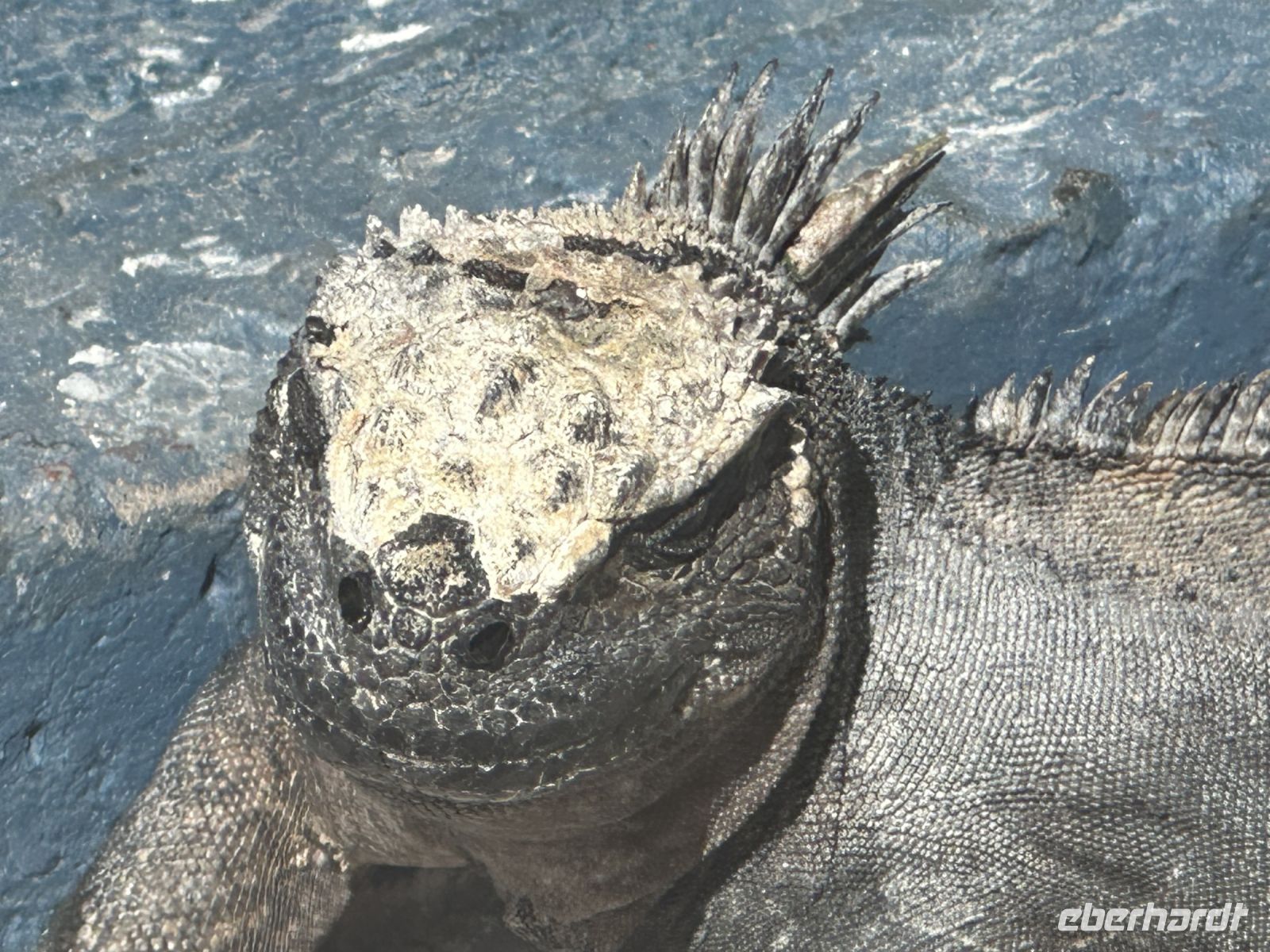 Wir besuchen das Riesenschildkröten Brutzentrum (Giant Tortoise Breeding Center). Die Anlage umfasst verschiedene Gehege und Einrichtungen, die darauf abzielen, optimale Bedingungen für die Brut, das Schlüpfen und das Aufwachsen von Riesenschildkröten zu schaffen. Und so können wir hier die Riesenschildkröten in verschiedenen Altersstufen beobachten. Anschließend legen wir einen Stopp an einer Salzlagune ein. Hier ist eine Gruppe von Flamingos heimisch. Fredy weiß, womit er uns begeistern kann. Wir fahren zum Strand und laufen zur Pink Iguana Bar. Und was gibt es hier zusehen? Meeresechsen in Hülle und Fülle. Und so viele! Sie stapeln sich förmlich, umarmen sich und lassen sich von der Sonne bescheinen. Nachdem wir uns satt gesehen und fotografiert haben, müssen wir weiter, die Seelöwen warten schon am Hafen auf uns. Für den nächsten Ausflug teilen wir uns auf zwei Schiffe auf. Unser Ziel ist die Felsformation Los Tuneles, die entgegen ihres Namens mit einem Tunnel recht wenig zu tun hat. Aber nun: nachdem wir fast eine halbe Stunde mit den Schnellbooten über die Wellen gebrettert sind, erreichen wir einen Felsen, auf dem eine Vogelkolonie brütet. Aber das, was uns fasziniert, sitzt nicht auf dem Felsen, sondern befindet sich unter Wasser. Unser Guide hat tatsächlich eine Gruppe von Riesenmantas entdeckt. Das ist wahrlich der absolute Höhepunkt der Reise. Unter der Wasseroberfläche zeichnen sich große schwarze Schatten ab. Auch für unseren Kapitän und unseren Guide scheint diese Begegnung selten zu sein. Immer wieder tauchen die riesigen Tiere mit ihren weißen Bäuchen an der Oberfläche auf. Das ist eine ganze Schule von Mantas, nicht nur ein einziger. Sie machen gucci gucci, wie unser Guide immer wieder ruft. Es ist nicht schwer zu erraten, was er meint. Die Mantas haben sich heute hier versammelt, um für Nachwuchs zu sorgen. Was haben wir für ein Glück. Nach dieser unglaublichen Begegnung setzen wir unseren Weg fort zu unserem eigentlichen Ziel, den Los Tuneles. Diese faszinierende Landschaftsformation ist durch erodierende Lava entstanden, als vor vielen Jahren Lavaströme aus den Vulkanen der Galapagosinseln ins Meer flossen. Durch die schnelle Abkühlung der Lava bildeten sich Türme und Brücken, vielleicht auch kleine Tunnel. Wir halten und verweilen hier. Es besteht die Möglichkeit zum Schnorcheln. Korallen, verschiedene Fische, Meeresschildkröten und Haie gibt es zu sehen. Nachdem unsere Schnorchler wieder an Bord sind, fahren wir weiter. Unterwegs begegnen uns Blaufußtölpel und Pinguine. Jetzt ist die Sammlung komplett. Wir haben alle Tiere gesehen, die es hier zu entdecken gibt.