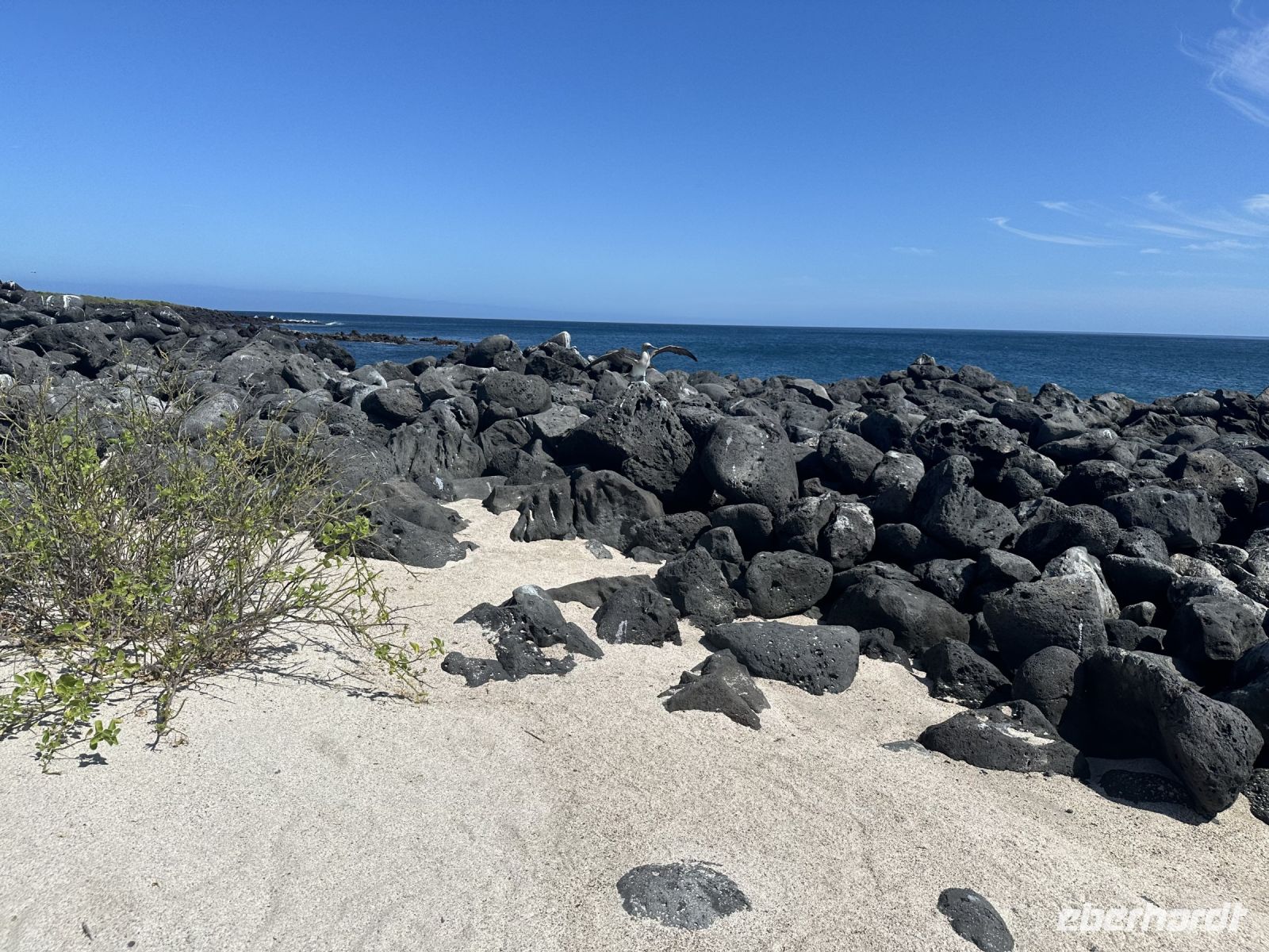 Nach einem gemütlichen Frühstück laufen wir zum Hafen. Auf der Treppe zum Boot liegen schlafende Seelöwen. Wir sind entzückt. Mit einem kleinen Ausflugsboot fahren wir zur Insel Lobos. Das Wasser ist kristallklar und als wir ankommen, werden wir wieder von Seelöwen begrüßt. Die Insel scheint nur aus großen schwarzen vulkanischen Steinen zu bestehen und wir sind dankbar, dass uns auf dem Boot große Stöcke angeboten wurden, mit denen es sich besser ausbalancieren lässt. Leider müssen wir ein Seelöwenjunges und seine Mutter stören, weil sie direkt auf unserem Weg liegen, sonst könnten wir nicht aussteigen. Danke, dass ihr euch ein anderes Plätzchen gesucht habt. An den dunklen Lavasteinen krabbeln kleine schwarze Krabben. Zugegebener Maßen sehen diese etwas gruselig aus. Schöner sind dagegen die großen in ihren orange-roten Panzern. Im glasklaren Wasser spielen zwei Seelöwenjunge miteinander. Es dauert nicht lange, da begegnen wir den ersten Fregattvögeln. Der erste sitzt in einem Busch und lässt nur erahnen, wie groß er sein muss. Seine Federn sind tief schwarz und sein Schnabel lang und gebogen. Als nächstes entdecken wir zwei Eier von Blaufußtölpeln. Hier hat sich ein unerfahrenes Pärchen gedacht, die soll doch mal die Sonne ausbrüten, aber laut unseren Begleitern funktioniert so etwas nicht. Am nächsten Busch wird es richtig interessant. Hier sitzt ein Fregattvogelpärchen. Er hat seinen roten Kehlsack weit aufgeblasen, sein Weibchen scheint davon wenig beeindruckt. Aber wir, wir sind definitiv beeindruckt. Und so geht es weiter. Auf dem Boden brüten Blaufußtölpel, in den Büschen sitzen Fregattvögel. Alle scheinen mit Liebe beschäftigt zu sein. Die Fregattvögelmännchen blasen ihre roten Kehlsäcke auf und über ihnen kreisen die Weibchen auf der Suche nach dem schönsten Mann. Manche Blaufußtölpel brüten bereits ihre Eier, andere sind wiederum noch auf der Suche. Es ist köstlich mit anzusehen, wie der Blaufußtölpel tanzt, um sein Weibchen zu beeindrucken. In einem anderen Busch sitzt ein Fregattvogeljunges und schreit kläglich nach seiner Mutter. Dann kommt diese angeflogen, umarmt das Junge mit ihren großen Flügeln, öffnet den Schnabel und der Kleine steckt seinen Schnabel bis zum Anschlag in den der Mutter. So füttern Fregattvögel ihre Jungen. Und wir stehen direkt davor und können zuschauen. Verrückt. Nach zwei fantastischen Stunden holt uns das Schlauchboot ab und bringt uns zurück zum Ausflugsboot. Mittags erreichen wir einen puderweißen Sandstrand. Hier kann geschnorchelt und gebadet werden. Mit einem fantastischen Sonnenuntergang und einem Abendessen im Post-Office, natürlich mit Seelöwenblick klingt ein weiterer Tag auf San Cristobal aus. Was haben wir für ein Glück.