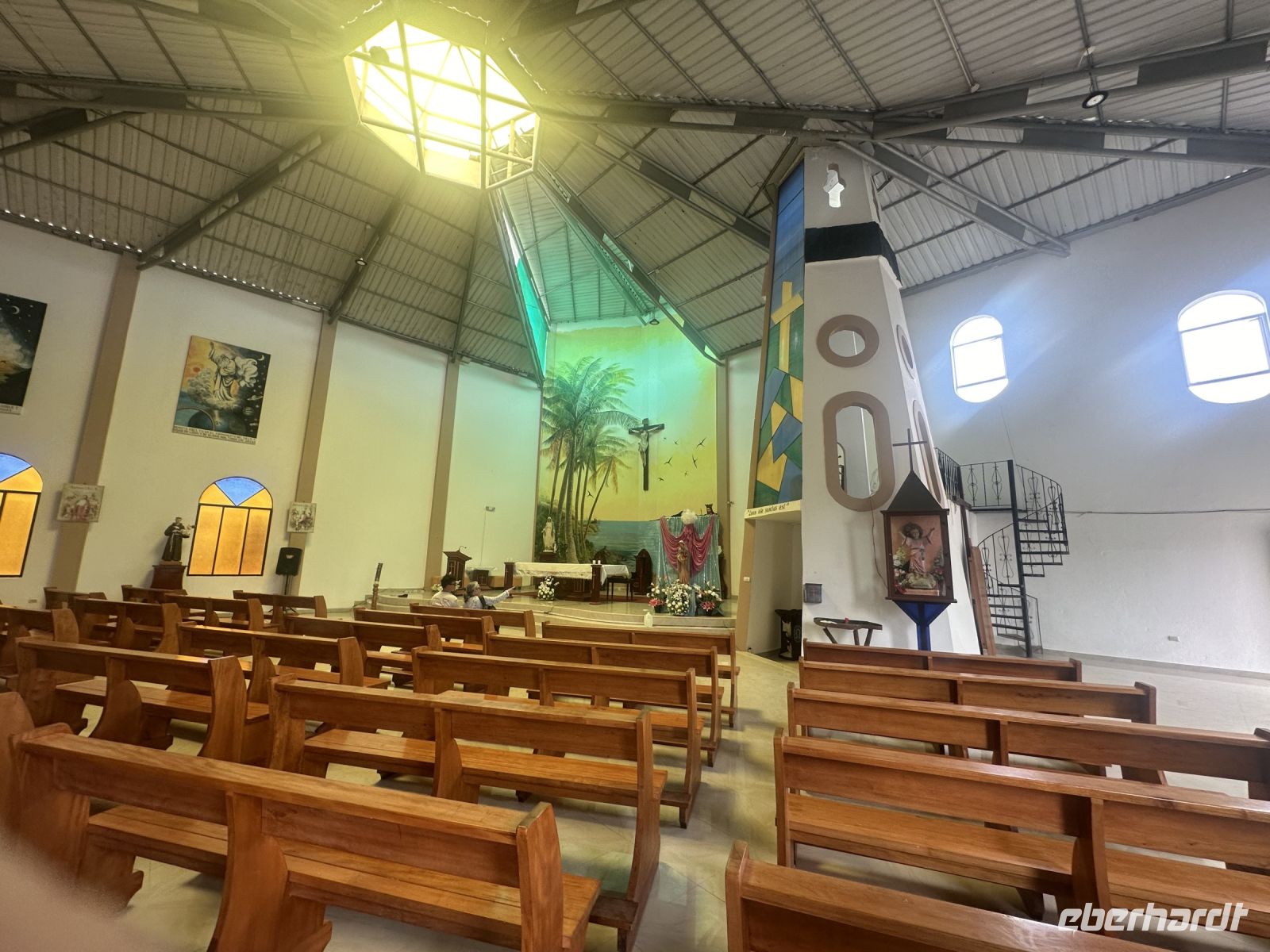 Es ist Sonntag und in der Kirche von Hanga Roa findet ein Gottesdienst statt. Um diesen besuchen zu können, haben wir unser offizielles Programm um eine Stunde nach hinten verschoben. Um neun Uhr geht es los. Es wird gepredigt, aber auch gesungen. Die Texte der Lieder werden an die Stirnwand projiziert, so dass sogar wir die Texte mit verfolgen können. Begleitet wird der Gesang von Einwohnern mit Gitarre und Trommel. Am Ende reichen sich alle die Hände, umarmen sich und sprechen sich gegenseitig gute Wünsche aus. Nach dem Gottesdienst wollen wir ein Gruppenfoto vor der schönen Kirche machen. Wir schnappen uns den nächstbesten Mann, drücken ihm ein Handy in die Hand und lassen uns ablichten. Erst später erfahren wir, dass es sich bei dem hilfsbereiten Einwohner um den Chef des Nationalparks handelt. Naja – Dankeschön nochmal.