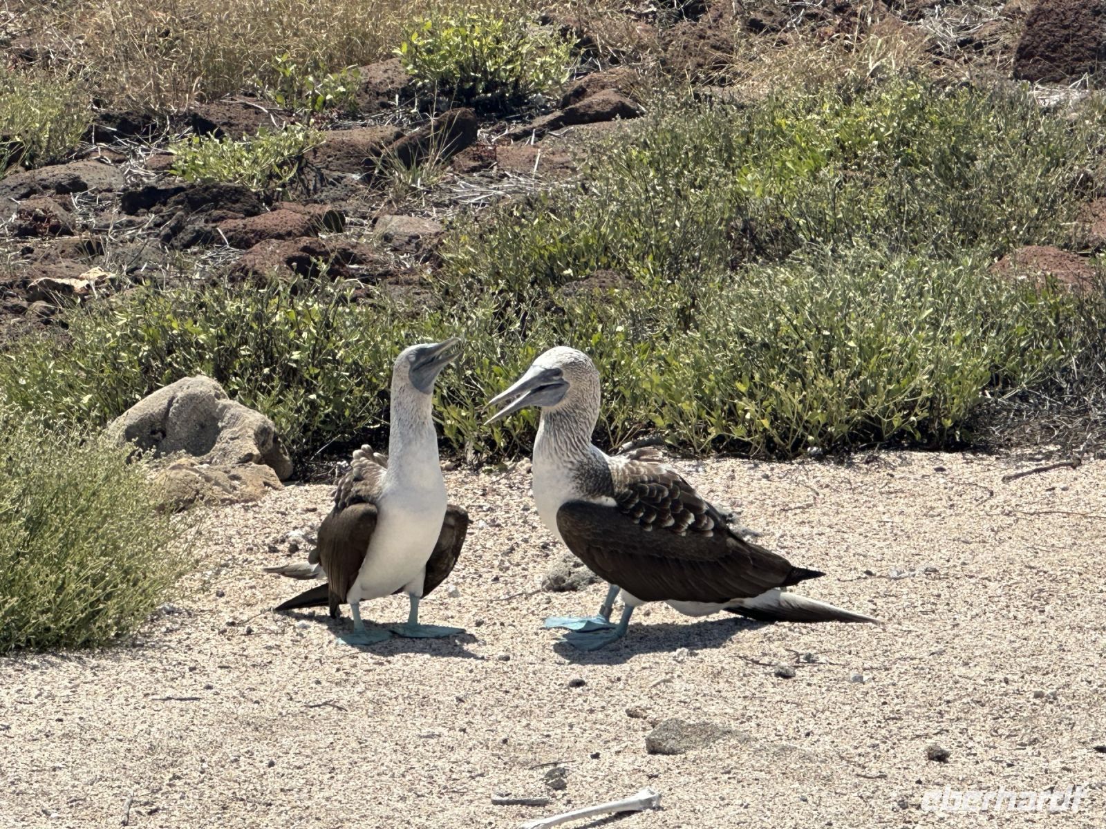 Was kann es Schöneres geben als Frühstück mit Meerblick? Ich sag’s euch: Frühstück mit Meerblick, vorbeifliegenden Pelikanen und Blick auf Meeresechsen. Und wo gibt es das? Im Frühstücksrestaurant des Hotels Sol Y Mar auf Santa Cruz. Wunderbar, wunderbar! Ich kann gar nicht genug schwärmen. Mit dem Schlauchboot setzen wir über zu unserem Ausflugsboot. Vor unseren Augen stürzt sich eine Gruppe von etwa fünfzig Blaufußtölpeln pfeilschnell ins Wasser. Unser Ziel ist heute die Insel Nord Seymur. Am Ufer sitzt friedlich ein Gabelschwanzmöwenpaar. Ihr Gefieder ist schwarz und grau. Die Augen haben einen orangenen Rand, der Schnabel ist Spitz und vorne blau. Über uns kreisen Fregattvogelmännchen mit dicken roten Kehlsäcken, gefolgt von einem Blaufußtölpel. Ach, und da kommt noch ein Pelikan geflogen. Bald erreichen wir Seymur Norte. Es erwarten uns große Kolonien von Blaufußtölpeln und Fregattvögeln. Es gibt so viele hier und wir können sie aus nächster Nähe beobachten. Die Blaufußtölpel machen ihrem Namen alle Ehre und zeigen uns ihre schönen blauen Füße. Die Fregattvogelmännchen blasen ihre Kehlsäcke auf und rufen nach ihren Damen. Zwischen den Büschen verstecken sich Landleguane. Nach dem Spaziergang wird an Bord aufgetischt. Die Tische bekommen weiße Tischdecken und am Buffet gibt es eine reiche Auswahl an Speisen. Vornehm geht es heute zu.