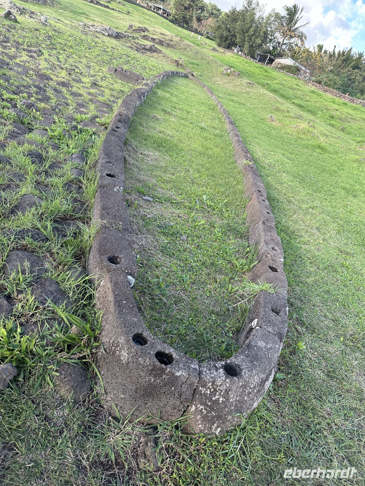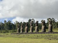 Am Flughafen erwartet uns Davide, der uns in den nächsten Tagen auf der Osterinsel begleiten wird. Er trägt einen Blumenschmuck auf dem Kopf und hat für uns „Leis“ dabei. Ein Lei ist ein Blumenkranz, der die Gastfreundschaft und das Willkommen in polynesischen Kulturen symbolisiert. Wir fahren zum Hotel O’tai und beziehen unsere großen, komfortabel eingerichteten Zimmer in einem großzügig angelegten Garten. Am Nachmittag unternehmen wir einen ersten Ausflug. Wir sind sehr gespannt, wann wir unseren ersten Moai sehen werden. Wir besuchen Puna Pau, einen kleinen Vulkan, an dem die charakteristischen roten Pukao-Steine hergestellt wurden, die als Kopfbedeckungen auf vielen Moai-Statuen zu finden sind. Diese Steine bestehen aus rotem Tuffstein, der nur hier vorkommt. In Puna Pau haben wir eine beeindruckende Aussicht auf die umliegende Landschaft und das Meer. Weiter geht es zum Ahu a Kivi, einer bedeutenden archäologische Stätte mit sieben Moai-Statuen. Die Statuen blicken in Richtung des Pazifischen Ozeans, was untypisch ist, da die meisten Moai landeinwärts schauen. Ahu Akivi soll laut Legenden die sieben Entdecker der Insel darstellen, die von König Hotu Matu'a gesandt wurden. Die Stätte wird oft mit astronomischen Ausrichtungen in Verbindung gebracht, da die Moai während der Tagundnachtgleichen auf den Sonnenaufgang ausgerichtet sind. Unser nächstes Ziel ist der Ahu Ko Te Riku, eine bedeutende Zeremonialplattform auf der Osterinsel und Teil des Tahai-Zeremonialkomplexes in der Nähe von Hanga Roa. Diese Plattform zeichnet sich durch ihre einzigartigen Merkmale unter den vielen Ahu (Plattformen) und Moai (Statuen) der Insel aus. Hier steht ein einzelner Moai, der etwa fünf Meter hoch ist. Er ist der einzige Moai auf der Osterinsel, dessen Augen rekonstruiert wurden. Sie bestehen aus weißen Korallen und Obsidian und sollten der Statue spirituelle Kraft verleihen, die den Stamm schützen sollte. Dieser Moai trägt auch einen Pukao, einen Haarknoten aus rotem Tuffstein, der entweder einen Hut oder einen Haarknoten darstellen soll. Auf unserem weiteren Weg besichtigen wir einen prähistorischen Hühnerstall und das Fundament eines Hare Penga oder Bootshauses; Hare Penga werden die traditionellen Wohnstrukturen der Rapa Nui genannt. Die Häuser erhielten ihren Namen aufgrund ihrer Form, die an ein umgedrehtes Boot erinnert. Diese Bauweise bot einen Schutz vor dem starken Wind auf der Insel. Die Hare Penga bestehen aus Steinblöcken (paenga), die als Fundament dienen und einer Rahmenstruktur aus Holz, die ursprünglich mit Schilfrohr gedeckt war. Die meisten sind etwa 15 Meter lang. Die Häuser haben einen niedrigen Eingang und die Bewohner mussten quasi hineinkriechen. Später werden wir noch weitere Häuser sehen, die für Besucher rekonstruiert wurden.