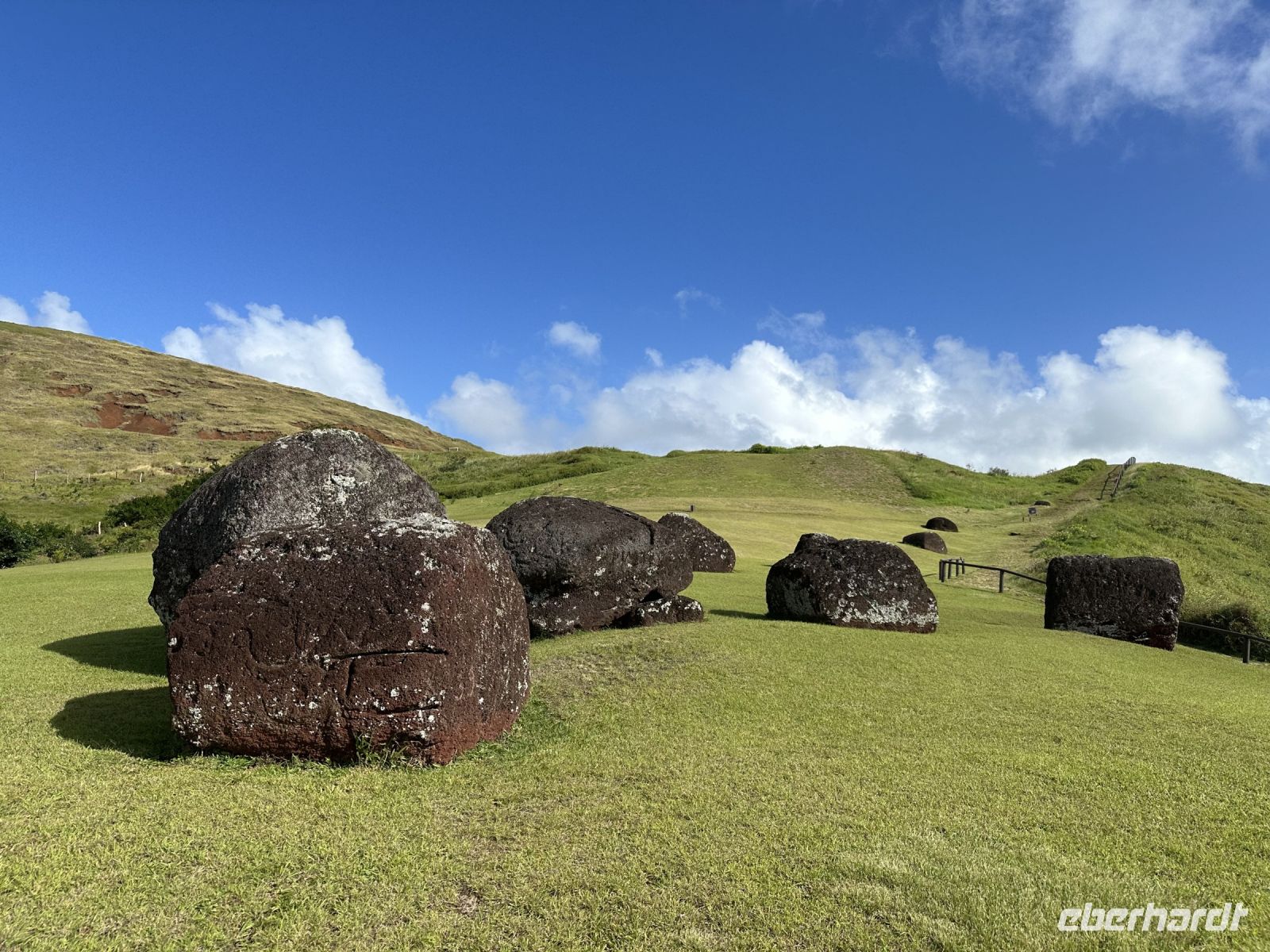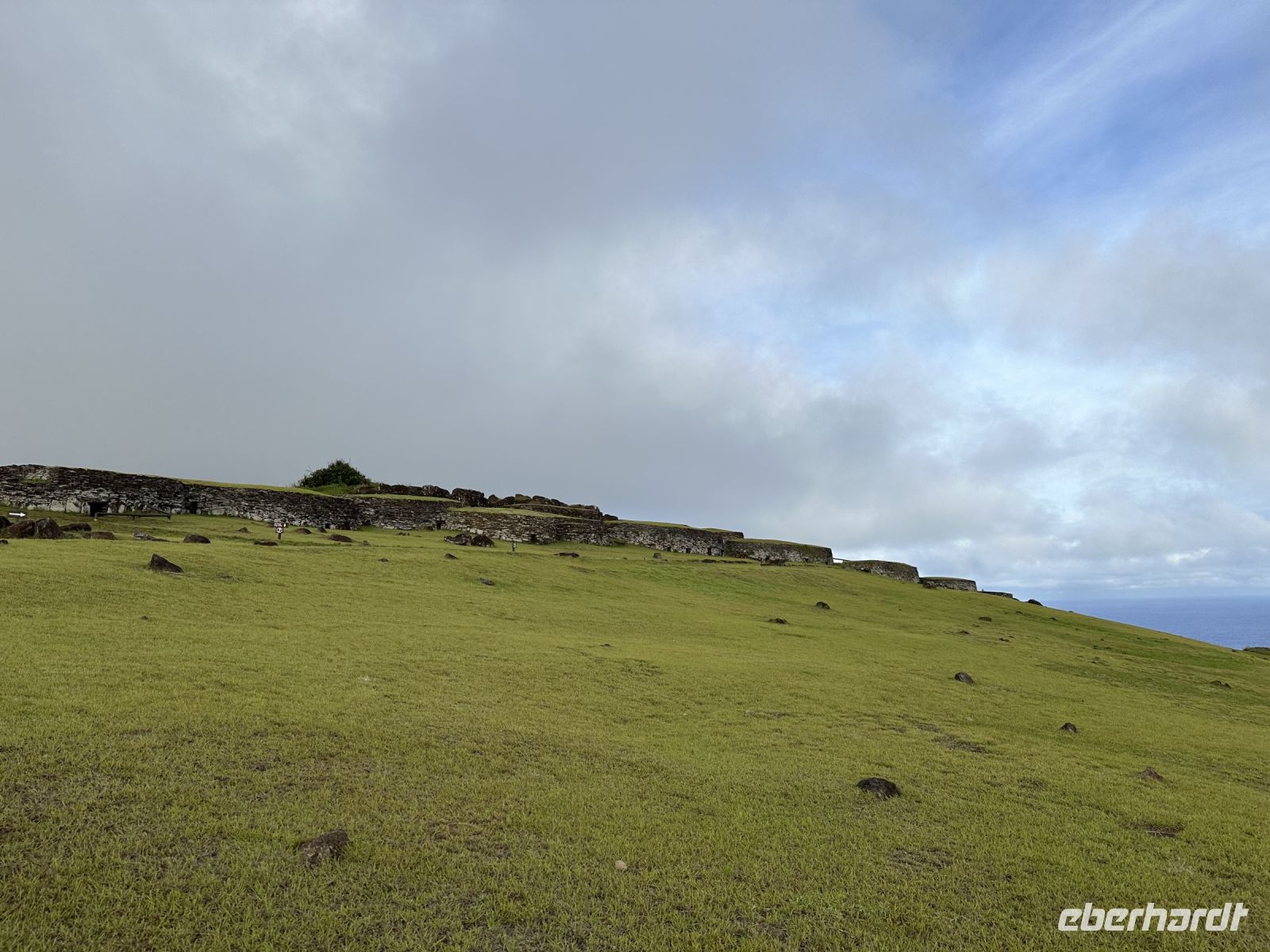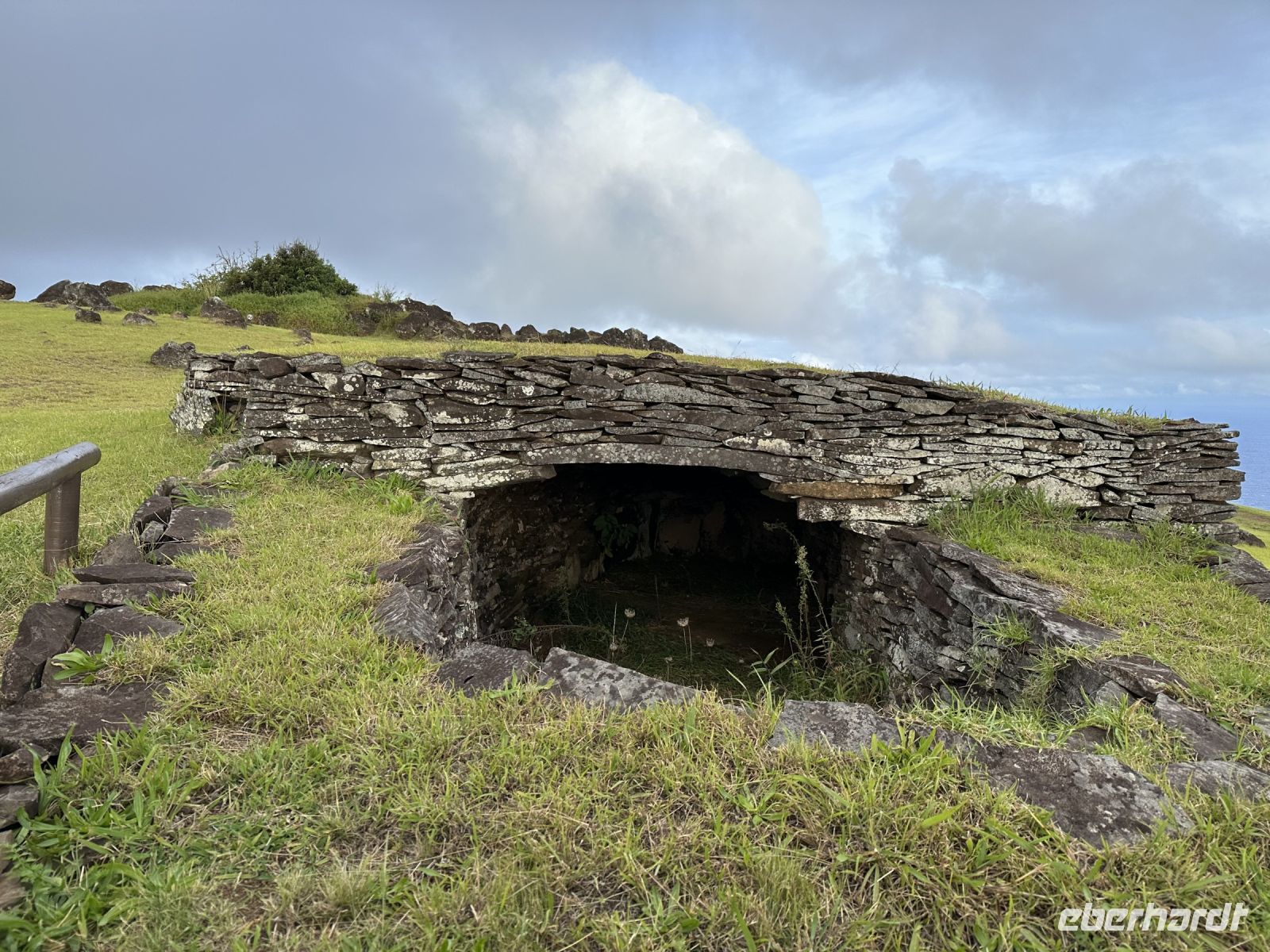 Nun besuchen wir Vai Hu. Hier besichtigen wir rekonstruierte Wohngebäude, einen prähistorischen Hühnerstall, sehen wie Pflanzen und Gemüse angebaut wurden und klettern in eine kleine Höhle. Auf unserem Spaziergang treffen wir immer wieder auf umgekippte Moais, die entweder noch auf ihren Ahus (Plattformen) liegen oder aber heruntergestoßen wurden. Auch ein paar Kopfbedeckungen aus Tuffstein liegen herum. Vai Hu liegt direkt am Meer und wir genießen den Blick auf die starke Brandung. Unser nächstes Ziel ist Rano Raraku, ein Steinbruch, in dem die Moais gefertigt wurden und der von heute auf morgen verlassen wurde. Überall liegen und stehen halbfertige Moais herum, einige halb aus dem Boden ragend, andere bereits vollständig herausgearbeitet. Die meisten Moai sind in verschiedenen Stadien der Fertigstellung, einige sind noch roh und unfertig, während andere bereits verziert und poliert sind. Das Gelände ist von einem erloschenen Vulkan umgeben, es geht stetig bergauf und dann wieder hinunter. Wir sehen die Überreste der Steinbrucharbeiten, die darauf hindeuten, wie die antiken Rapanui diese massiven Statuen aus dem Fels gehauen haben. Es ist schwer vorstellbar, wie sie es geschafft haben, diese riesigen Steine ohne moderne Technologie zu bearbeiten und zu transportieren. Etwa eine Stunde dauert diese Besichtigung, anschließend wird uns in einer provisorisch eingerichteten Hütte ein schmackhaftes Mittagessen serviert.
