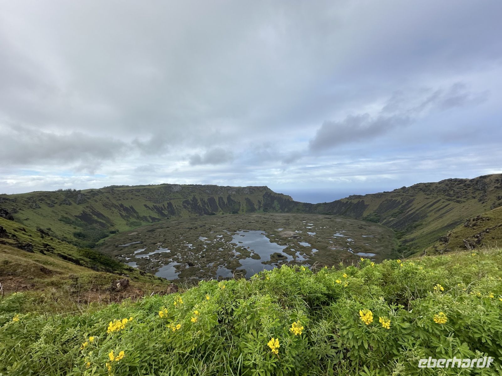 Unser Ausflug beginnt um 9.30 Uhr. Das heißt, wir haben Zeit für ein gemütliches Frühstück. Am Vormittag steht der Besuch von Vinapu auf dem Programm. Vinapu ist ein bedeutendes archäologisches Gelände auf der Osterinsel, das für seine präzisen Steinmauern bekannt ist. Früher dachte man hier an südamerikanische Einflüsse, denn die Steine sind so exakt zusammengefügt, wie man es von den Inka-Bauten kennt. Der Ahu Vinapu besteht aus drei Plattformen, deren Moai während der Auseinandersetzungen im 18. Und 19. Jahrhundert umgestürzt wurden. Unser Weg führt uns nun zum Vulkankrater Rano Kau. Der Krater ist etwas mehr als dreihundert Meter hoch und hat einen Durchmesser von etwa 1,6 Kilometern. Er ist mit Süßwasser gefüllt, das die Rapa Nui früher für ganz praktische Dinge verwendeten, wie zum Beispiel zum Wäsche waschen. In der Nähe des Rano Kau befindet sich die Orongo-Zeremonialstätte, die vom Kult des Vogelmenschen erzählt. Diese ist heute allerdings geschlossen, weil der Wind zu stark ist. Wir warten etwas ab, manchmal wird der Besuch dann doch gestattet, wenn der Wind nachlässt. Dem ist allerdings nicht so und wir müssen auf den Besuch heute verzichten.