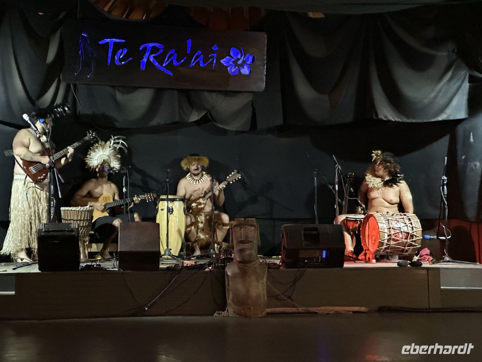 Am Abend sind wir zu einer polynesischen Show eingeladen. Mit einem Bus werden wir vom Hotel abgeholt und fahren zum Restaurant Te Ra’ai. Eine Dame im Vogelmantel empfängt uns. Sie wird später auch durch die Show führen. Wir bekommen ein Begrüßungsgetränk und können uns mit traditionellen Kopfbedeckungen schmücken, unsere Gesichter werden am Eingang bemalt. Der erste Akt besteht in der Öffnung des „umu“. So wird der Erdofen genannt, in dem nach traditioneller Weise Speisen in einem mit heißen Steinen gefüllten Loch im Boden gegart werden. Die Zeremonie beginnt mit einem rituellen Gesang, das die Bedeutung des Essens und die Verbindung zur Natur und zur Kultur der Rapa Nui würdigt. Dann wird der Erdofen vorsichtig geöffnet und ein köstlicher Duft von gegartem Essen verbreitet sich. Die Speisen, die im Erdofen zubereitet werden, umfassen lokale Zutaten wie Fisch, Huhn, Schweinefleisch und Süßkartoffeln. Sie werden in Bananenblätter gewickelt, um das Aroma zu bewahren und die Feuchtigkeit zu halten. Nachdem der Erdofen geöffnet wurde, nehmen wir im Restaurant Platz und bedienen uns am reichhaltigen Buffet. Es folgt eine atemberaubende Tanzshow mit energiegeladenen jungen Männern und Frauen in traditionellen Kostümen. Jeder Tanz erzählt eine Geschichte, sei es über die Natur, die Götter oder das tägliche Leben der Menschen in den Inseln des Südpazifiks. Tief beeindruckt kehren wir in unser Hotel zurück.