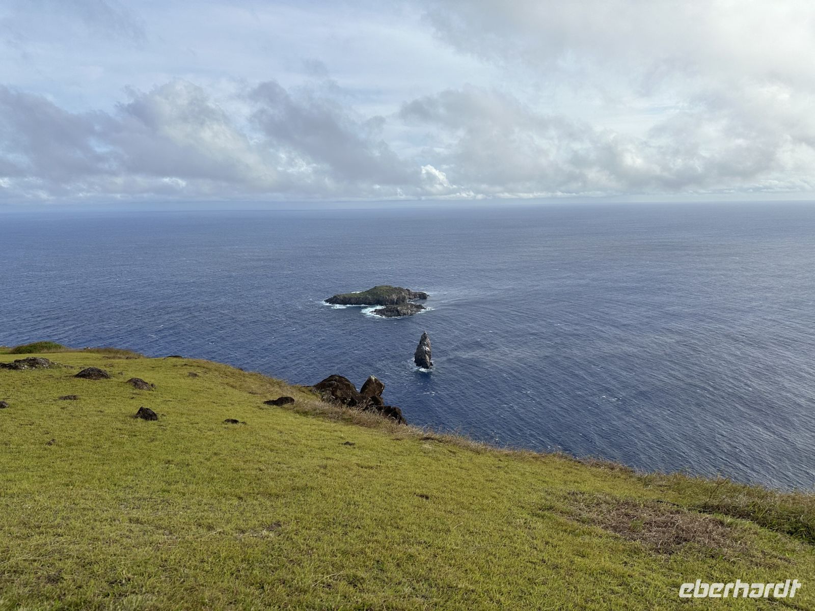 Unser nächstes Ziel ist der Anakena Strand, an dem gebadet werden kann, wo sich aber auch ein Ahu mit Moais befindet. Wir halten unseren Besuch kürzer als geplant, denn wir wollen versuchen, Orono zu besuchen, wo es gestern zu windig war. Und tatsächlich haben wir Glück, heute dürfen wir die Anlage betreten. Im Mittelpunkt steht hier die Geschichte vom Vogelmannkult. Der Vogelmannkult, auch bekannt als der "Tangata manu" Kult, war eine faszinierende spirituelle Praxis auf der Osterinsel, die eng mit den Rapa Nui verbunden war. Diese Kultur, die zwischen dem 10. und 16. Jahrhundert florierte, war von einer einzigartigen Verehrung von Vogelmannsymbolen geprägt. Jedes Jahr fand ein Wettbewerb statt, um den neuen Vogelmann, oder "Tangata manu", zu bestimmen. Dieser Wettbewerb war ein zentrales Ereignis im sozialen und religiösen Leben der Rapa Nui. Das Ritual begann mit dem Sammeln von Sooty Tern-Eiern auf der nahegelegenen Insel Motu Nui, die als Brutstätte für diese Vögel diente. Wer Vogelmann werden wollte, bestimmte einen jungen Mann, der für ihn an dem Wettbewerb teilnahm. Diese ausgewählten Männer mussten vierhundert Meter hangabwärts klettern, durch ein von Haien wimmelndes Wasser zum Felsen Moto Nui schwimmen, den Felsen erklettern, die Eier einsammeln und dann versuchen, diese sicher zurück auf die Osterinsel zu bringen. Derjenige, der erfolgreich zurückkehrte, überbrachte seinem Paten das Ei und dieser, der Pate, wurde zum neuen Vogelmann ernannt und erhielt besondere spirituelle und soziale Macht. Der Vogelmann verkörperte eine Verbindung zwischen den Menschen und den Göttern und wurde als Vermittler zwischen den beiden Welten angesehen. Seine Ernennung hatte weitreichende Auswirkungen auf das soziale Gefüge der Osterinsel, da er für das Wohlergehen der Gemeinschaft verantwortlich war und in der Lage war, zwischen den Göttern und den Menschen zu vermitteln.