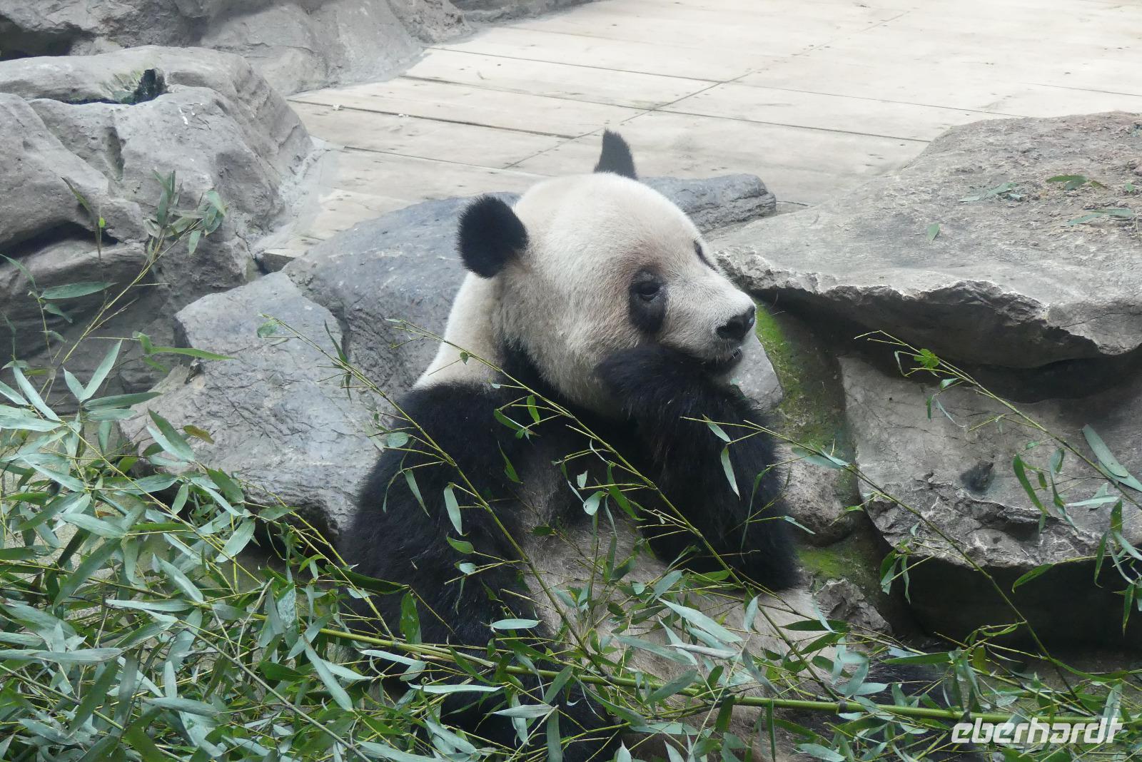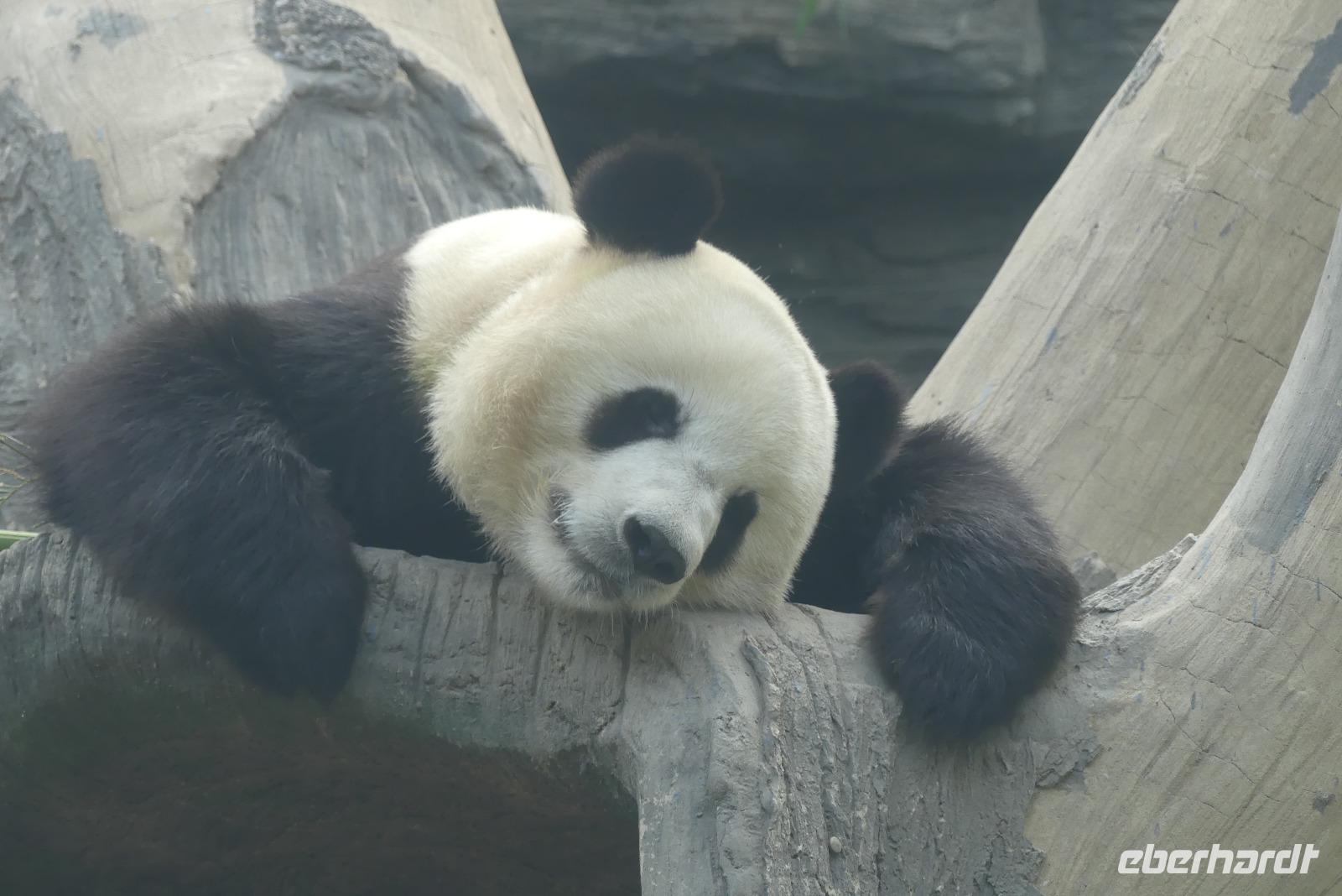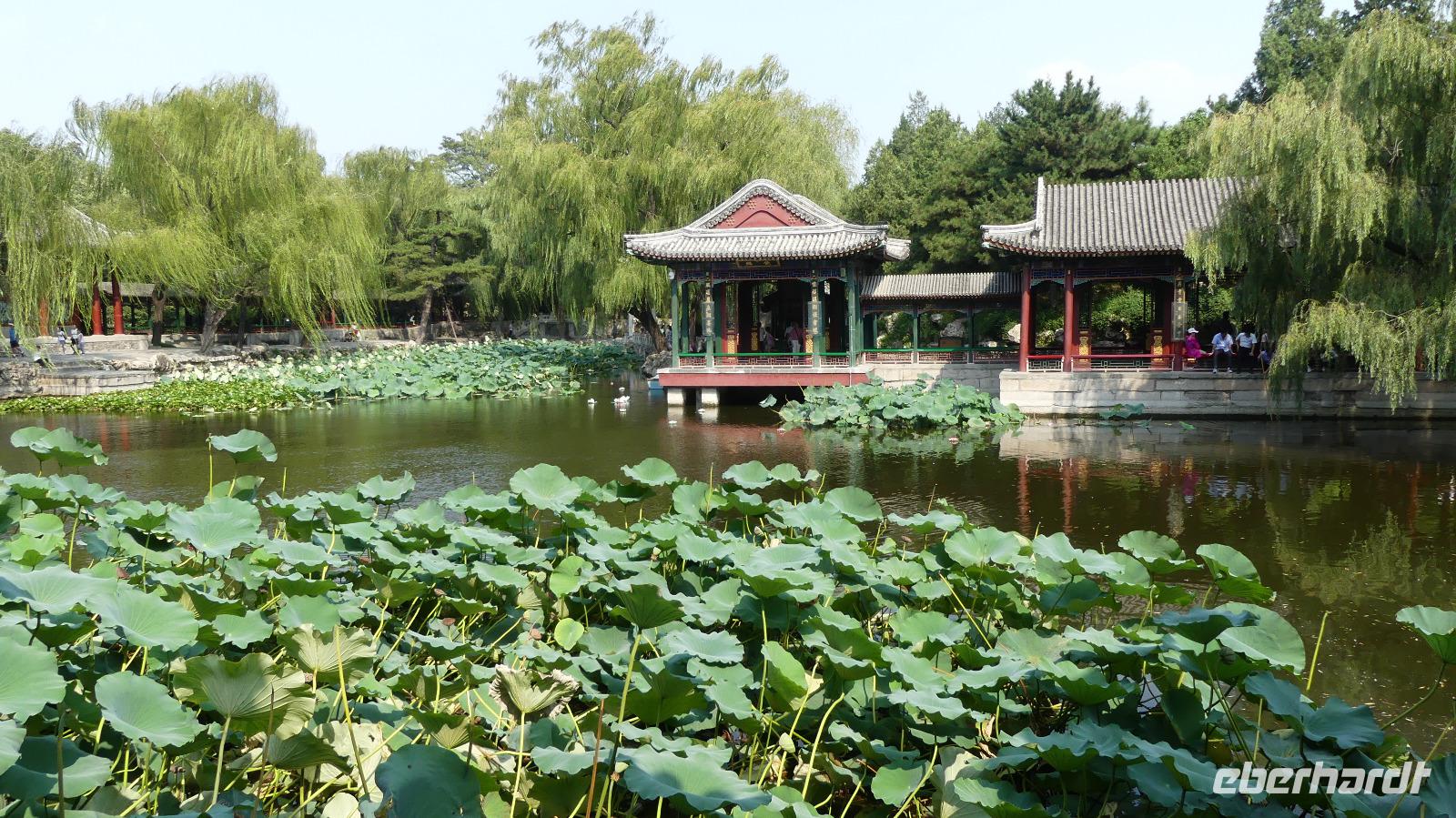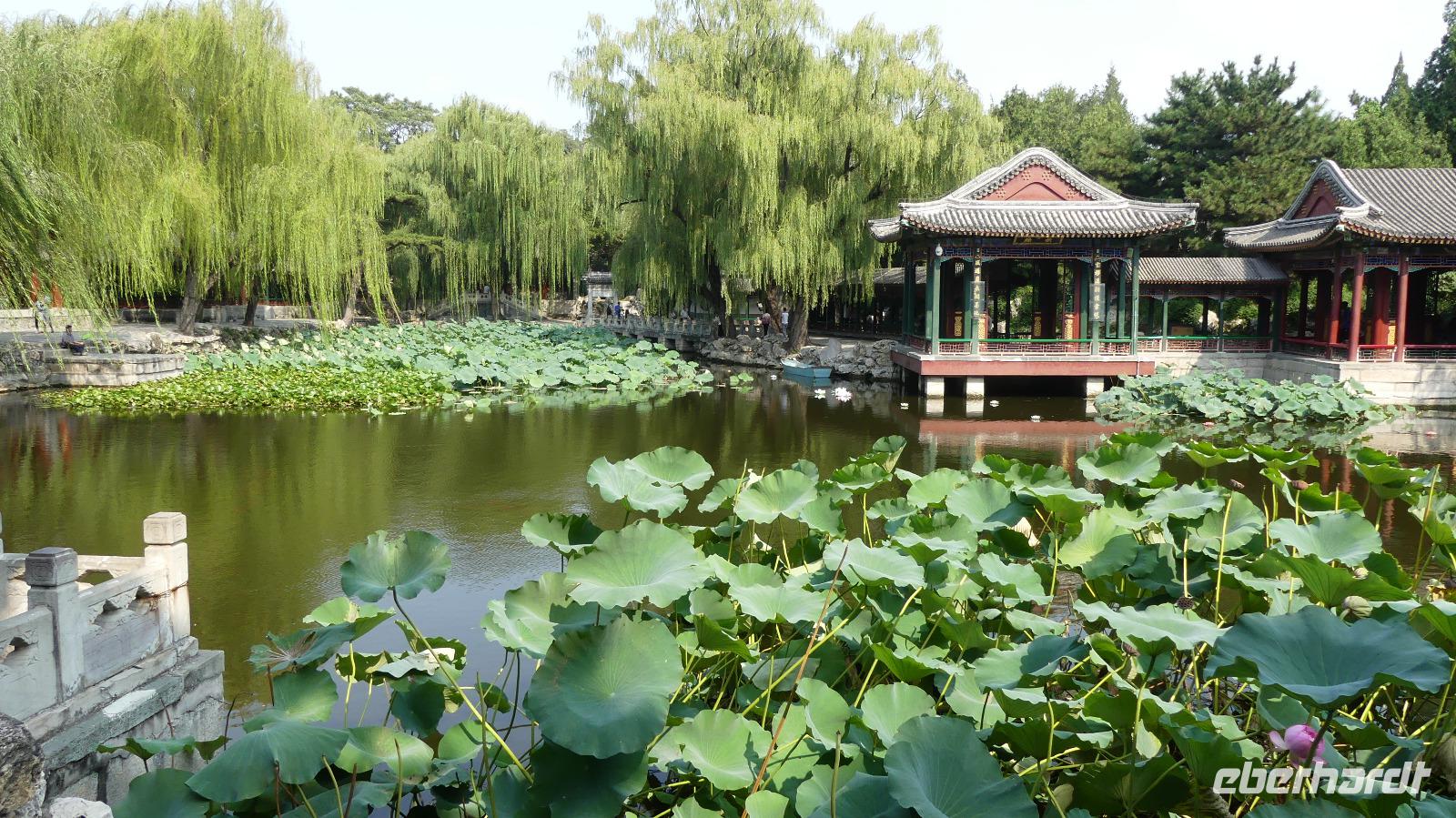 Gestärkt, aber auch etwas „benebelt" aufgrund der kurzen Nacht im Flieger besichtigen wir am Nachmittag den Sommerpalast. Bei dem etwas zweistündigen Rundgang durch die weitläufige Parkanlage sehen wir das berühmte Marmorschiff, die 17-Bogenbrücke, Lotusblumen, Palastgebäude....Auf dem Rückweg halten wir am zoologische Garten von Peking, weil wir hier die beste und wohl einzige Gelegenheit auf unserer Reise haben, Pandabären zu sehen. Wir beobachten in verschieden Gehegen 4 Pandabären, teils schlafen sie, andere sind gerade mit ihrer Lieblingsspeise Bambus beschäftigt.