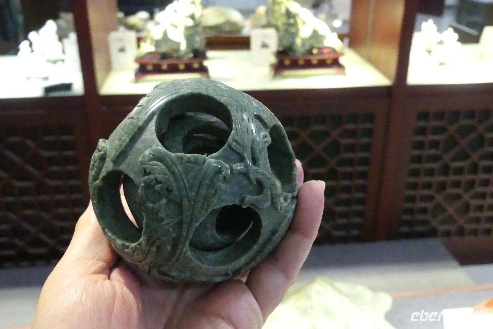 Bei sommerlichen Temperaturen reisen wir heute in den Norden von Peking. Lin gibt uns unterwegs einen kleinen Einführungskurs in die chinesische Sprache, so dass wir zumindest chinesisch „Guten Tag" und „Dankeschön" sagen können. Vor der ersten Besichtigung halten wir erstmal an einer Jade-Manufaktur. Ein typisches Produkt sind die Jadekugeln mit Phönix und Drachen. Die Kugeln gelten als Symbol für eine glückliche Ehe und bestehen aus mehreren ineinander liegenden Kugeln, gefertigt aus einem Stein.