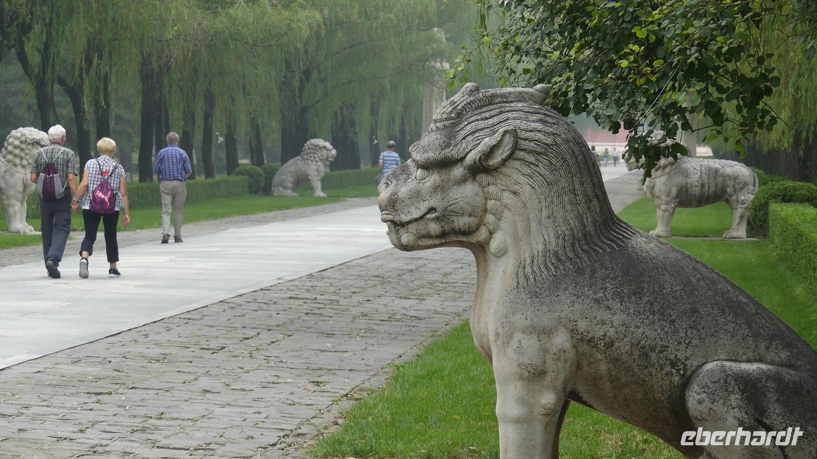 Am Grab des Mingkaisers Tang Ling besichtigen wir die Palastanlage, den oberen Teil des Grabes und den riesigen Kaiserpalast - original aus dem 16. Jhd. Etwas weiter führt uns Lin durch die Geisterallee, auch Heiligenallee genannt. Unter herabhängenden Weiden befinden sich steinerne Statuen von Kriegshelden und Tieren - Elefanten, Kamele, Löwen..., jeweils ein stehendes und ein sitzendes Paar. Die stehenden Tierpaare halten Wache, die sitzenden Tiere ruhen sich aus...und Mitternacht ist Wachwechsel.