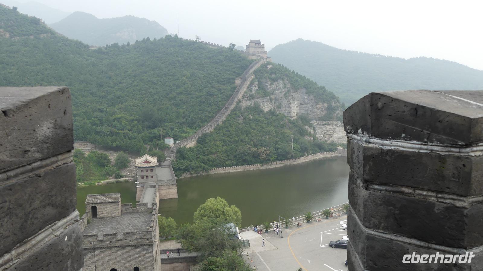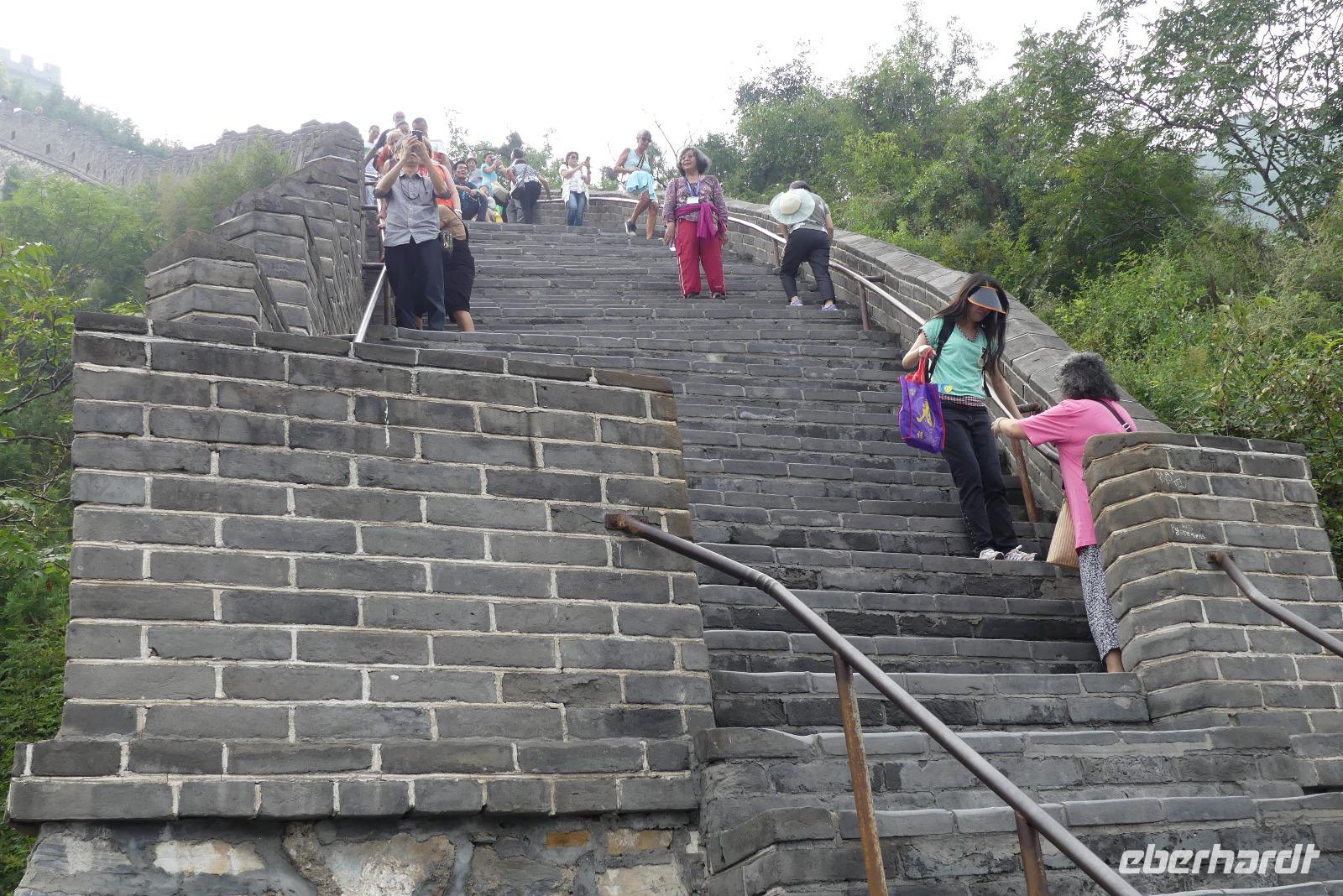 Etwas später kommen wir zur Großen Mauer, in diesem Fall eine ringförmige Verteidigungsanlage mit dem Namen „Juyongguang Great Wall", welche man in 4 bis 5 Stunden durchlaufen könnte. Uns genügen zwei Stunden völlig aus, um entweder die extrem steile Westseite oder die nicht ganz so schweißtreibende Ostseite der Mauer zu besichtigen. Da der Himmel leicht bewölkt und die Luft dunstig ist, sticht zumindest die Sonne nicht so erbarmungslos, allerdings ist die Sicht auch eingeschränkt. So hat jeder nach seinen Kräften und Wünschen die Große Mauer in Ruhe besichtigen können.