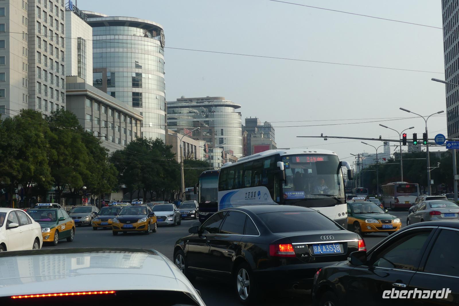 Nach kurzer Nacht mit sechs Stunden Zeitverschiebung landen wir am Morgen in Bejing, also Peking. Schneller als erwartet erfolgt die Einreise, eine reichliche Stunde nach der Landung haben wir unsere Koffer und finden auch sofort Lin, unsere Reiseleiterin. Auch das Wetter passt, es ist sommerlich warm und die Sichtverhältnisse sind gut. Vor dem Mittagessen können wir schon unsere Zimmer im Hotel beziehen und uns frisch machen. Für das Mittagessen hat Lin ein kleines Lokal um die Ecke ausgesucht. Hier machen wir unsere ersten Erfahrungen mit der chinesischen Küche und natürlich üben wir mit Stäbchen zu essen.