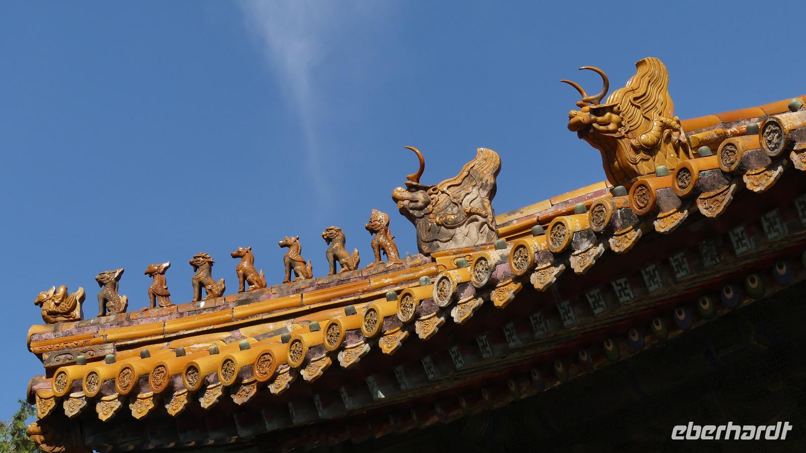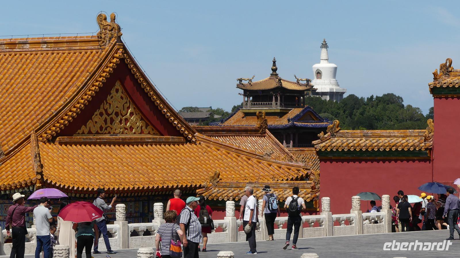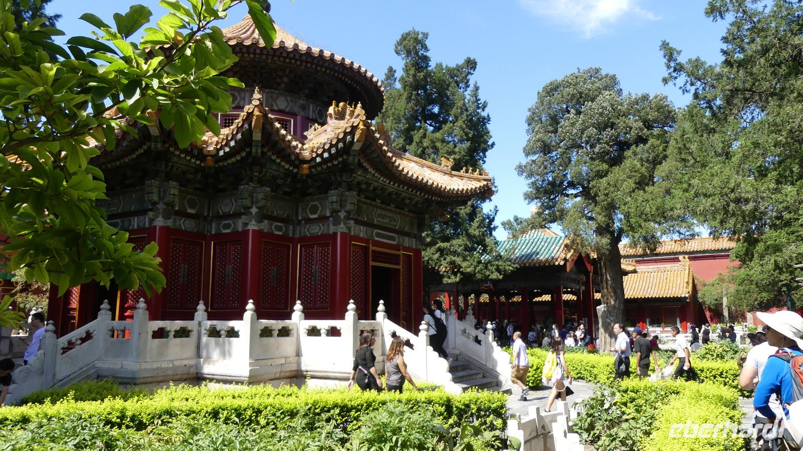 Zum Ende unseres Besuches in der Verbotenen Stadt werfen wir noch einen Blick in den kaiserlichen Garten mit wunderschönen Pavillons, künstlich angelegten Felsen, Blumenbeeten und schattenspenden Bäumen.